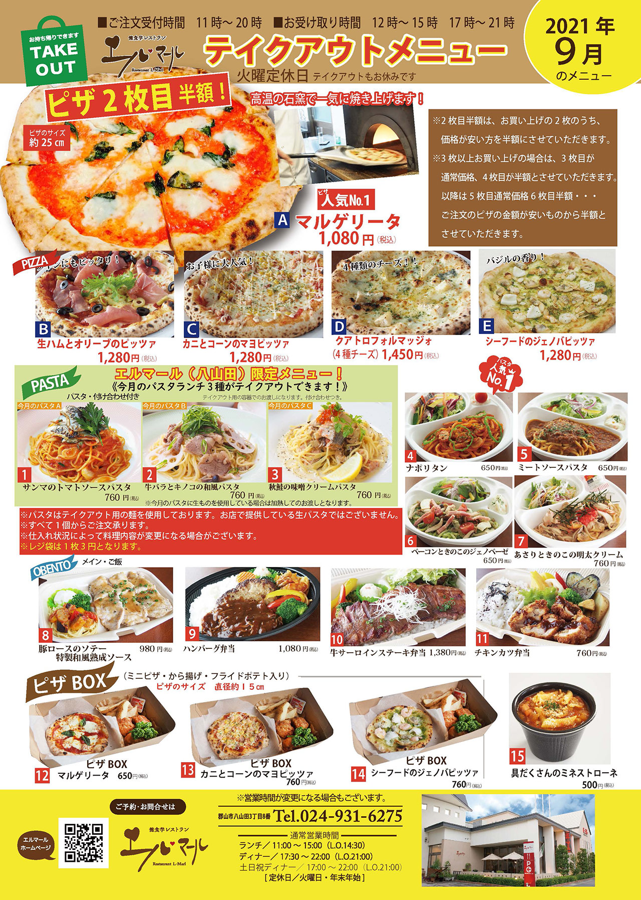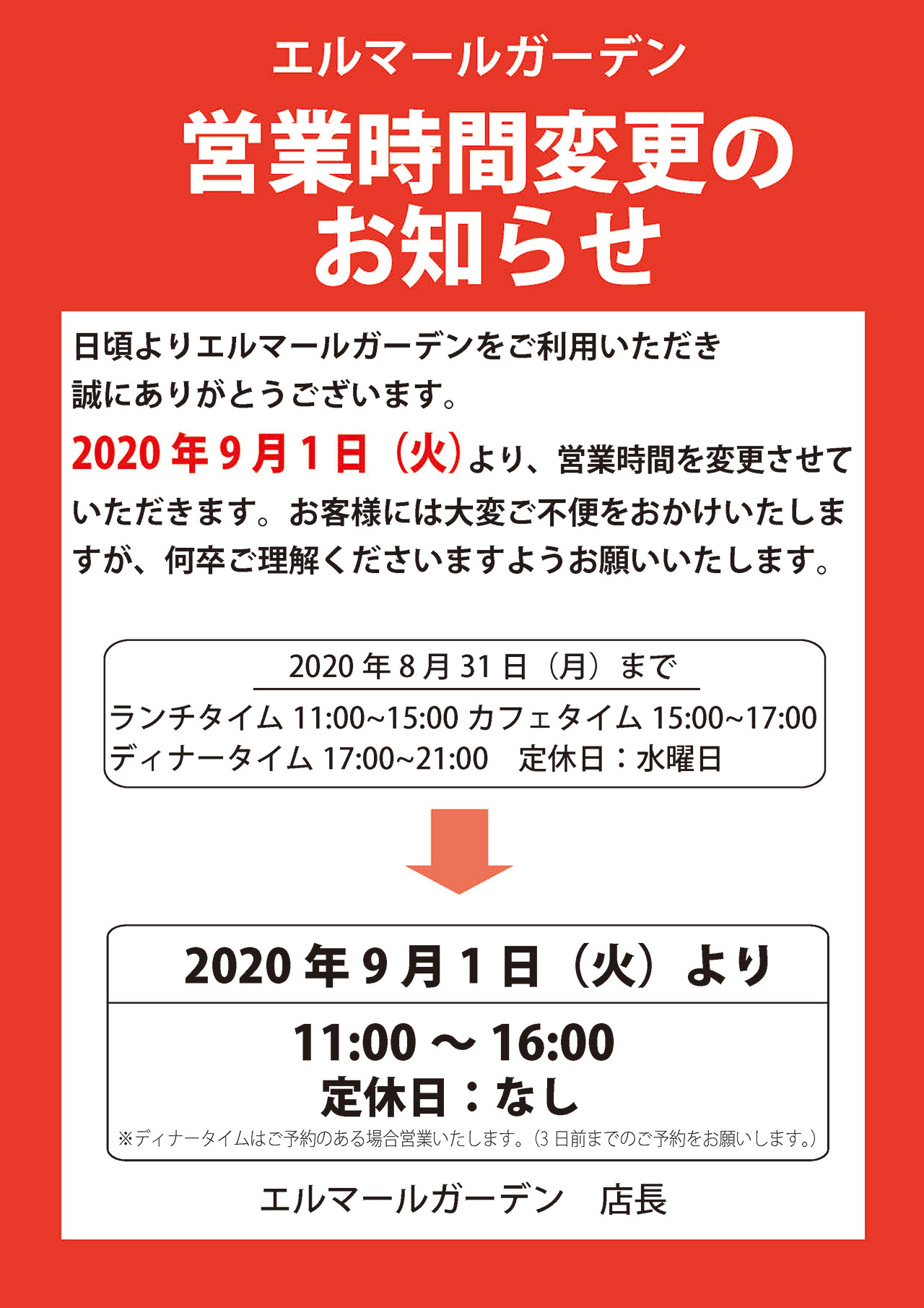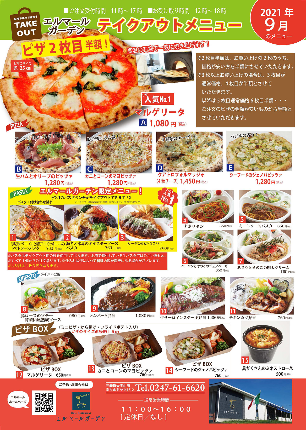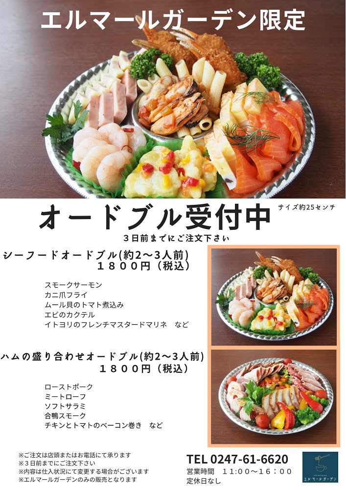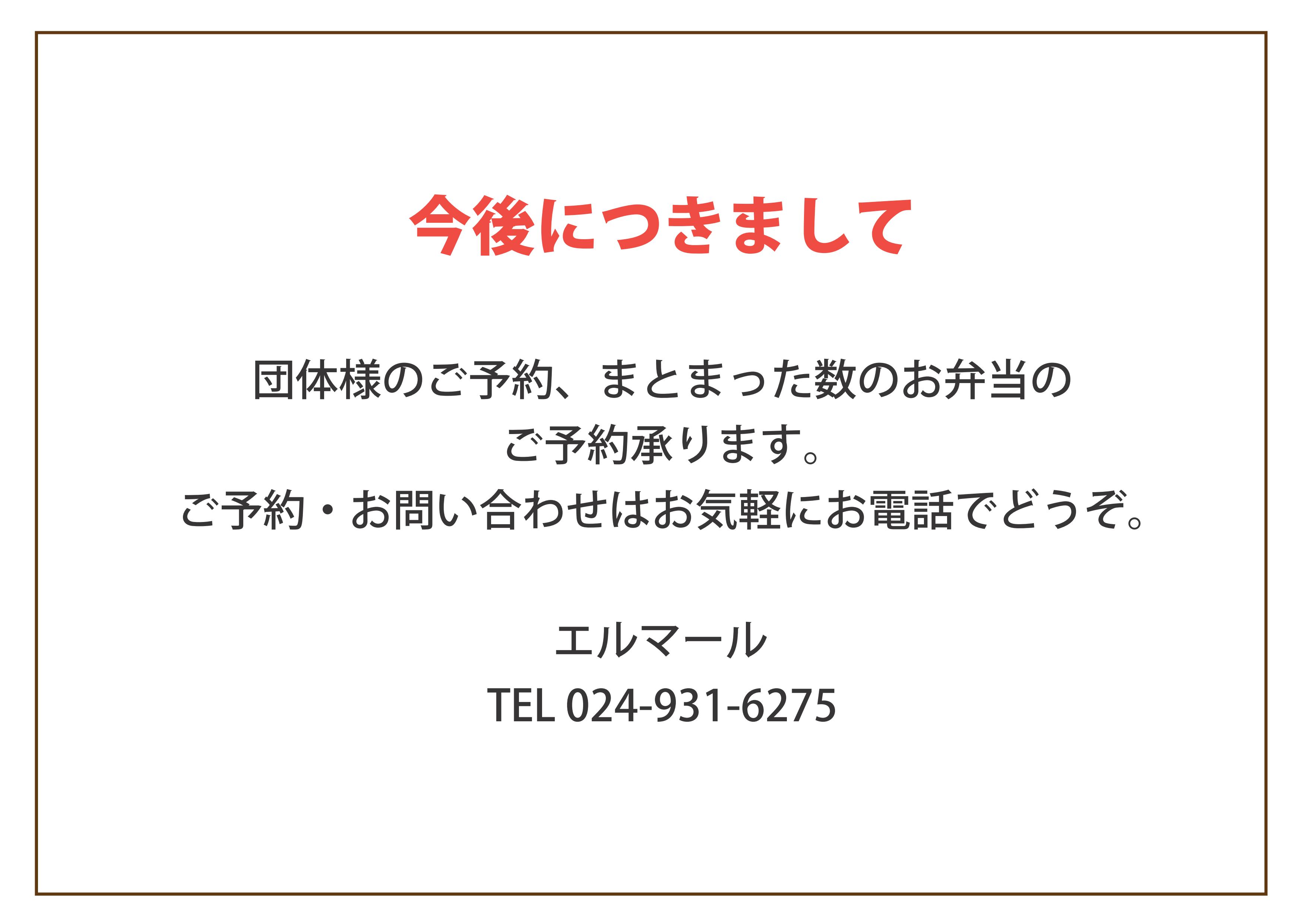 | 2025/9/9 | ★テイクアウトメニュー更新★ 【お持ち帰りできます】 【エルマール テイクアウトメニューはこちら】 | |