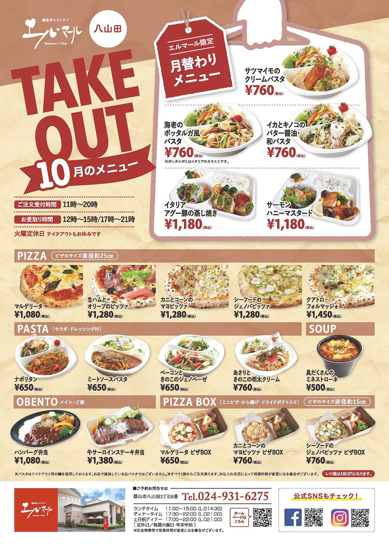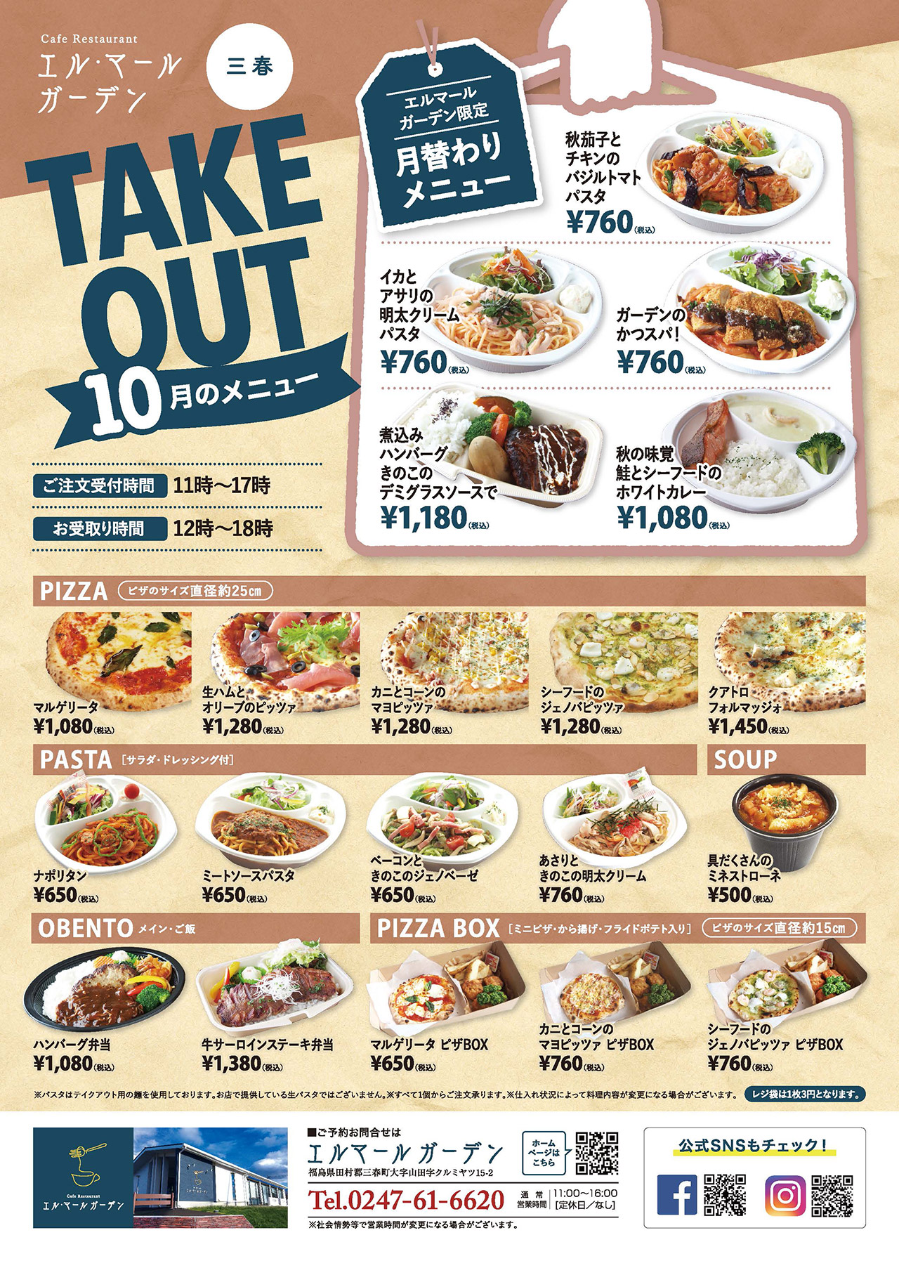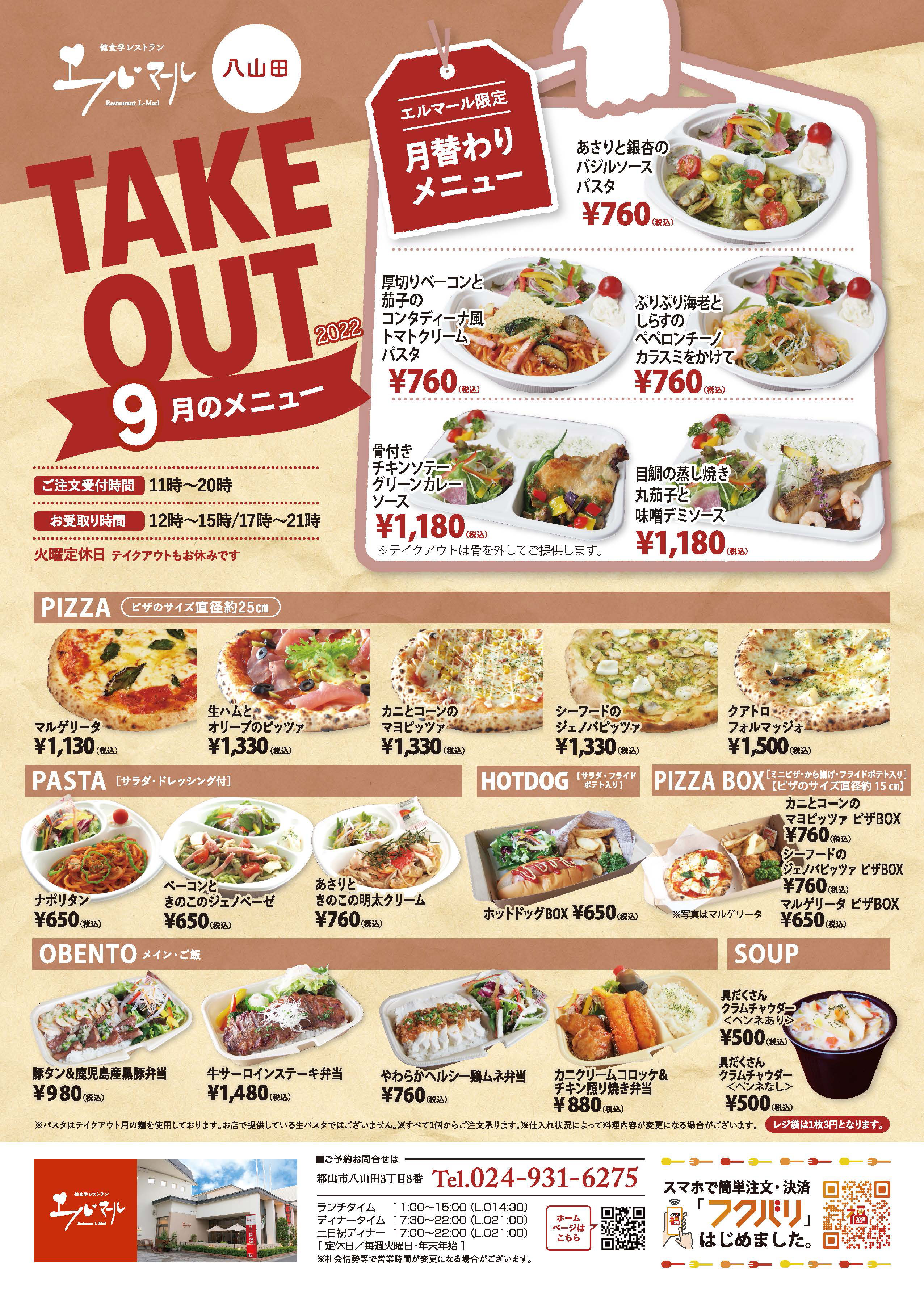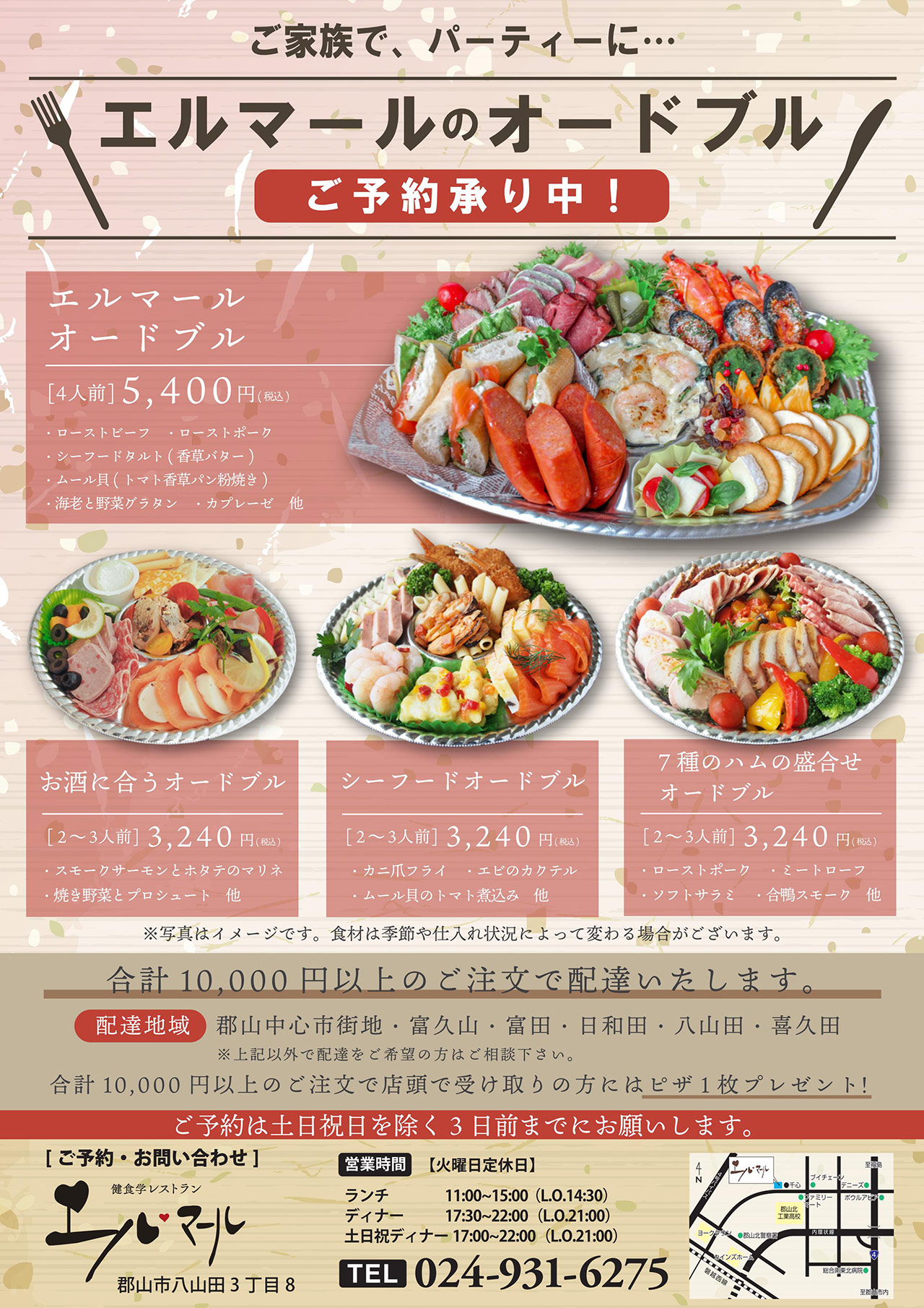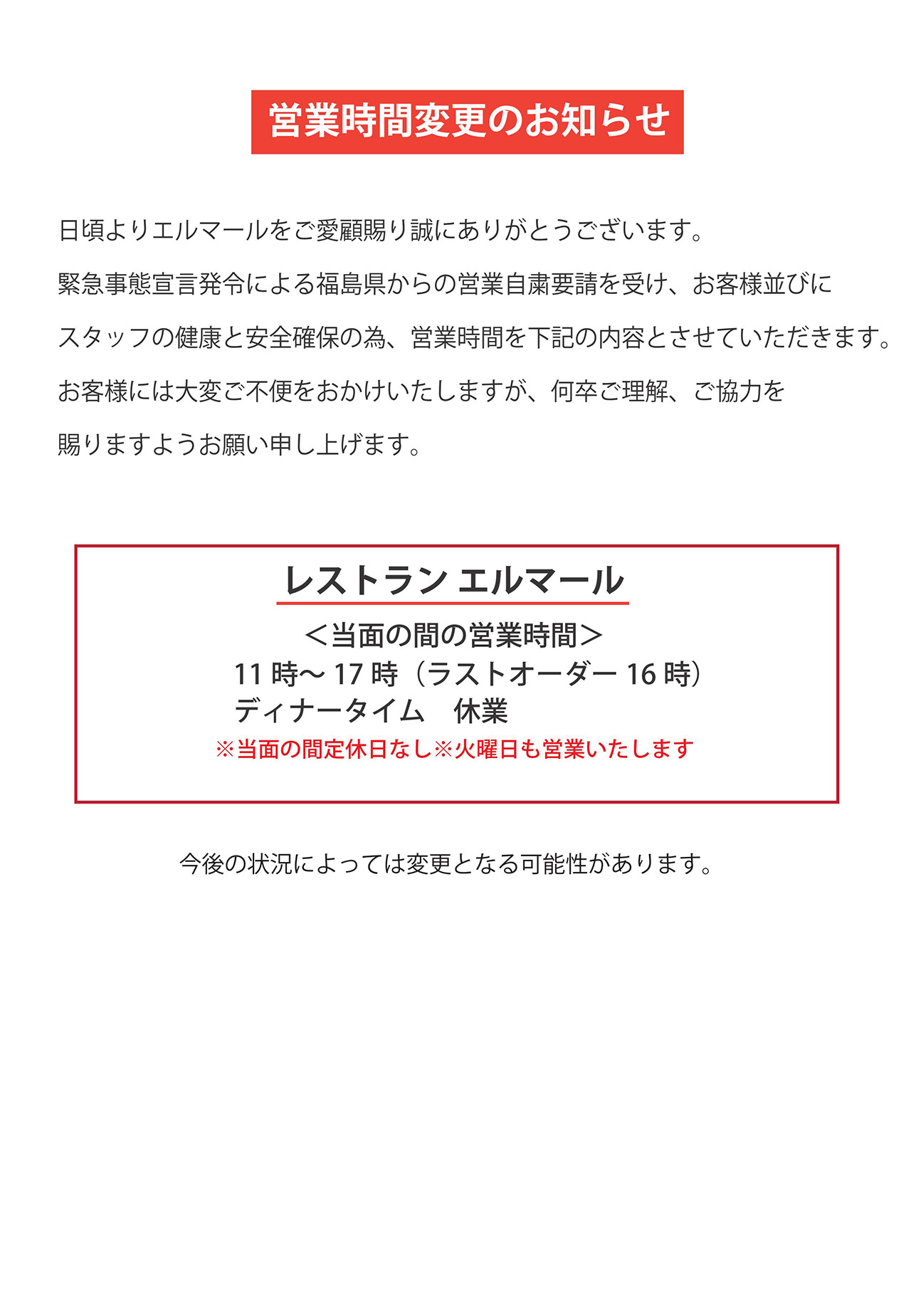 | 2025/9/9 | ★テイクアウトメニュー更新★ 【お持ち帰りできます】 【エルマール テイクアウトメニューはこちら】 | |