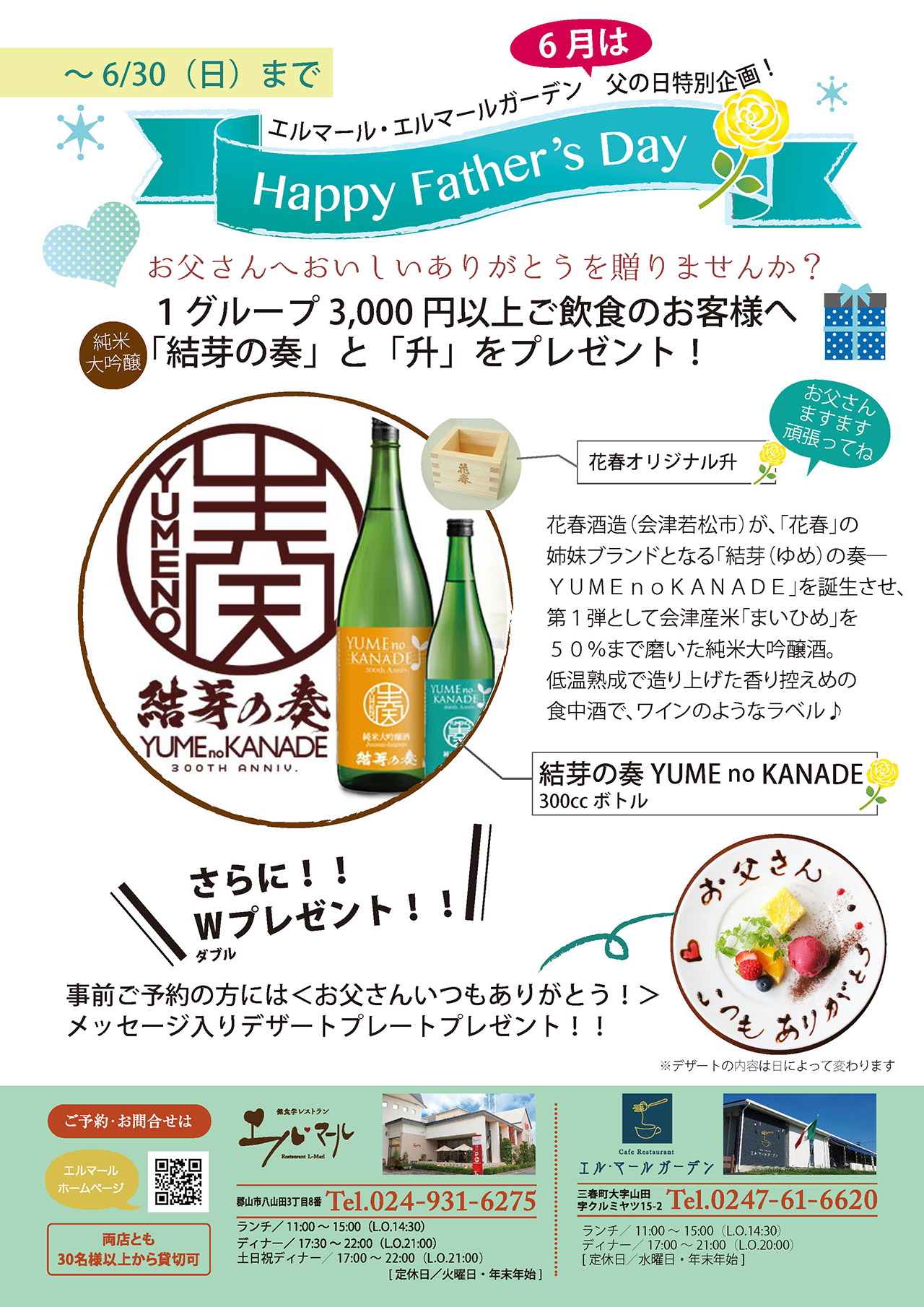 | 2019/6/11 | ★エルマール・エルマールガーデン 父の日特別企画!★ 1グループ3,000円以上ご飲食のお客様へ「結芽の奏」と「升」をプレゼント! | |