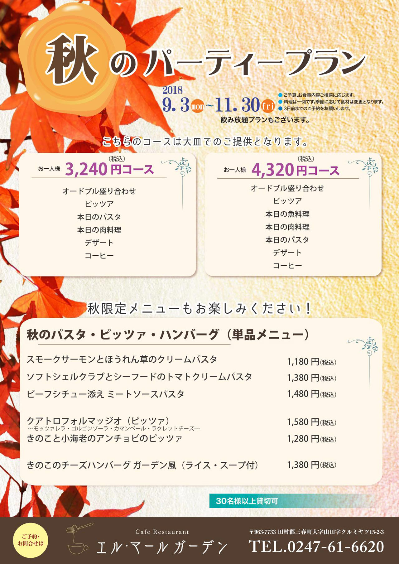 | 2018/9/5 | ★秋のパーティープラン★ 秋限定メニューもお楽しみください! | |