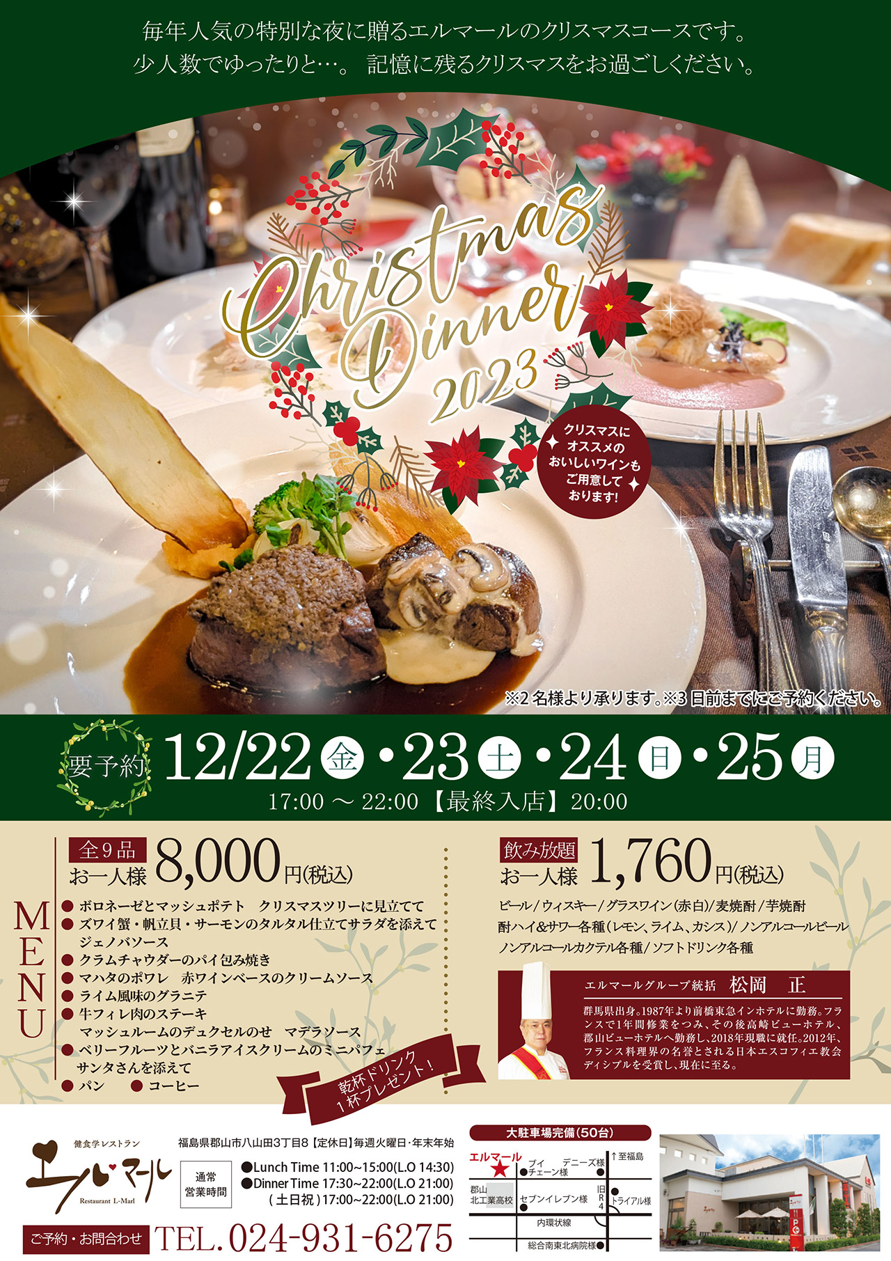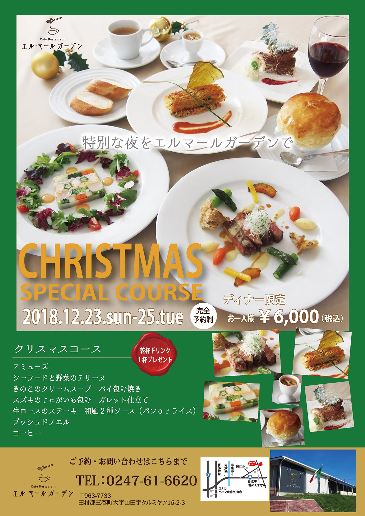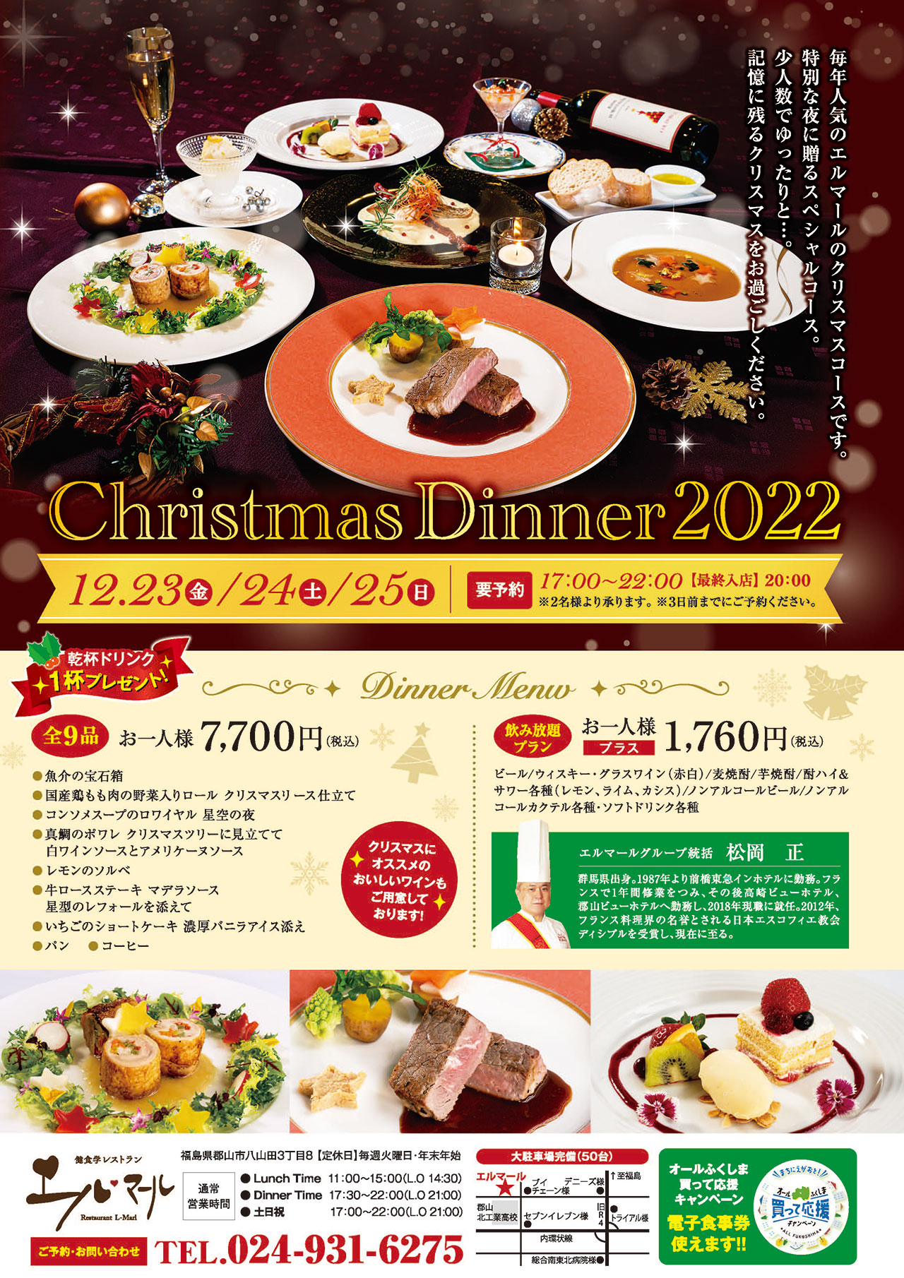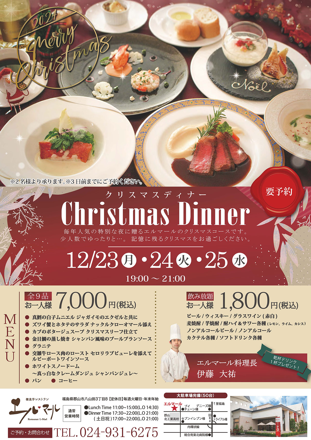 | 2024/12/5 | ★クリスマスディナー2024★ 毎年人気の特別な夜に贈るエルマールのクリスマスコースです。少人数でゆったりと・・・。記憶に残るクリスマスをお過ごしください。 | |