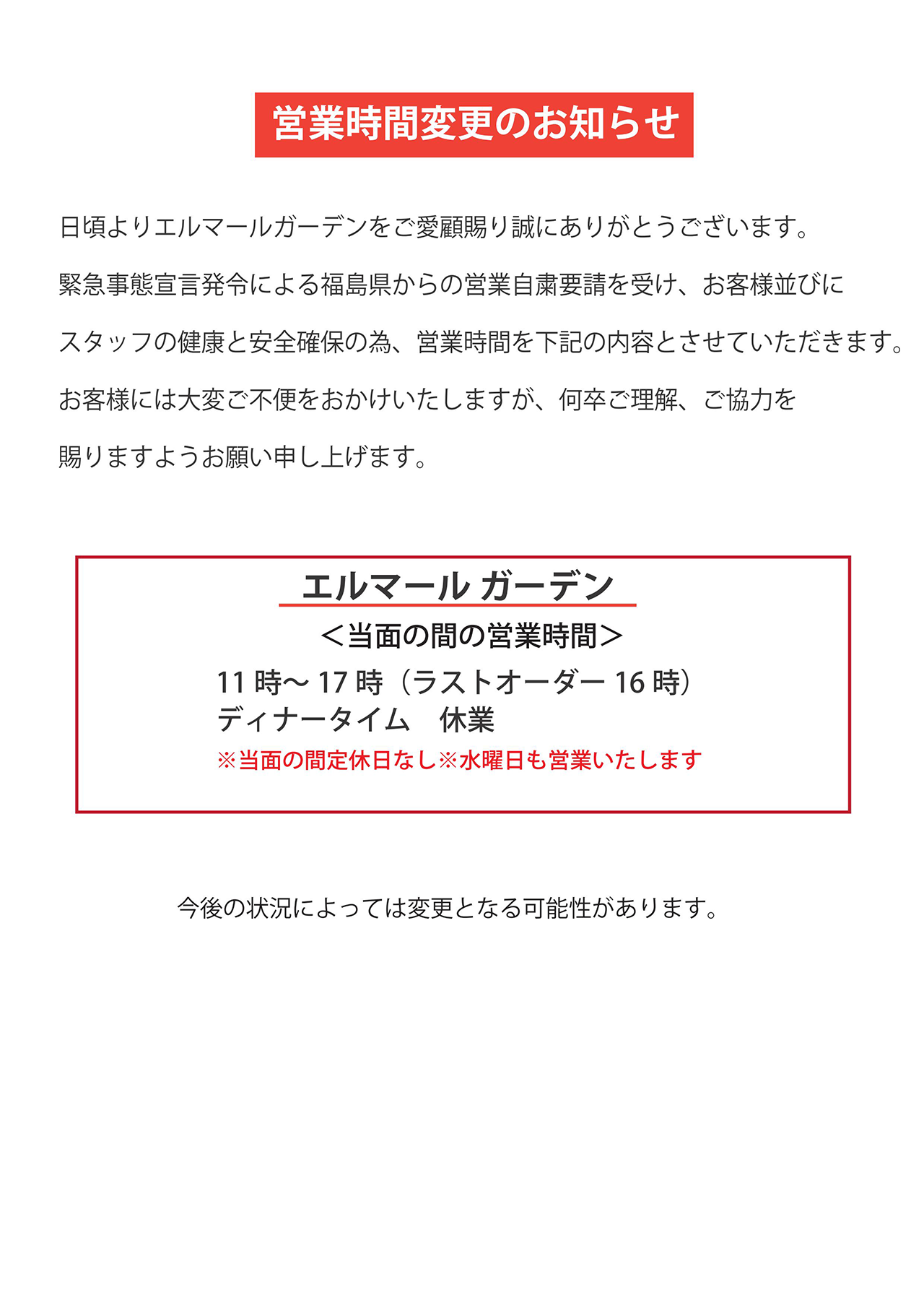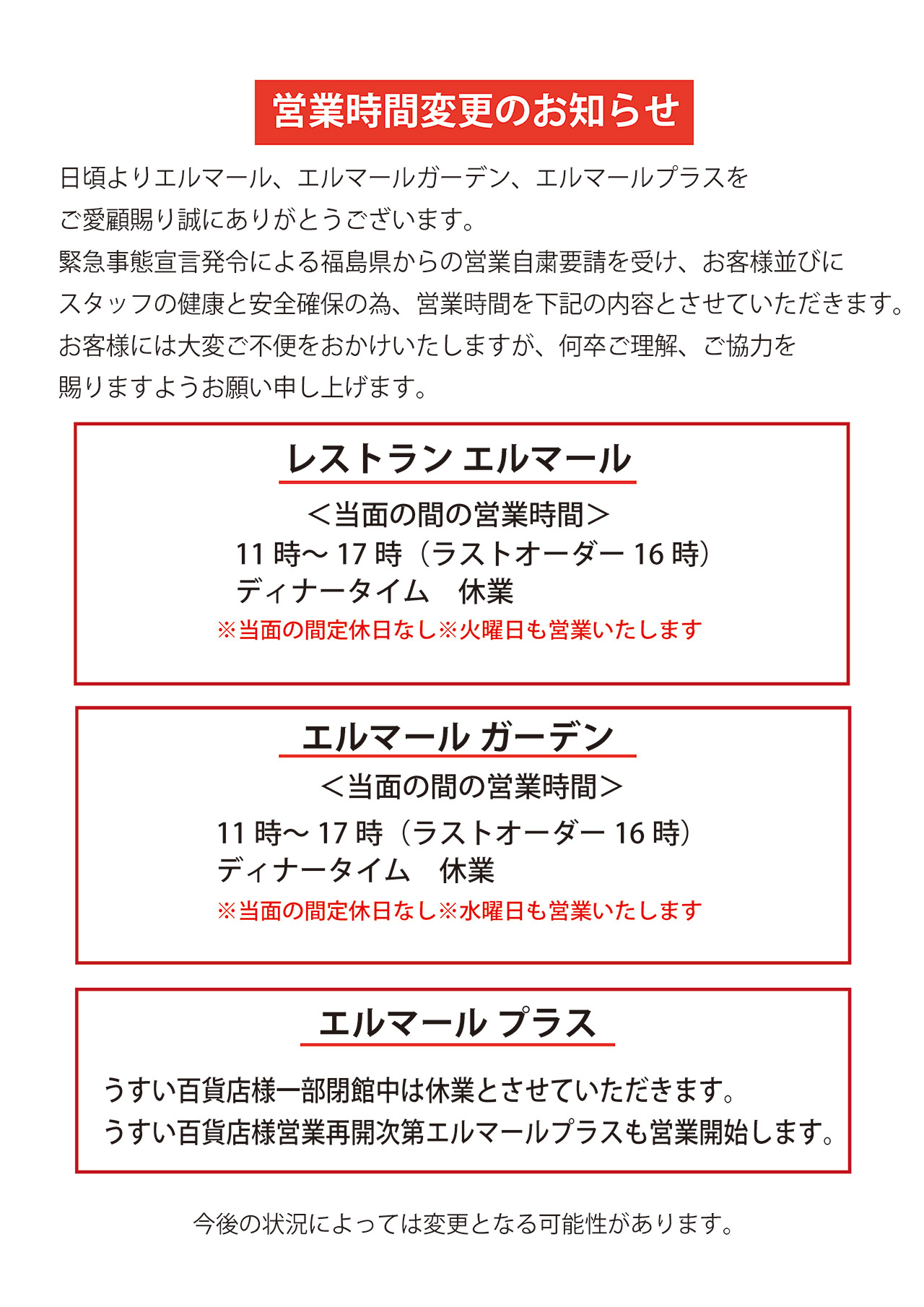 | 2019/1/29 | ★エルマール(八山田)臨時休業のお知らせ★ 1月30日(水)ディナータイムから2月7日(木)まで店内一部改修の為、お休みいたします。 2月8日(金)より営業再開いたします。 | |