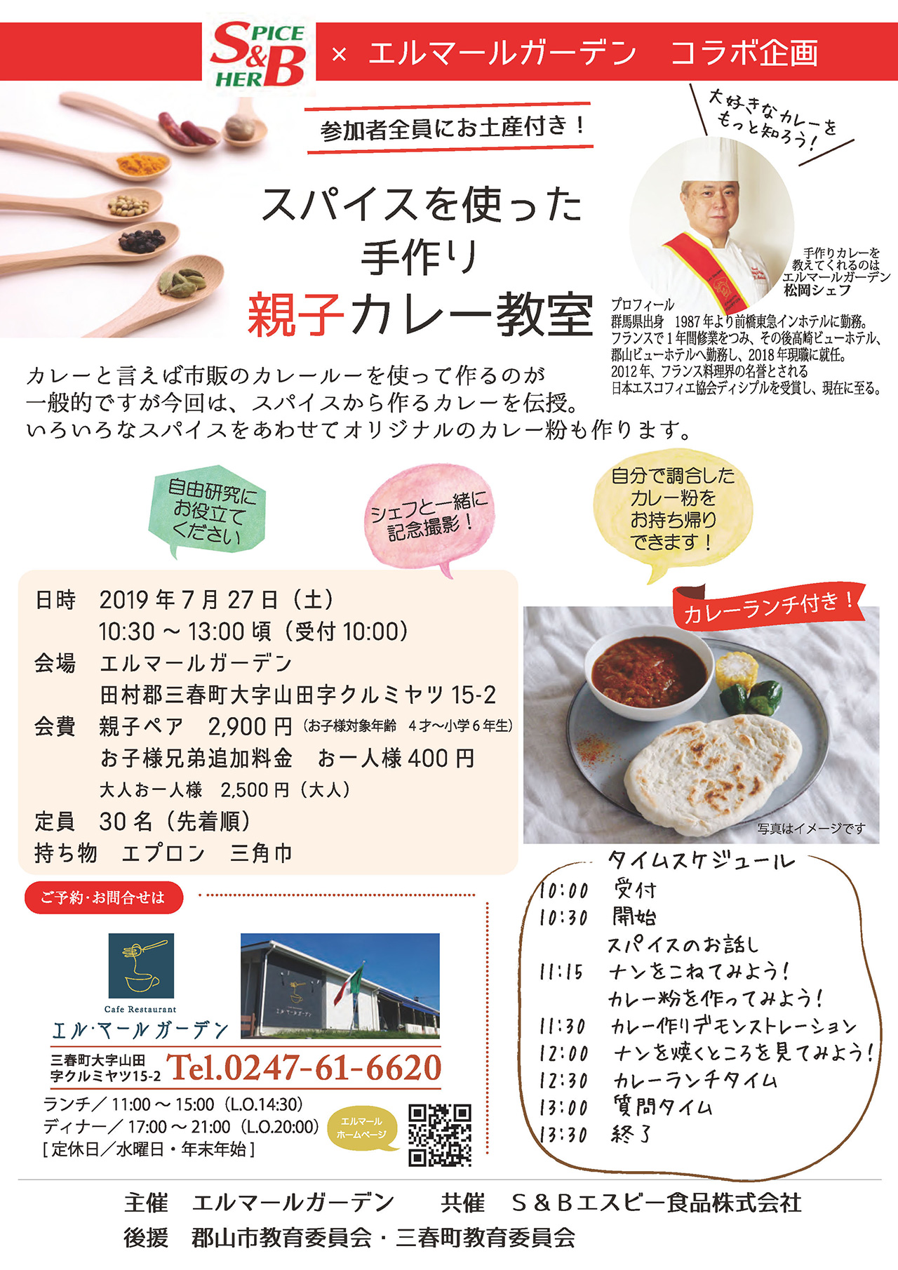 | 2019/7/16 | ★スパイスを使った手作りカレー教室★ S&B×エルマールガーデンコラボ企画 参加者全員にお土産付き! | |