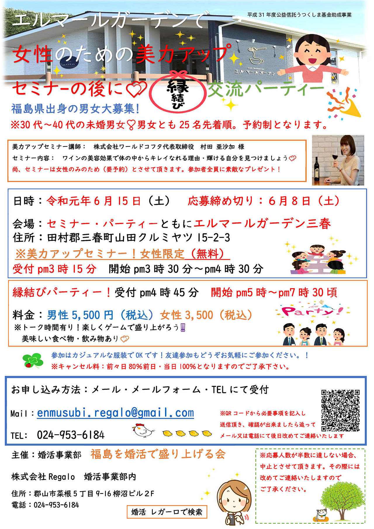 | 2019/5/7 | エルマールガーデン【女性のための美力アップ 縁結び交流パーティー】 | |