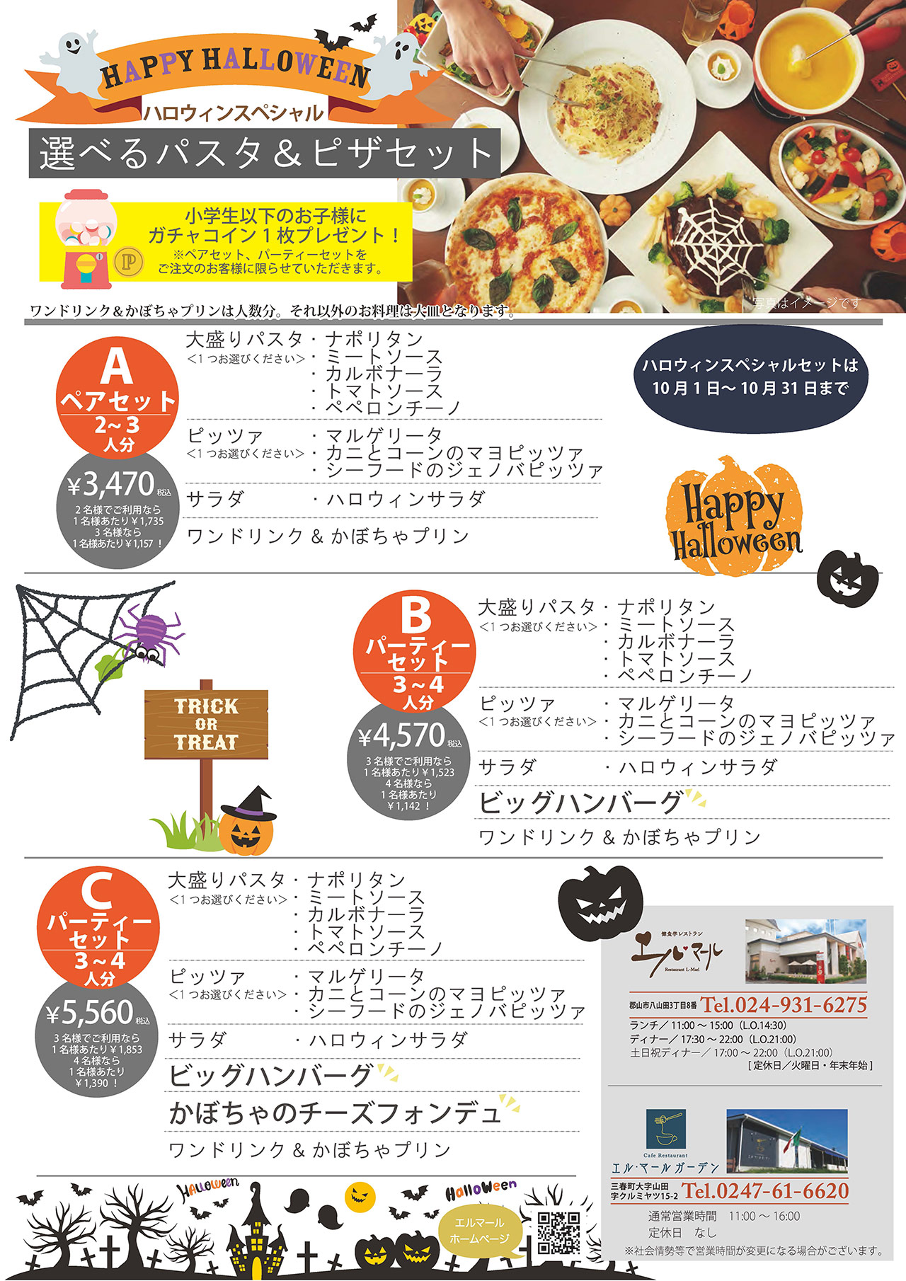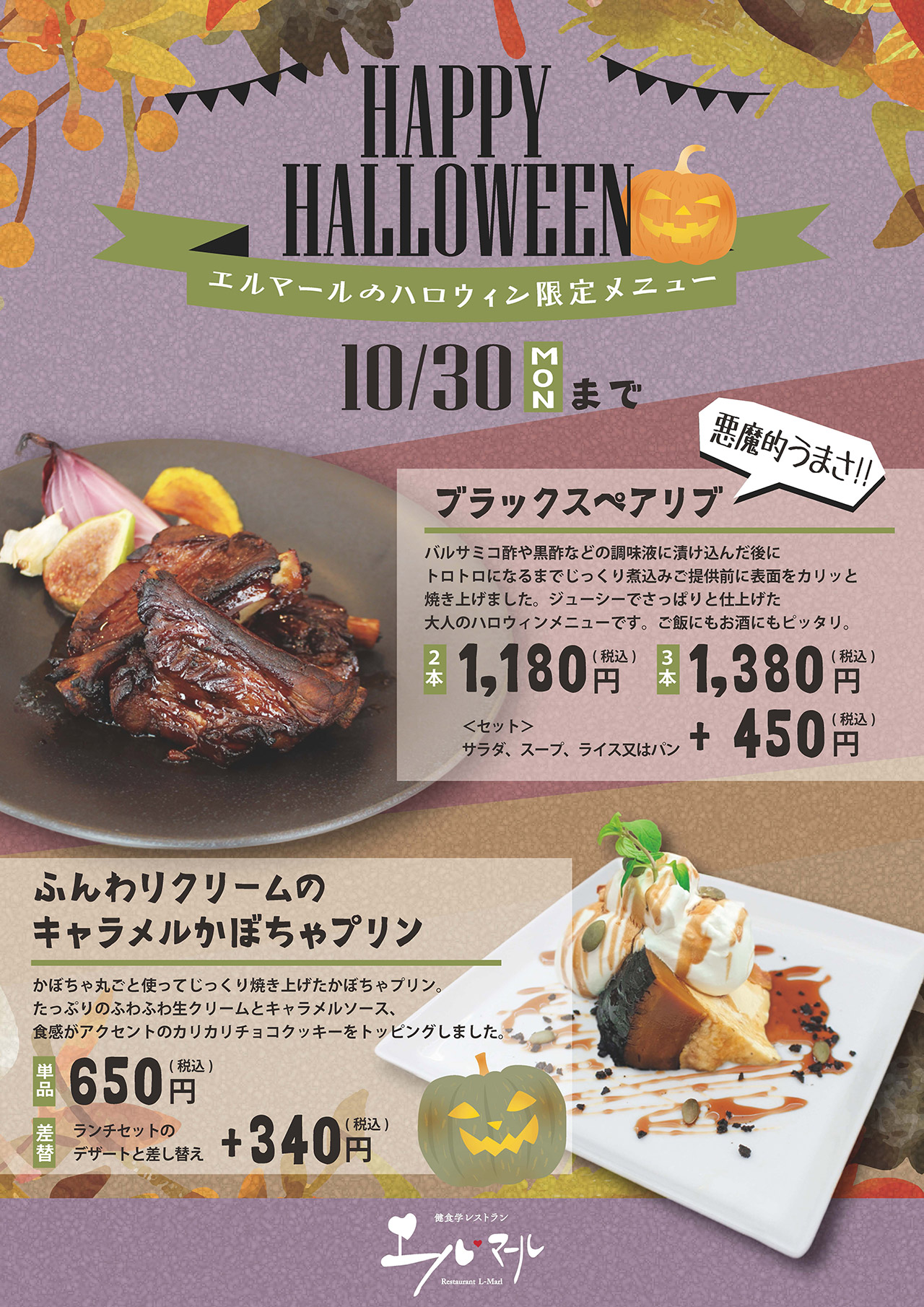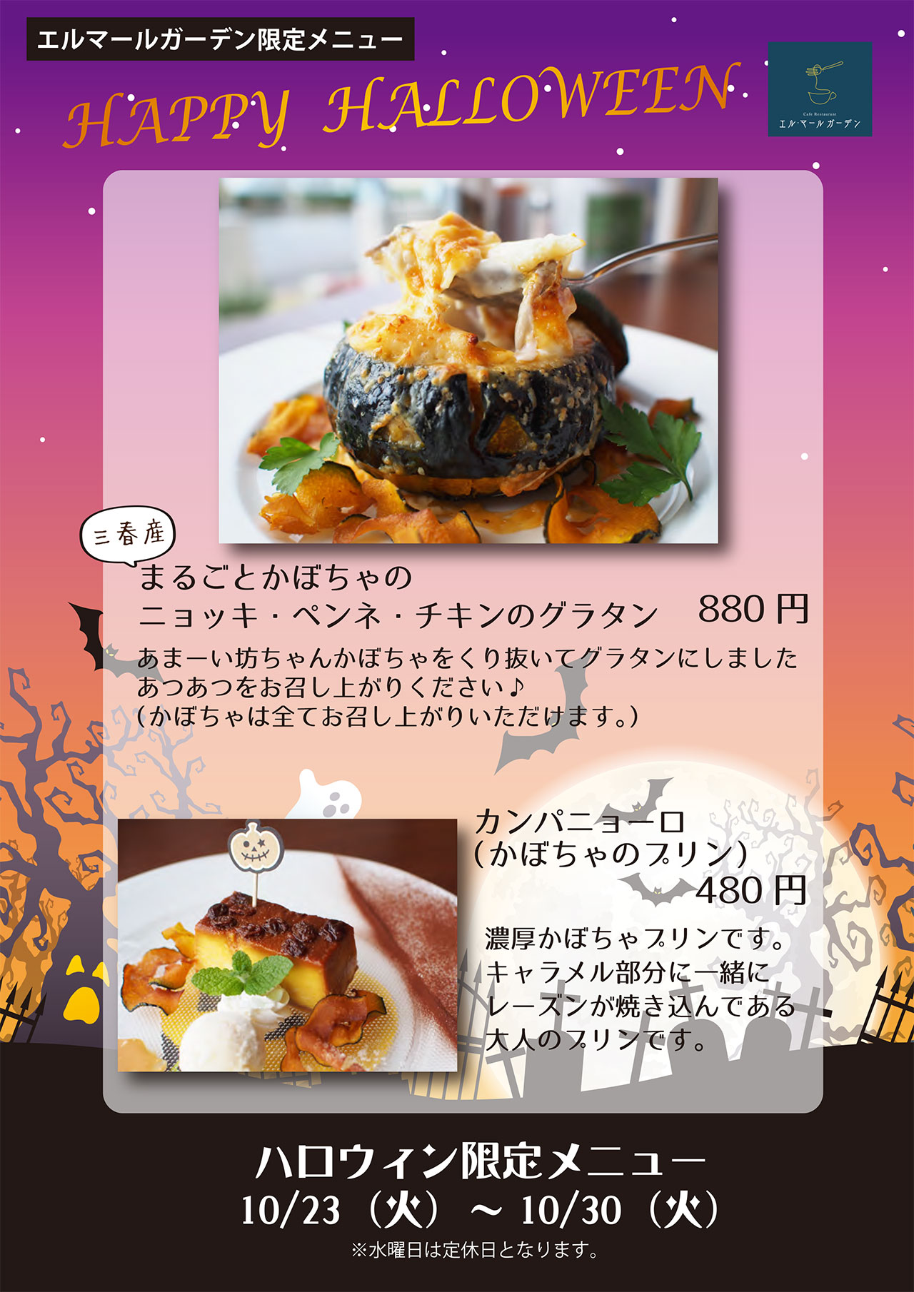 | 2018/10/22 | ★エルマールガーデン限定メニュー ハロウィン限定メニュー★ 2018年10月23日(火)~30日(火) | |