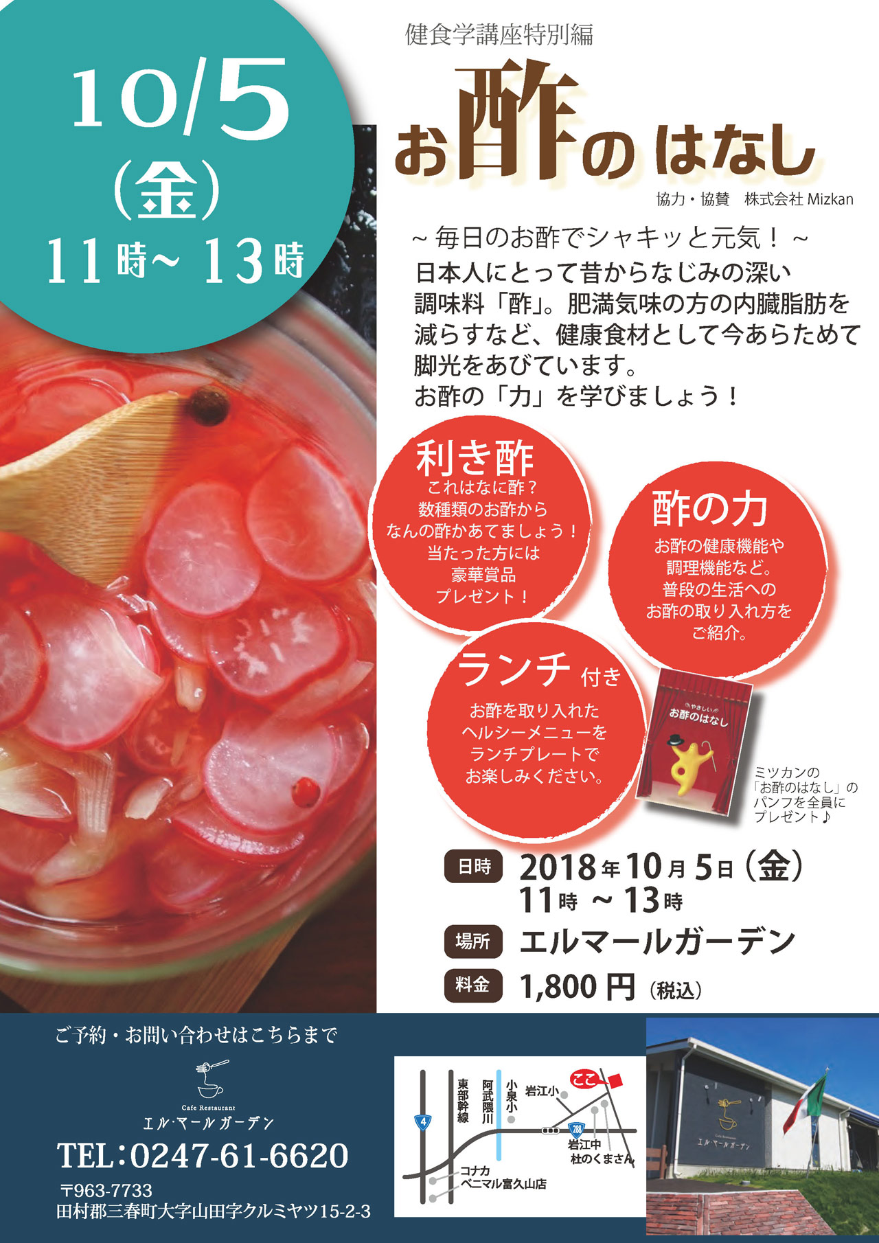 | 2018/9/5 | ★健食学講座 特別編 お酢のはなし★ ~毎日のお酢でシャキッと元気!~お酢の「力」を学びましょう! | |
