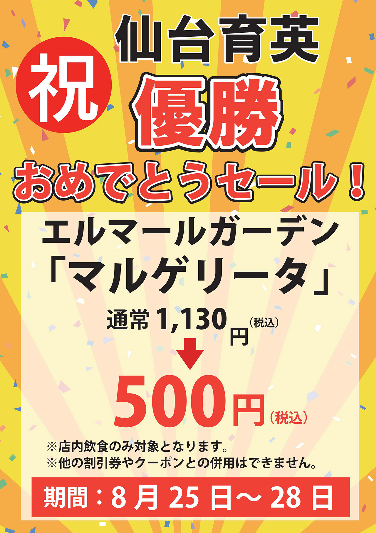 | 2019/9/1 | ★エルマール・エルマールガーデン共通 秋のPartyプラン★ 要予約 4名様より | |