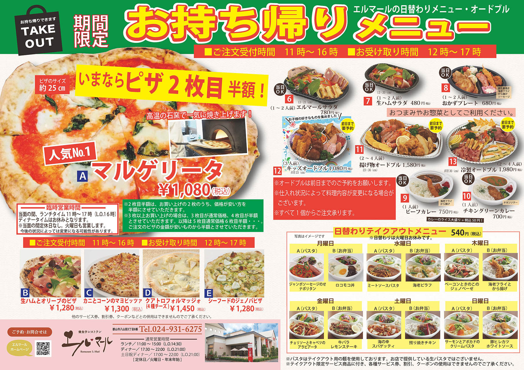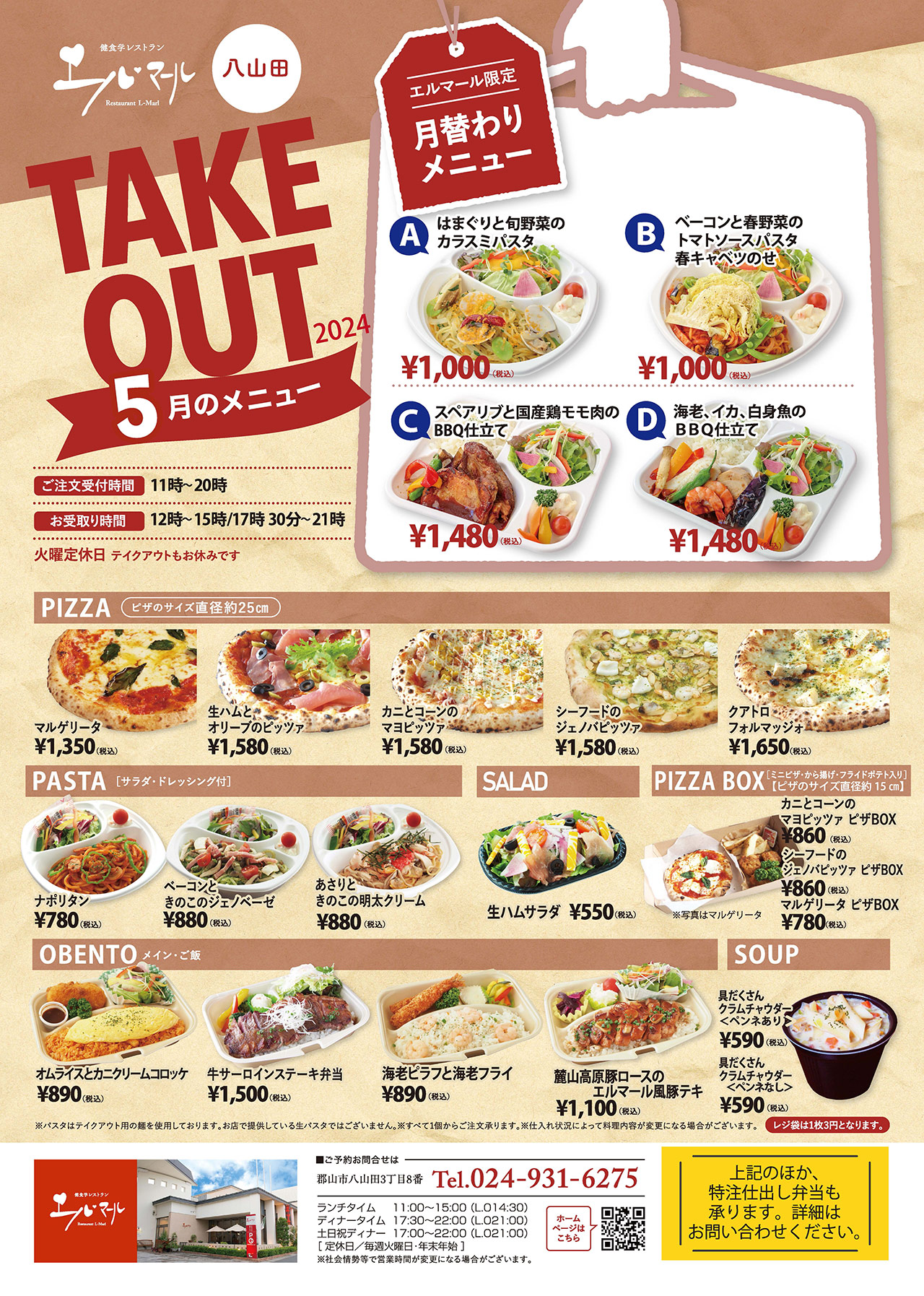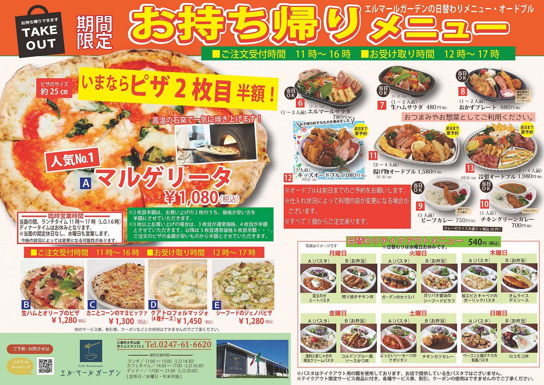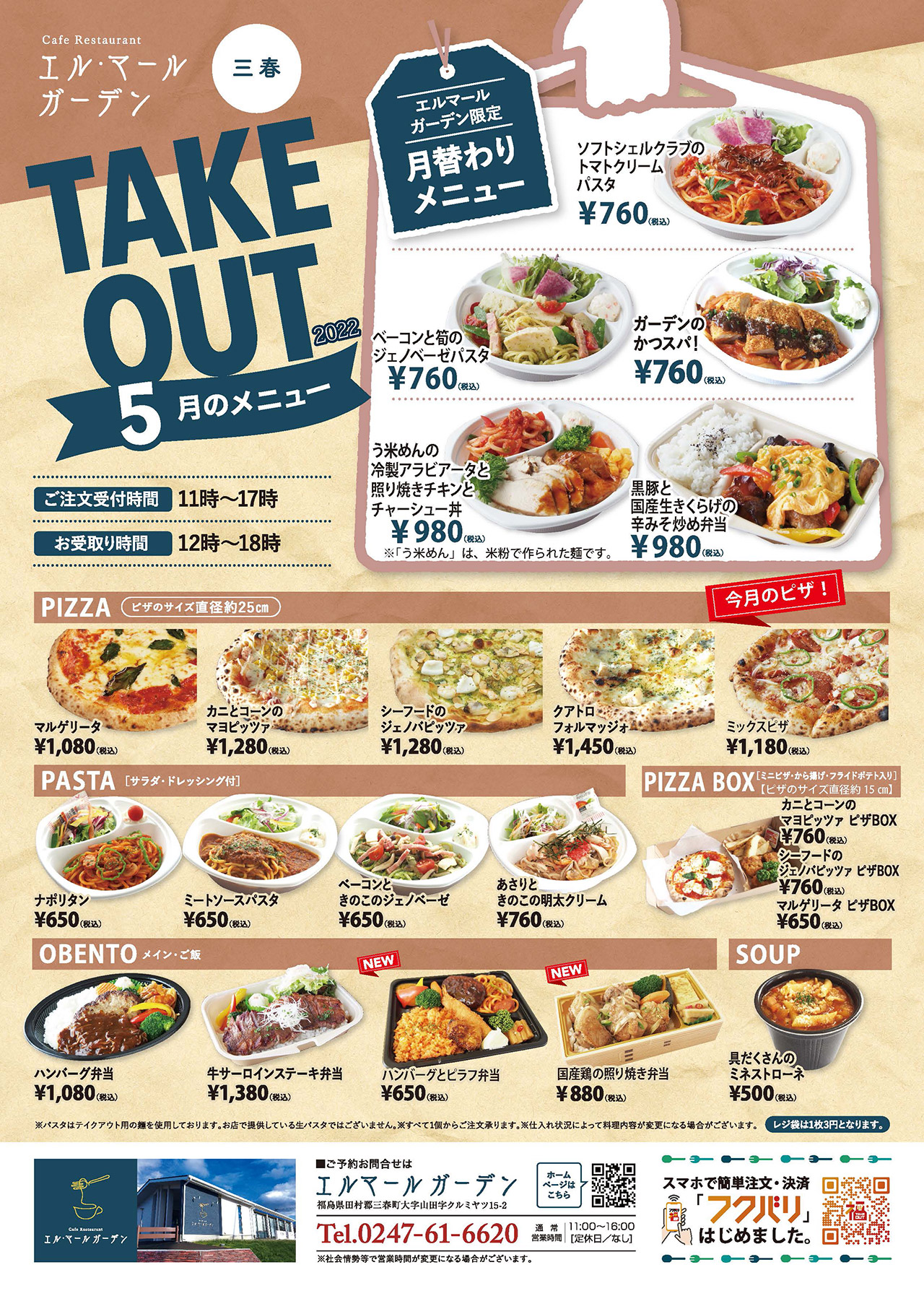 | 2024/5/2 | ★テイクアウトメニュー更新★ 【お持ち帰りできます】 【エルマール 5月のテイクアウトメニューはこちら】 | |