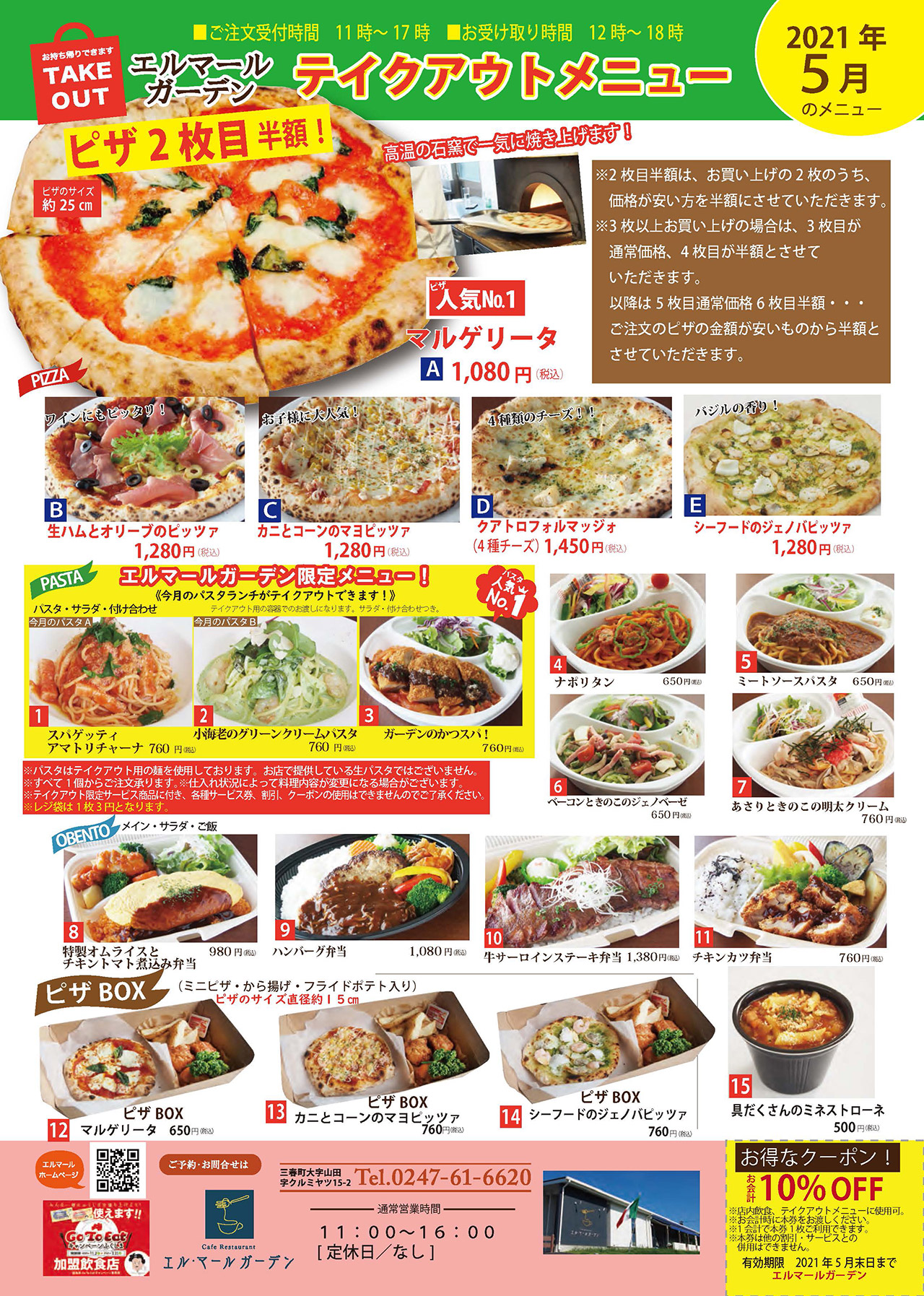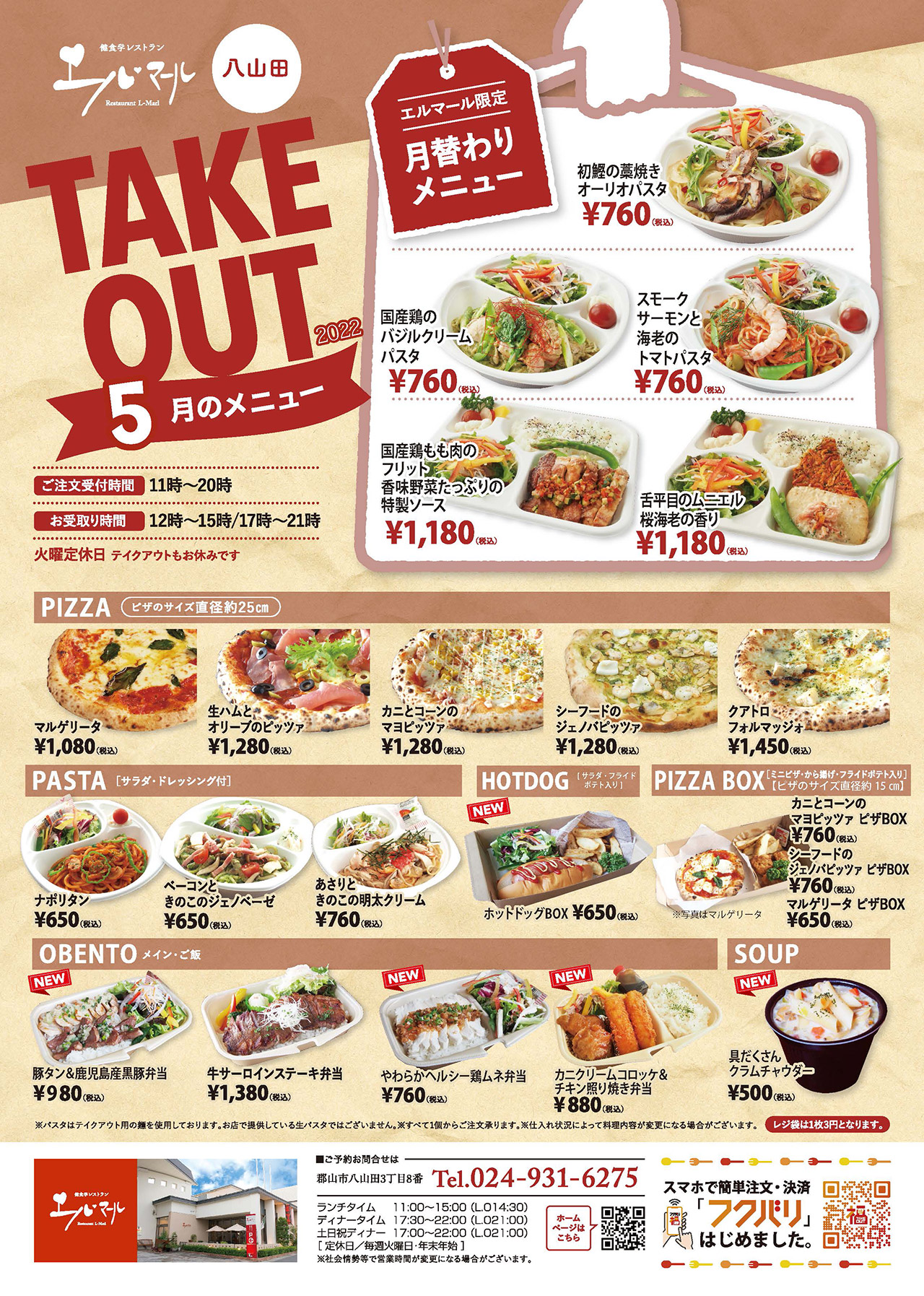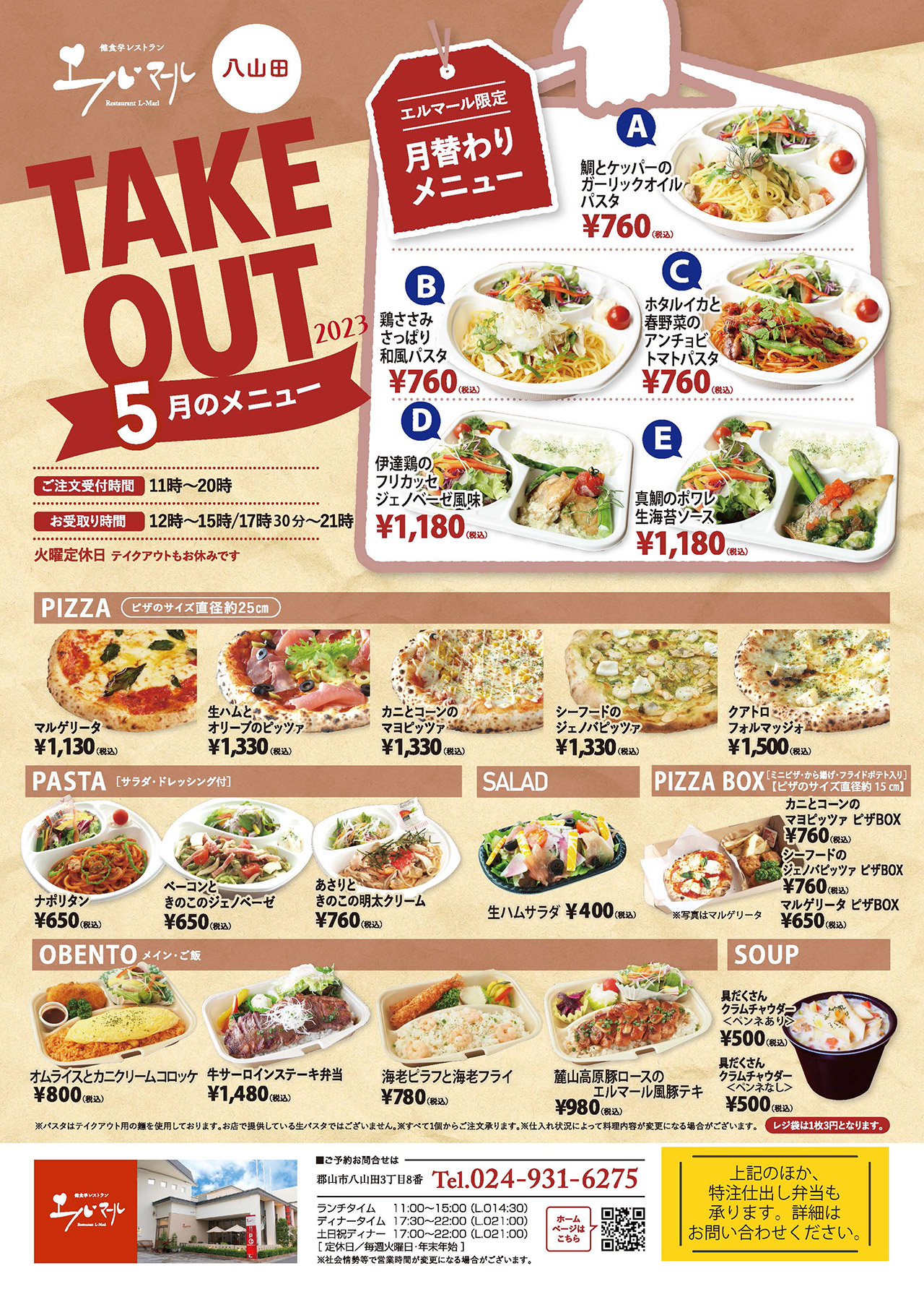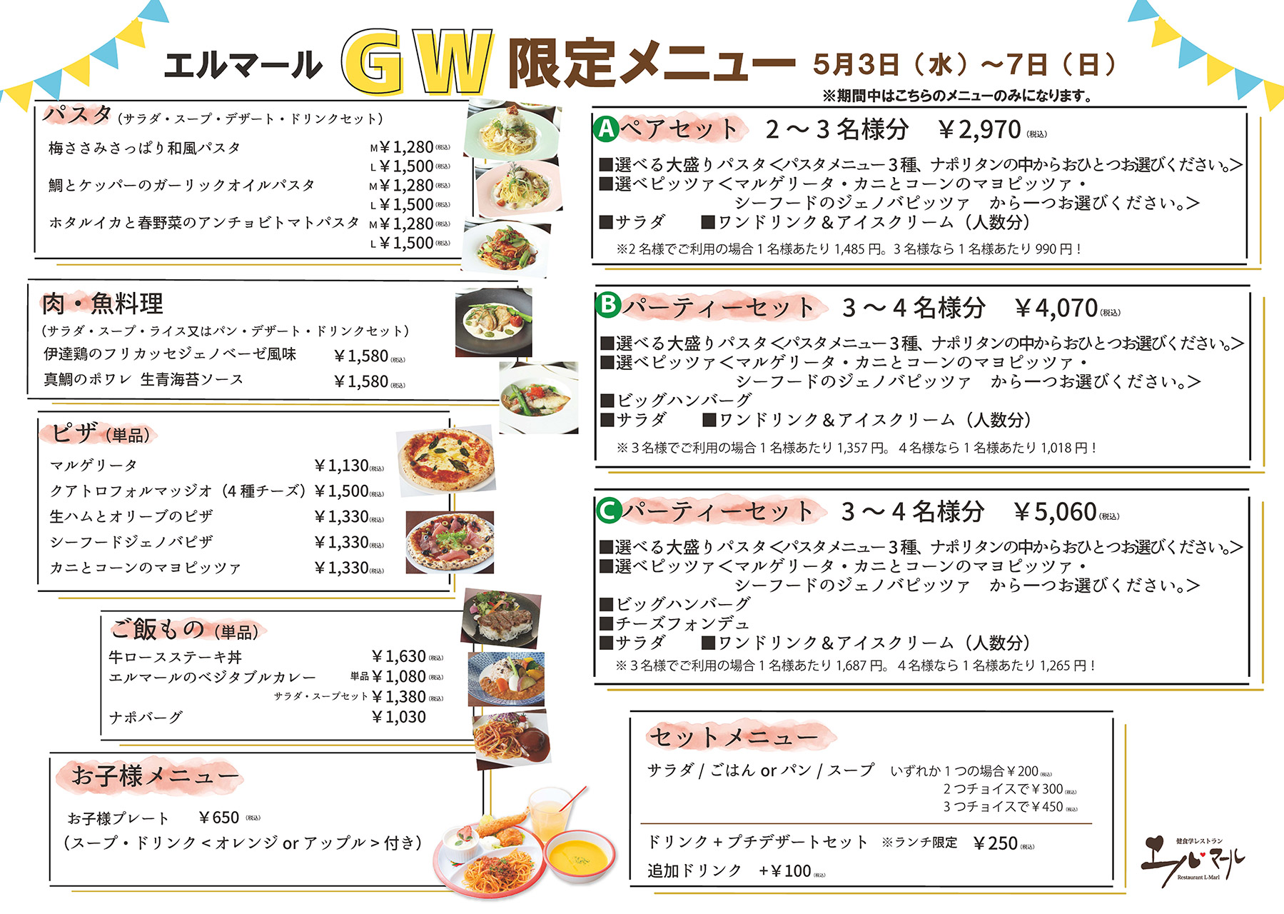 | 2024/5/2 | ★テイクアウトメニュー更新★ 【お持ち帰りできます】 【エルマール 5月のテイクアウトメニューはこちら】 | |