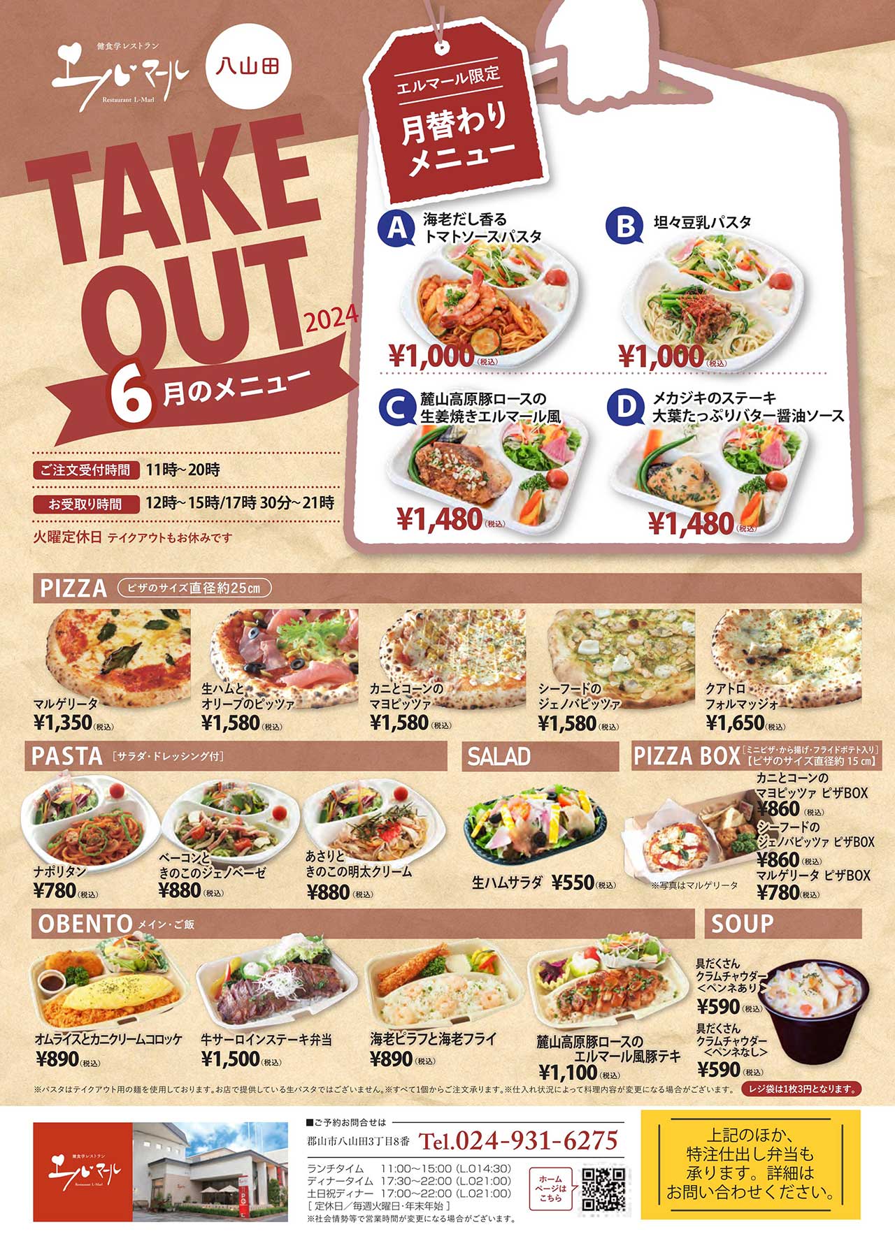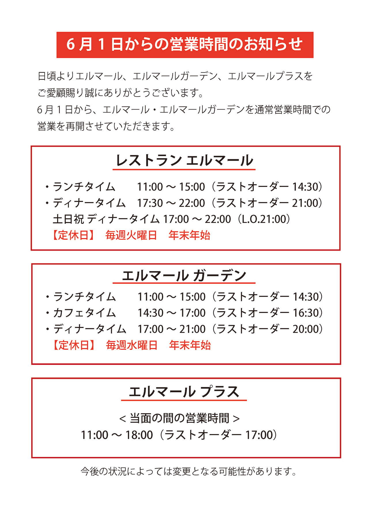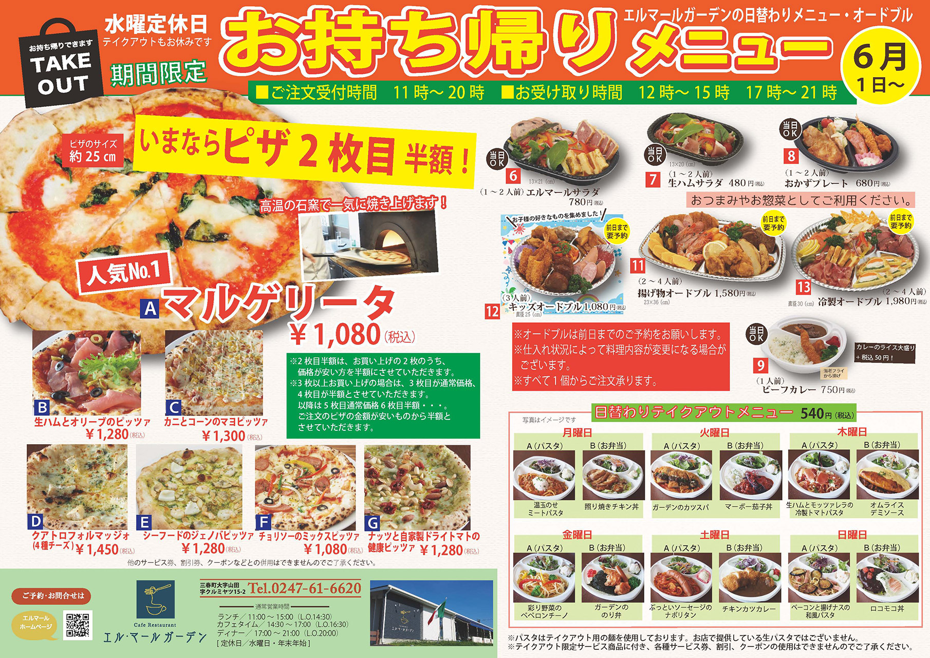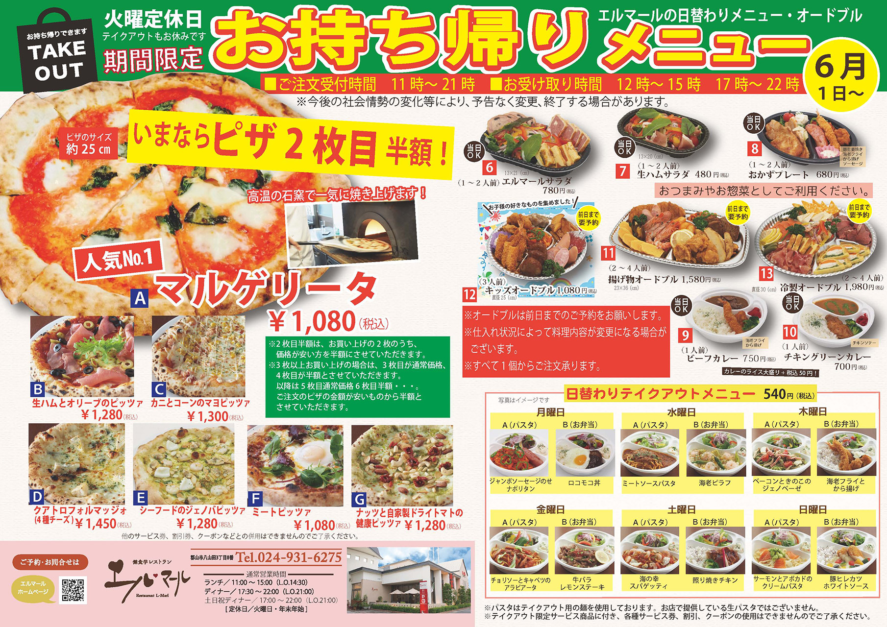 | 2024/5/30 | ★テイクアウトメニュー更新★ 【お持ち帰りできます】 【エルマール 6月のテイクアウトメニューはこちら】 | |