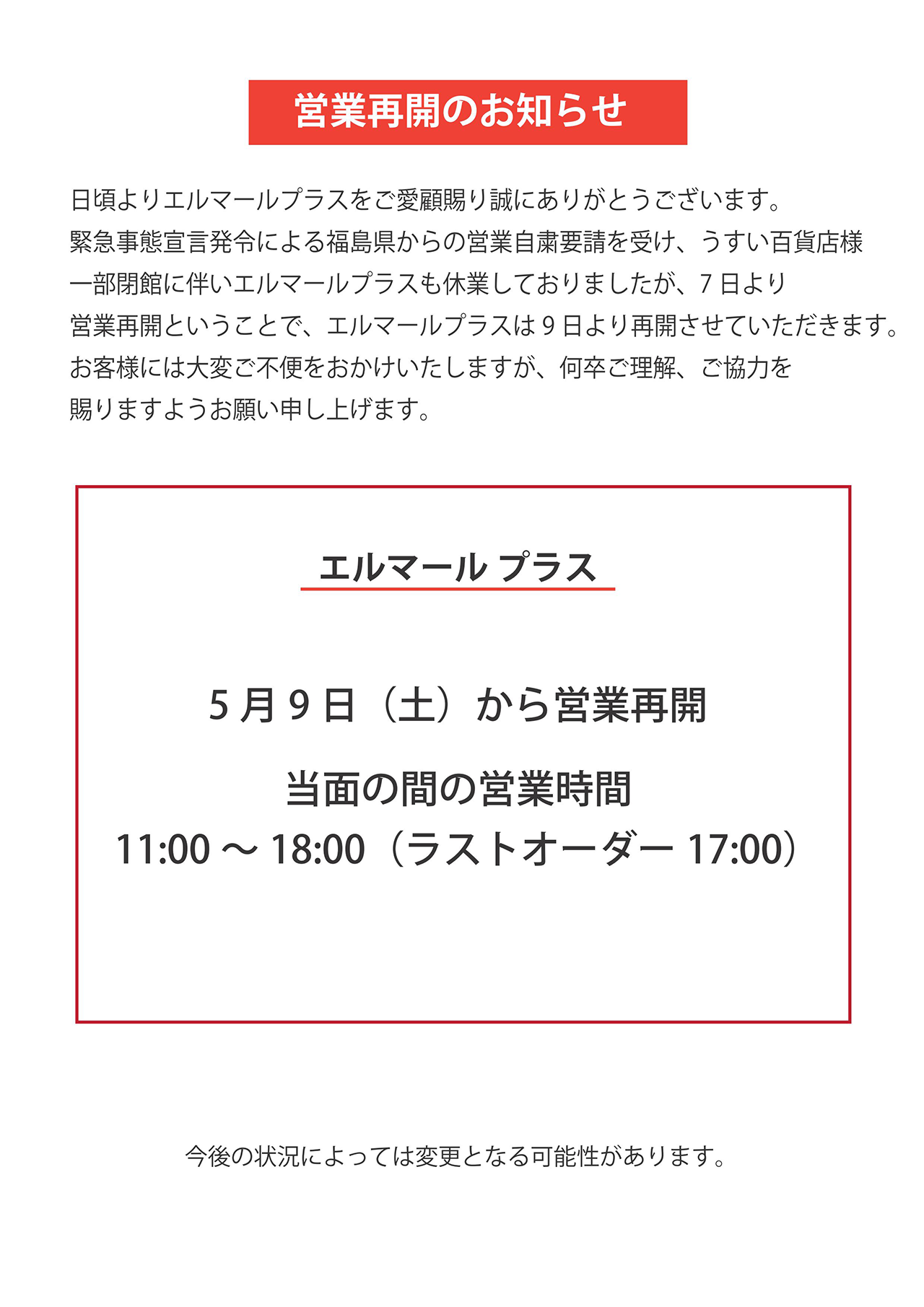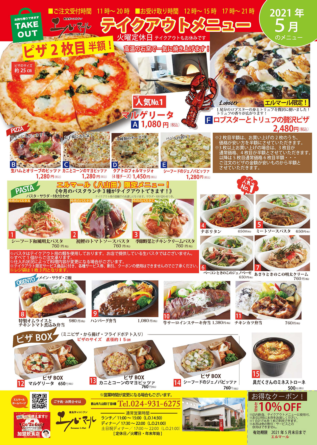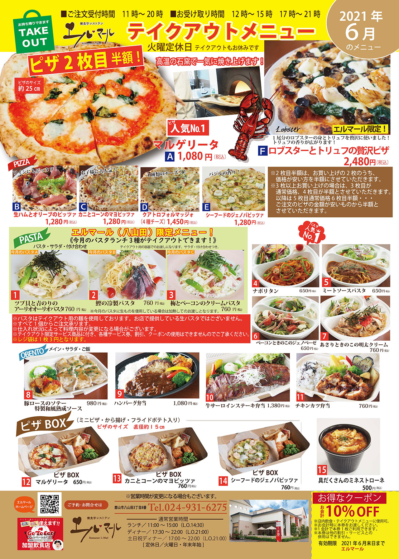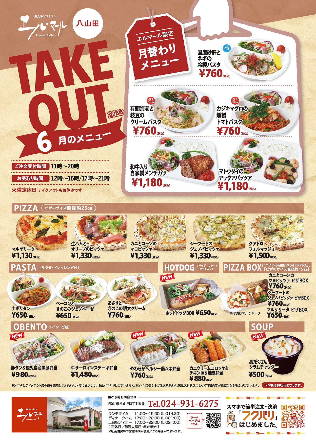 | 2024/5/30 | ★テイクアウトメニュー更新★ 【お持ち帰りできます】 【エルマール 6月のテイクアウトメニューはこちら】 | |