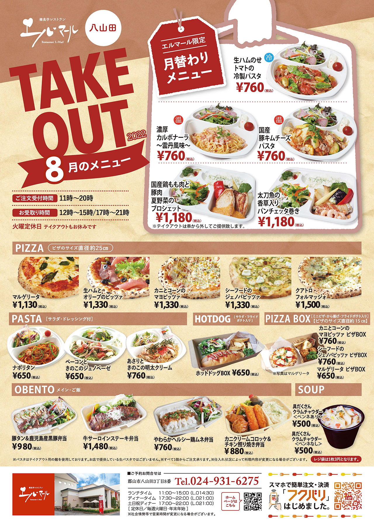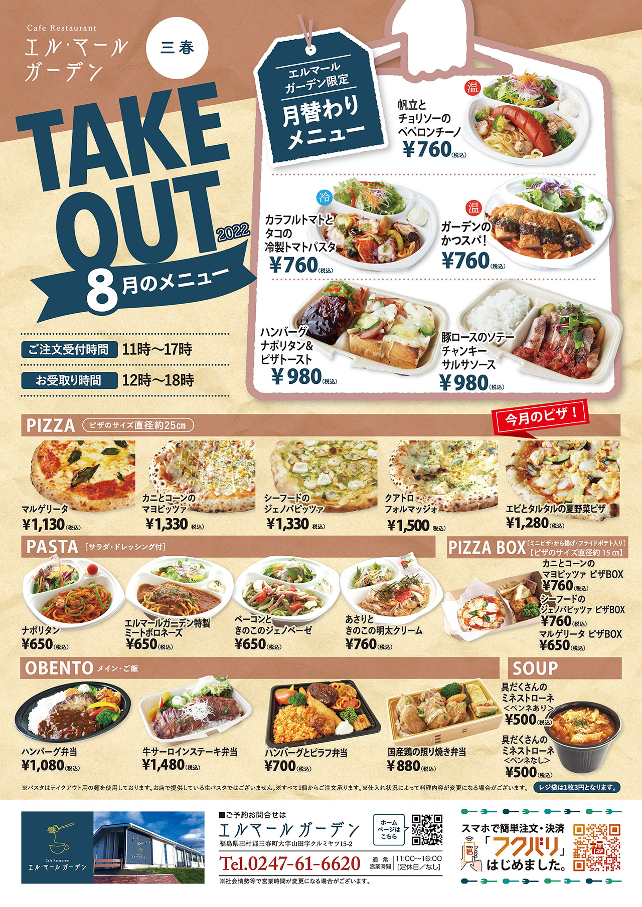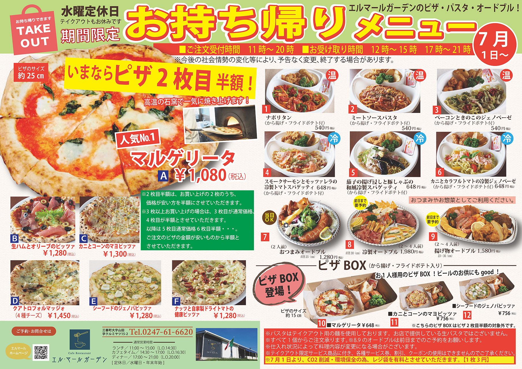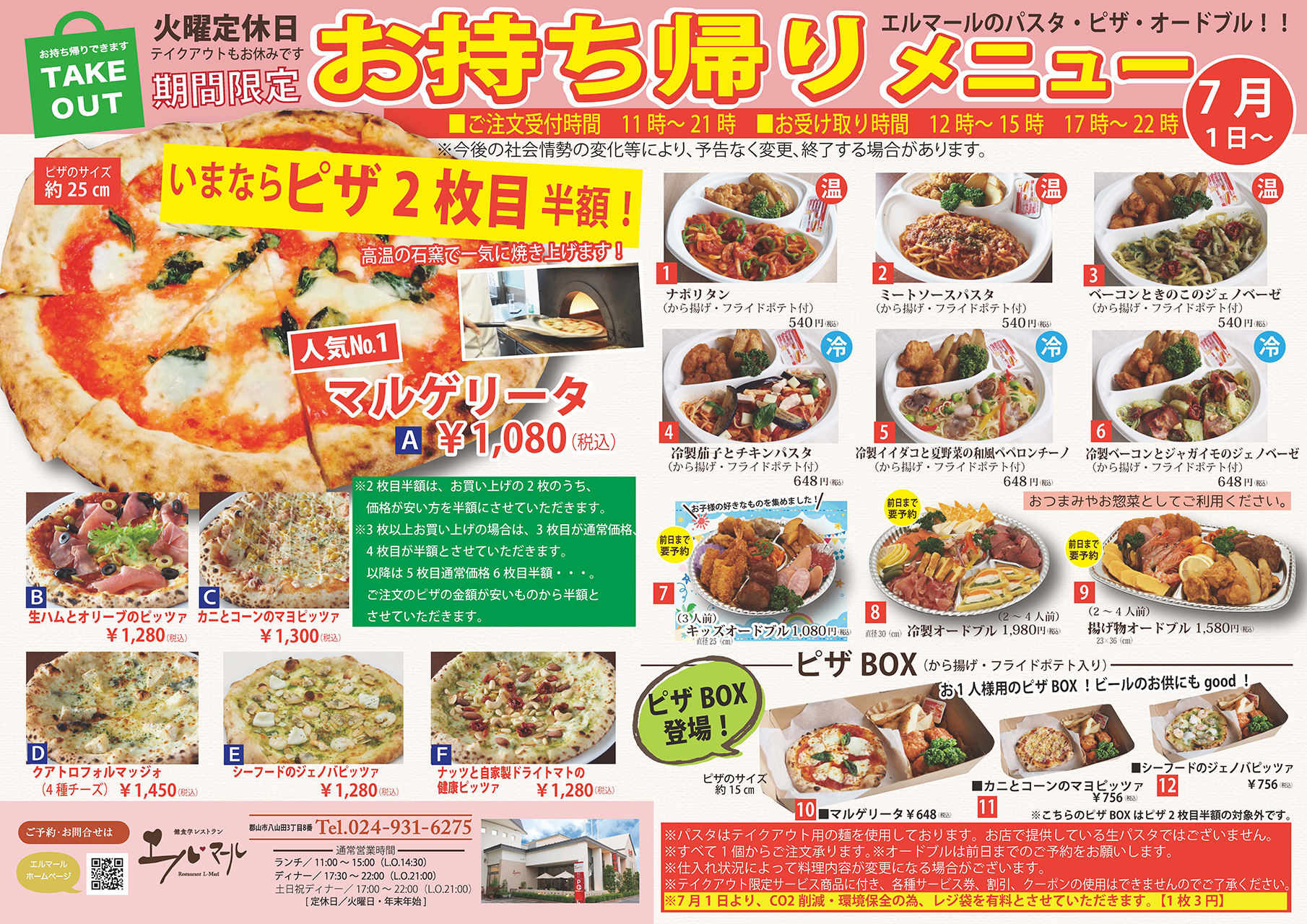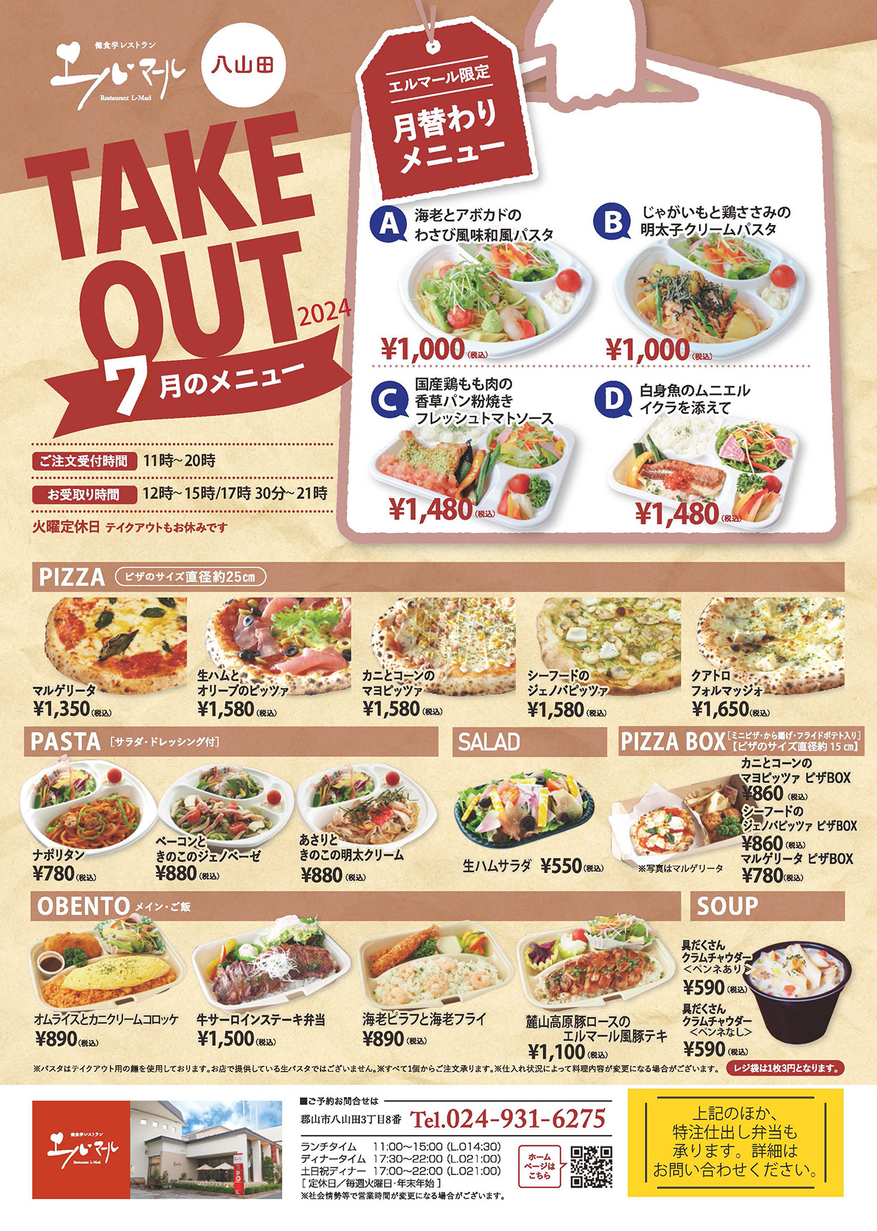 | 2024/7/25 | ★テイクアウトメニュー更新★ 【お持ち帰りできます】 【エルマール 8月のテイクアウトメニューはこちら】 | |