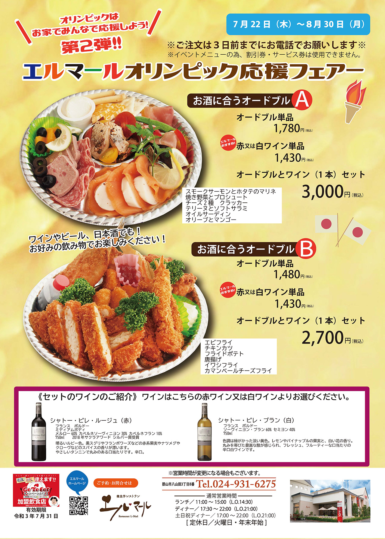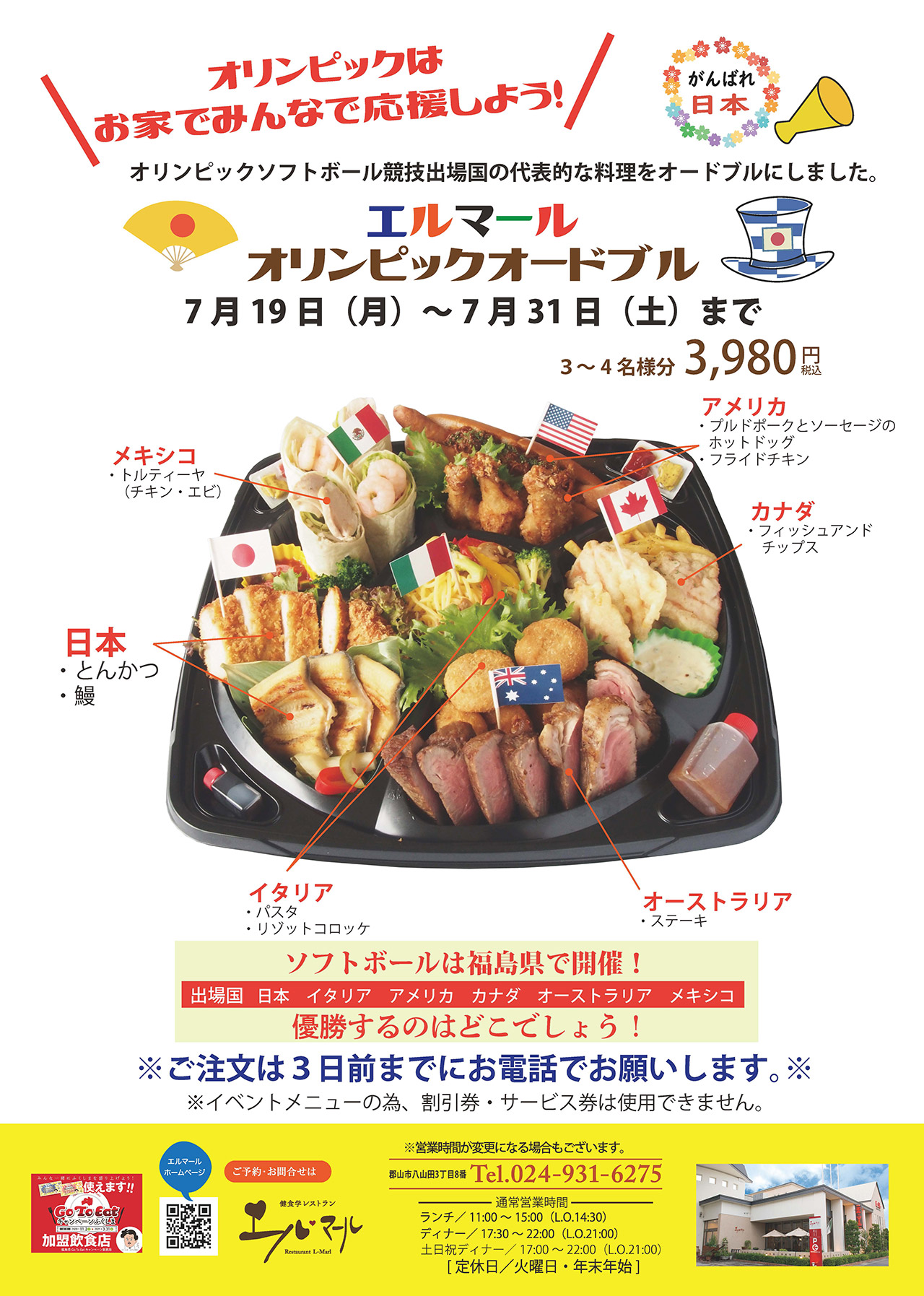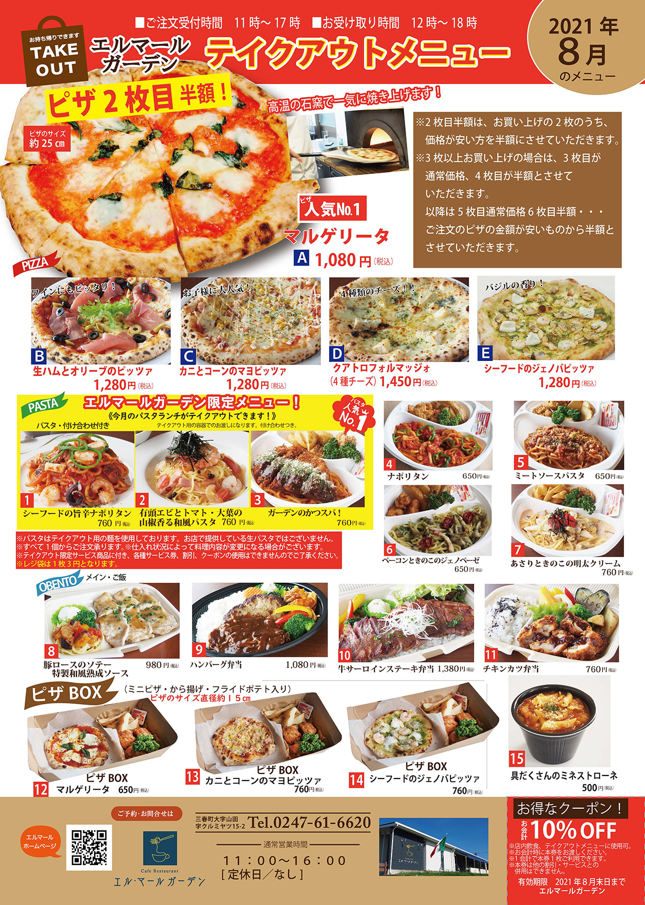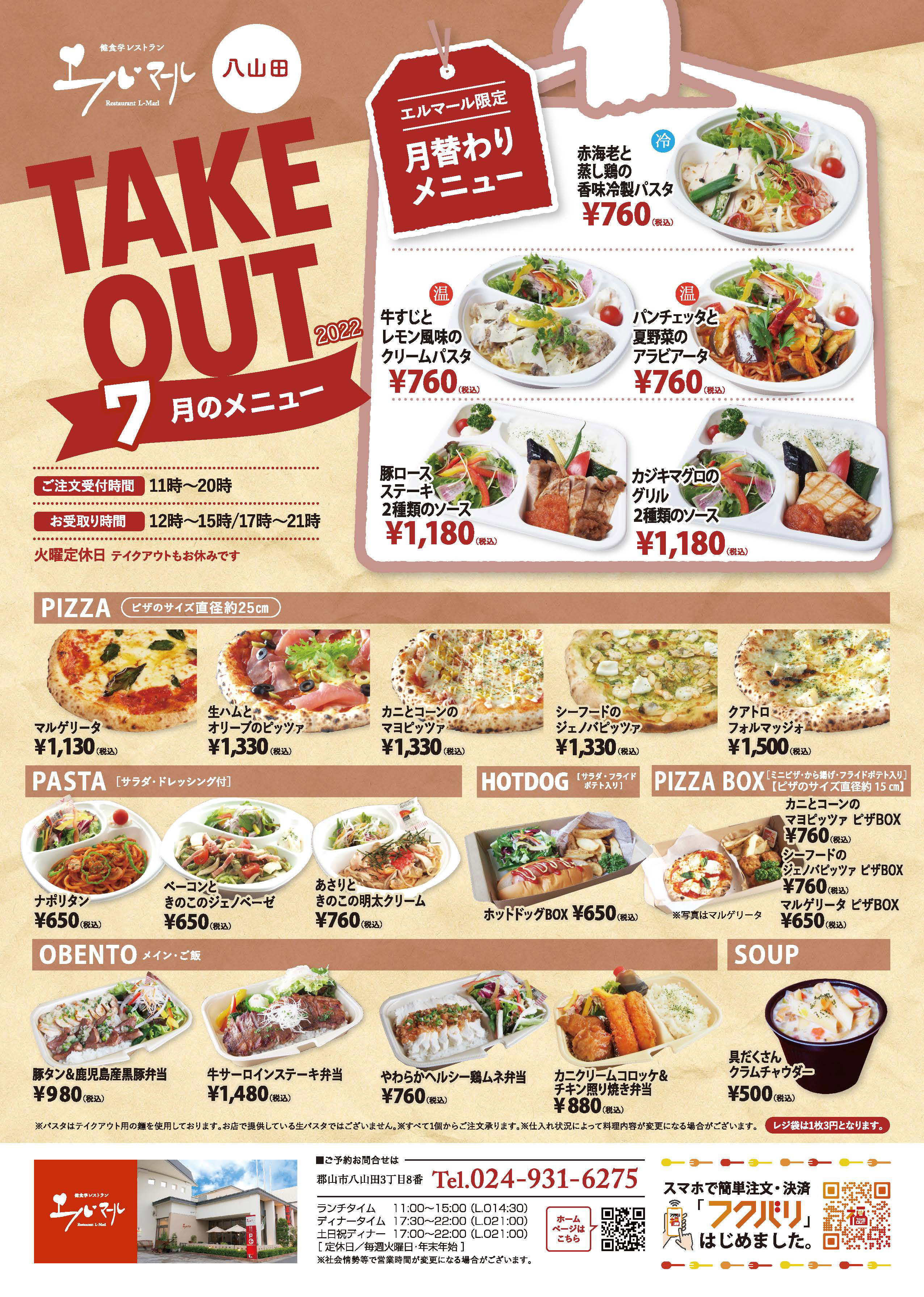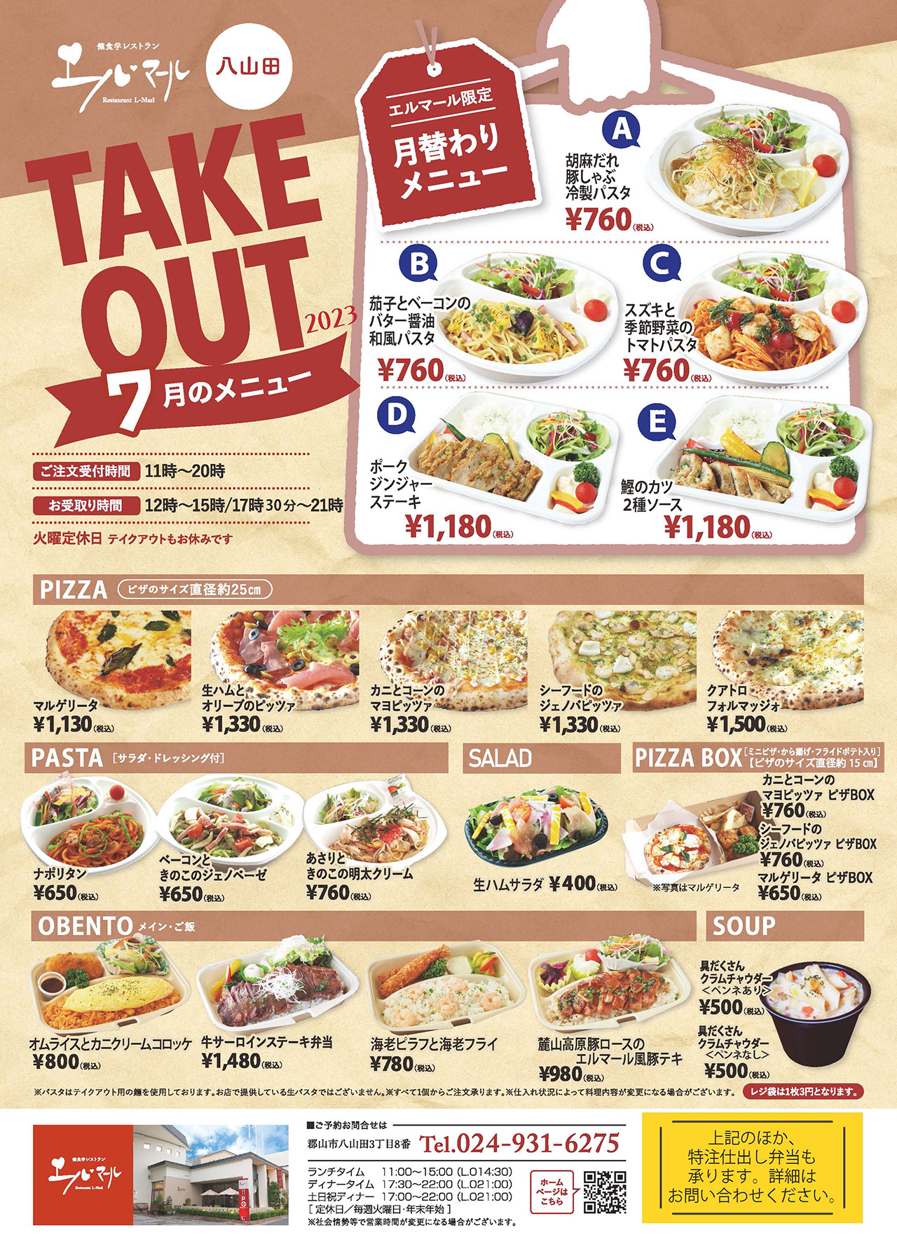 | 2024/7/25 | ★テイクアウトメニュー更新★ 【お持ち帰りできます】 【エルマール 8月のテイクアウトメニューはこちら】 | |