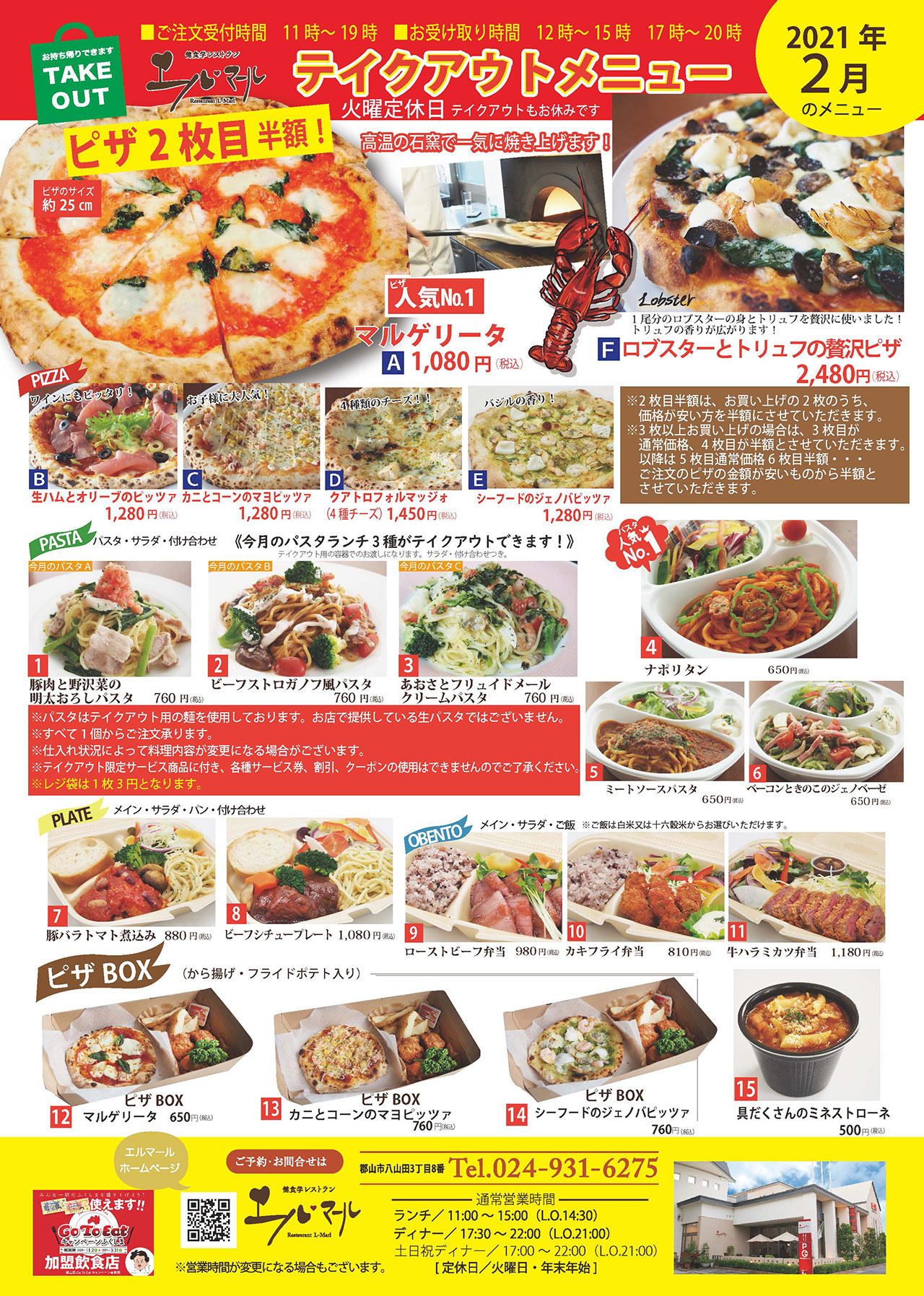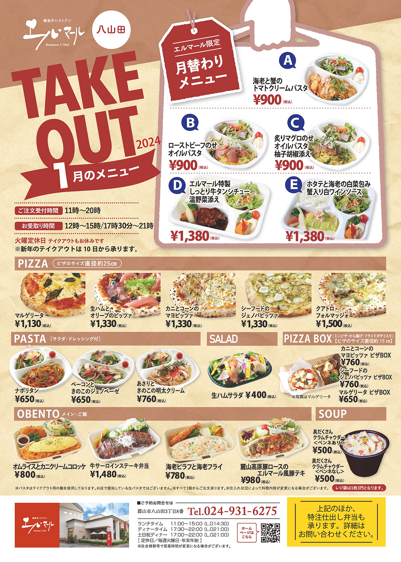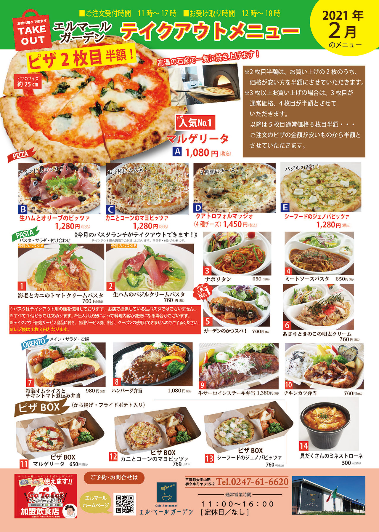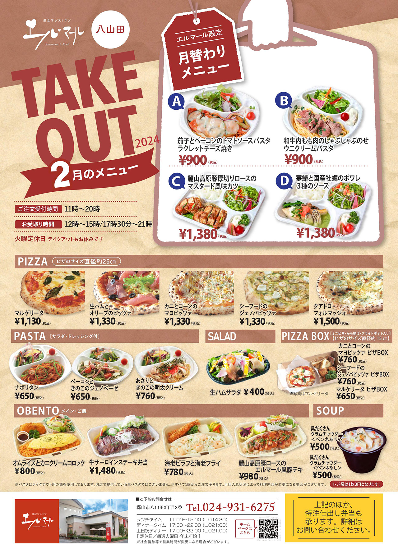 | 2024/1/29 | ★テイクアウトメニュー更新★ 【お持ち帰りできます】 【エルマール 2月のテイクアウトメニューはこちら】 | |