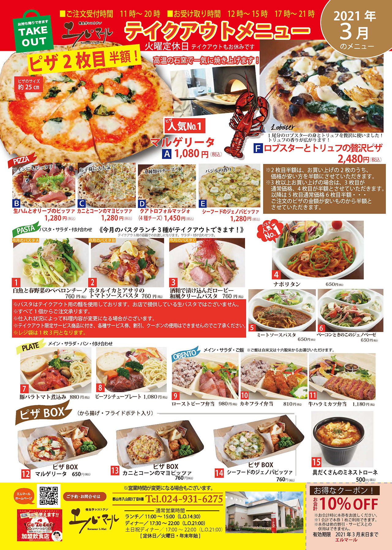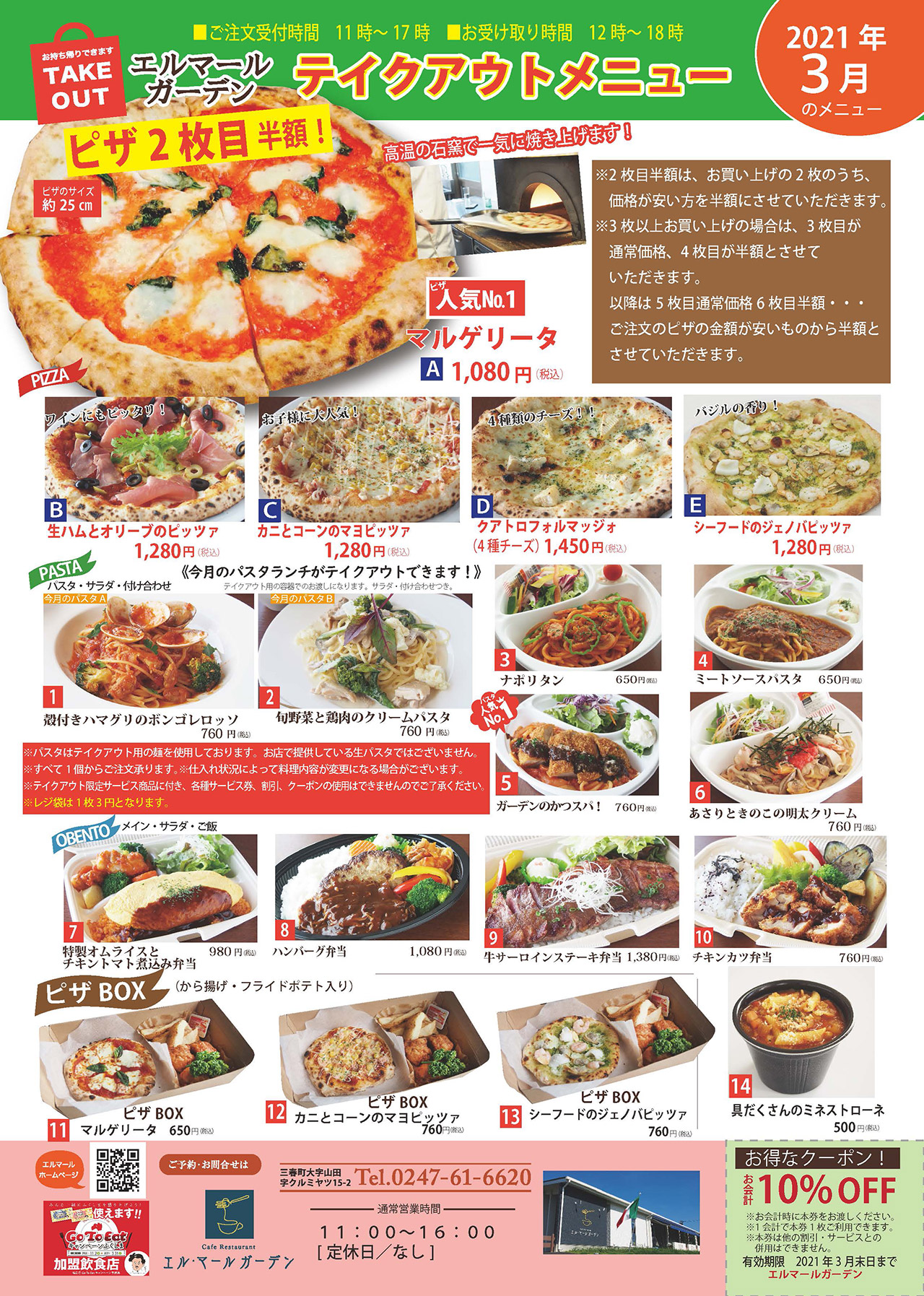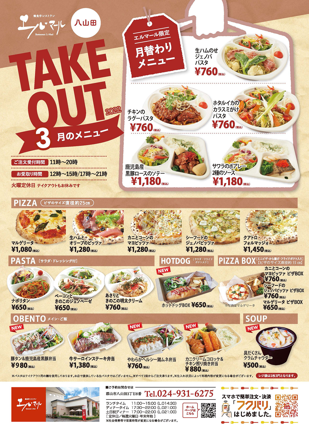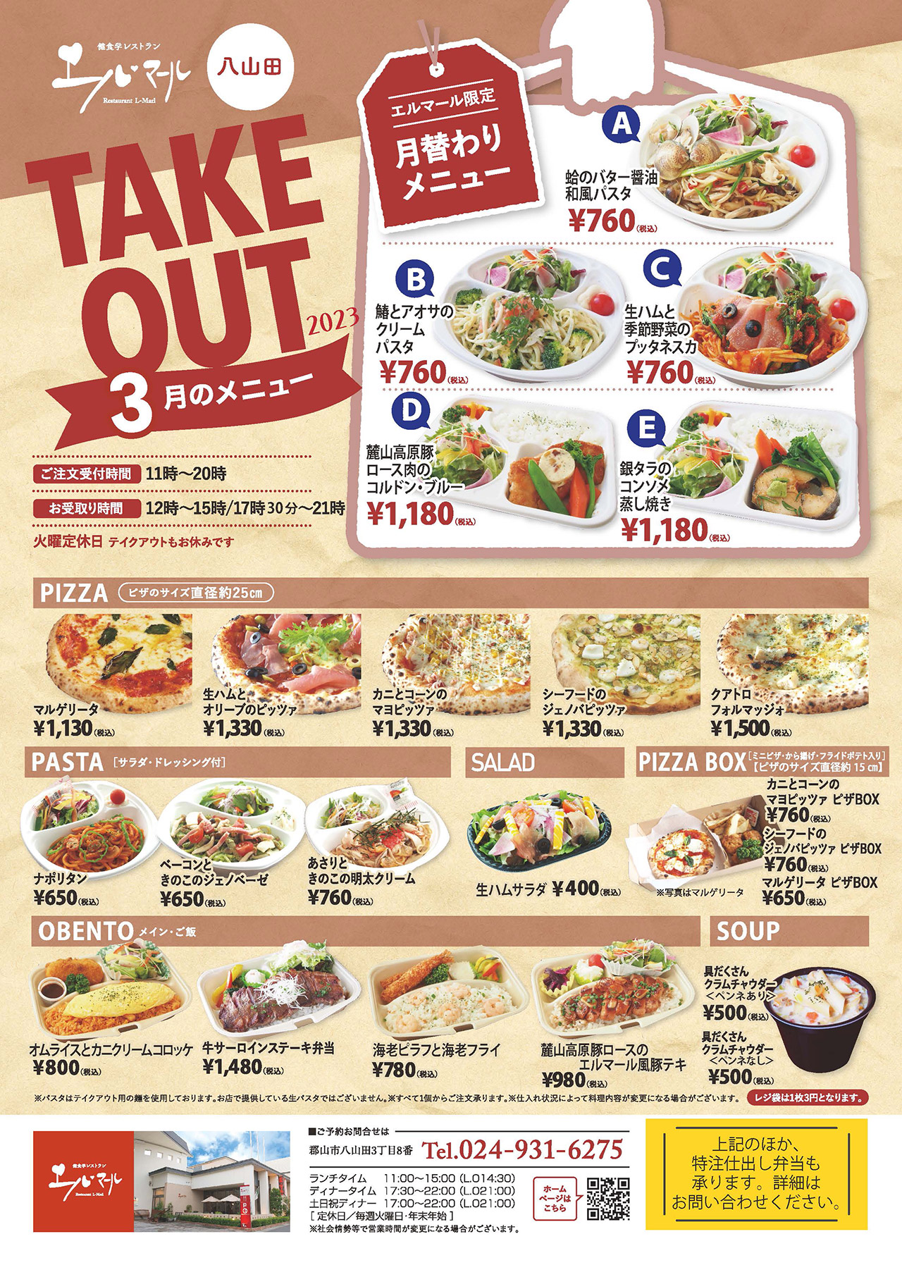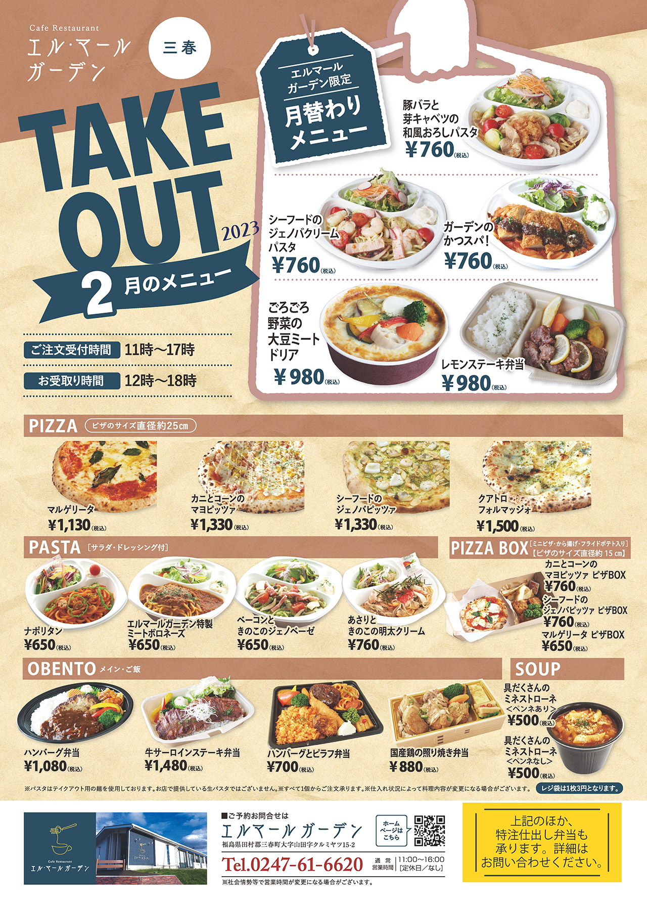 | 2024/2/28 | ★テイクアウトメニュー更新★ 【お持ち帰りできます】 【エルマール 3月のテイクアウトメニューはこちら】 | |