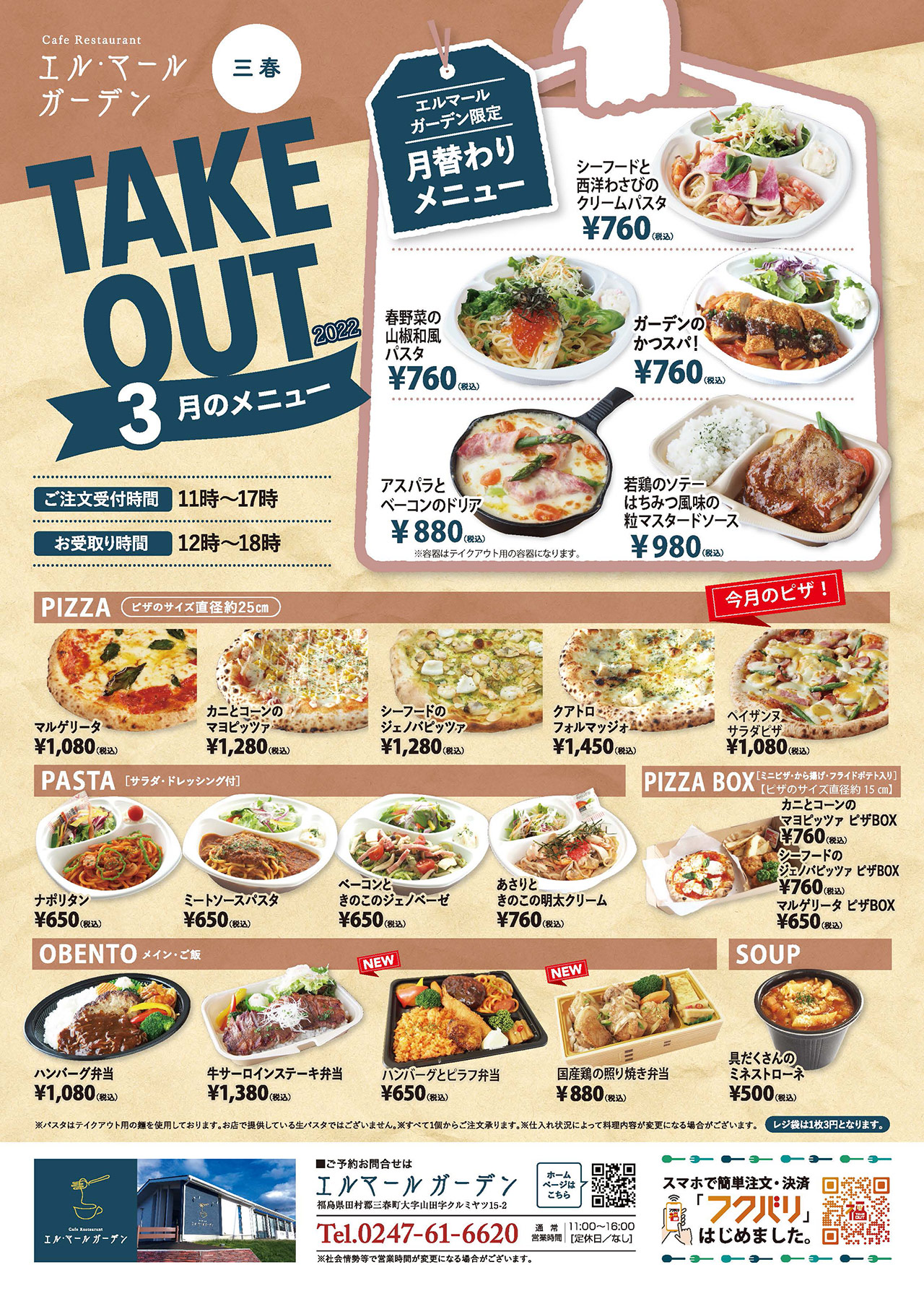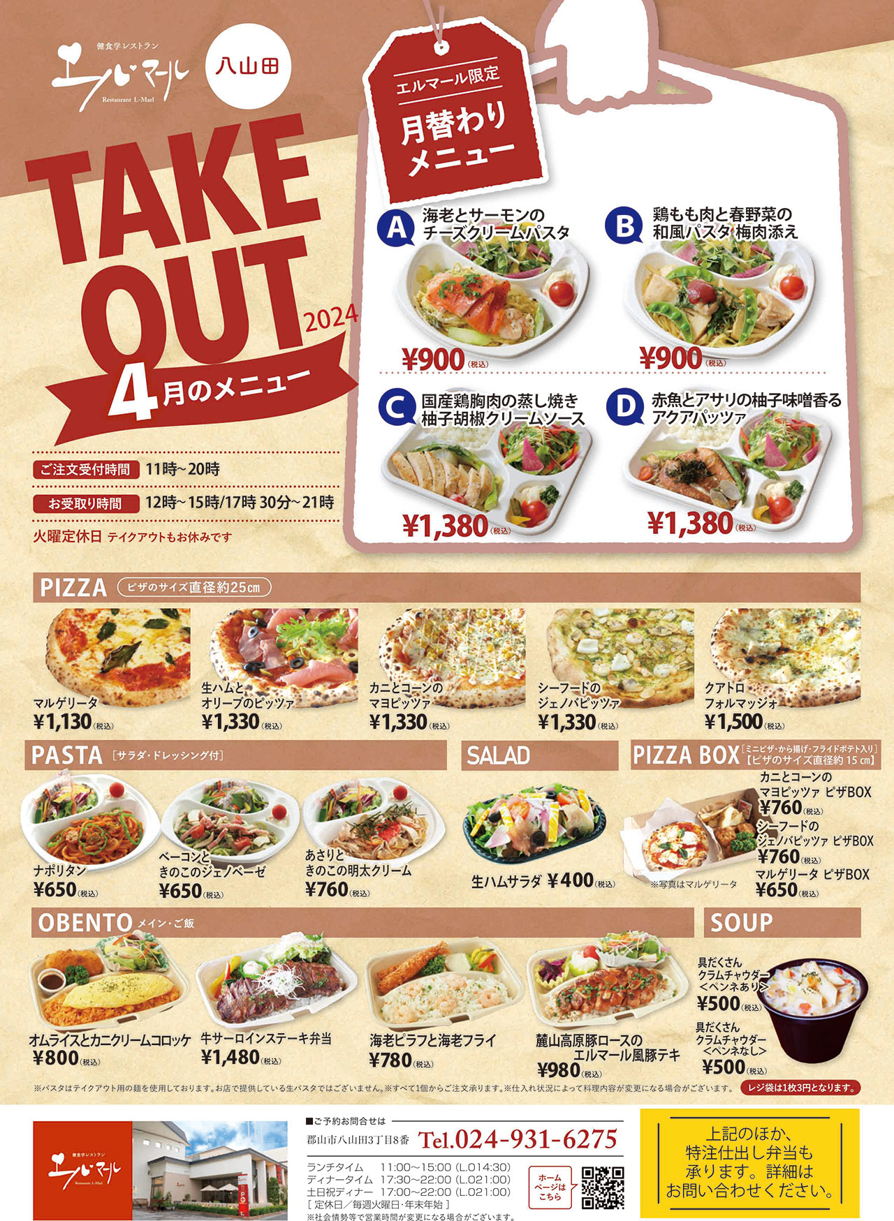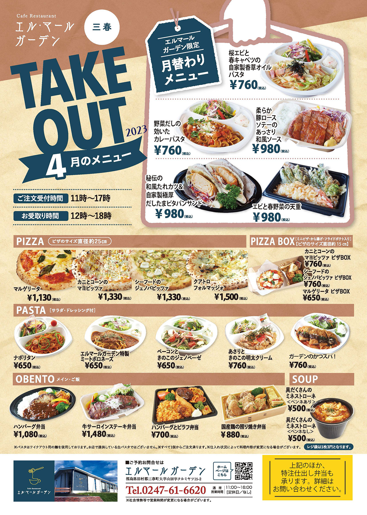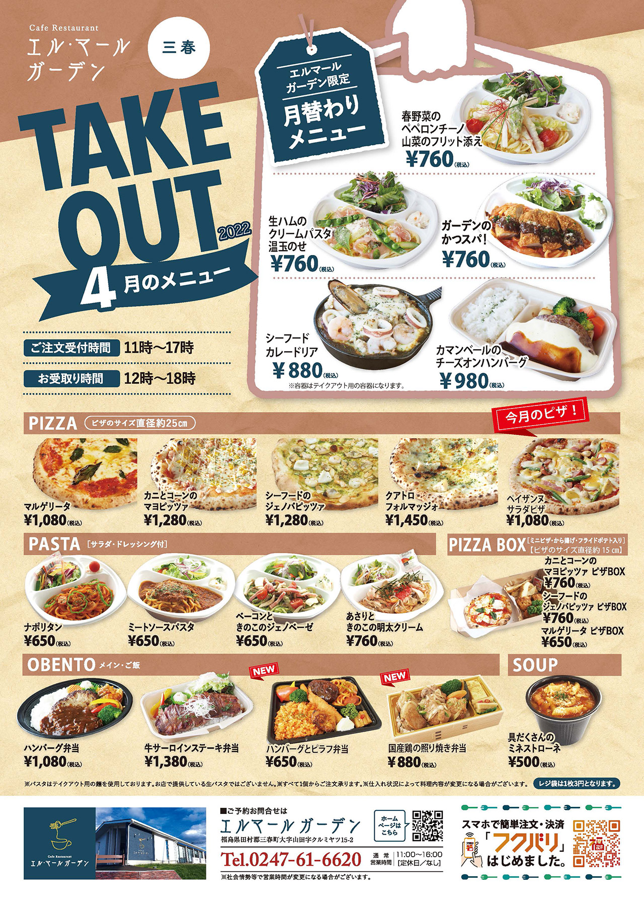 | 2024/3/28 | ★テイクアウトメニュー更新★ 【お持ち帰りできます】 【エルマール 4月のテイクアウトメニューはこちら】 | |