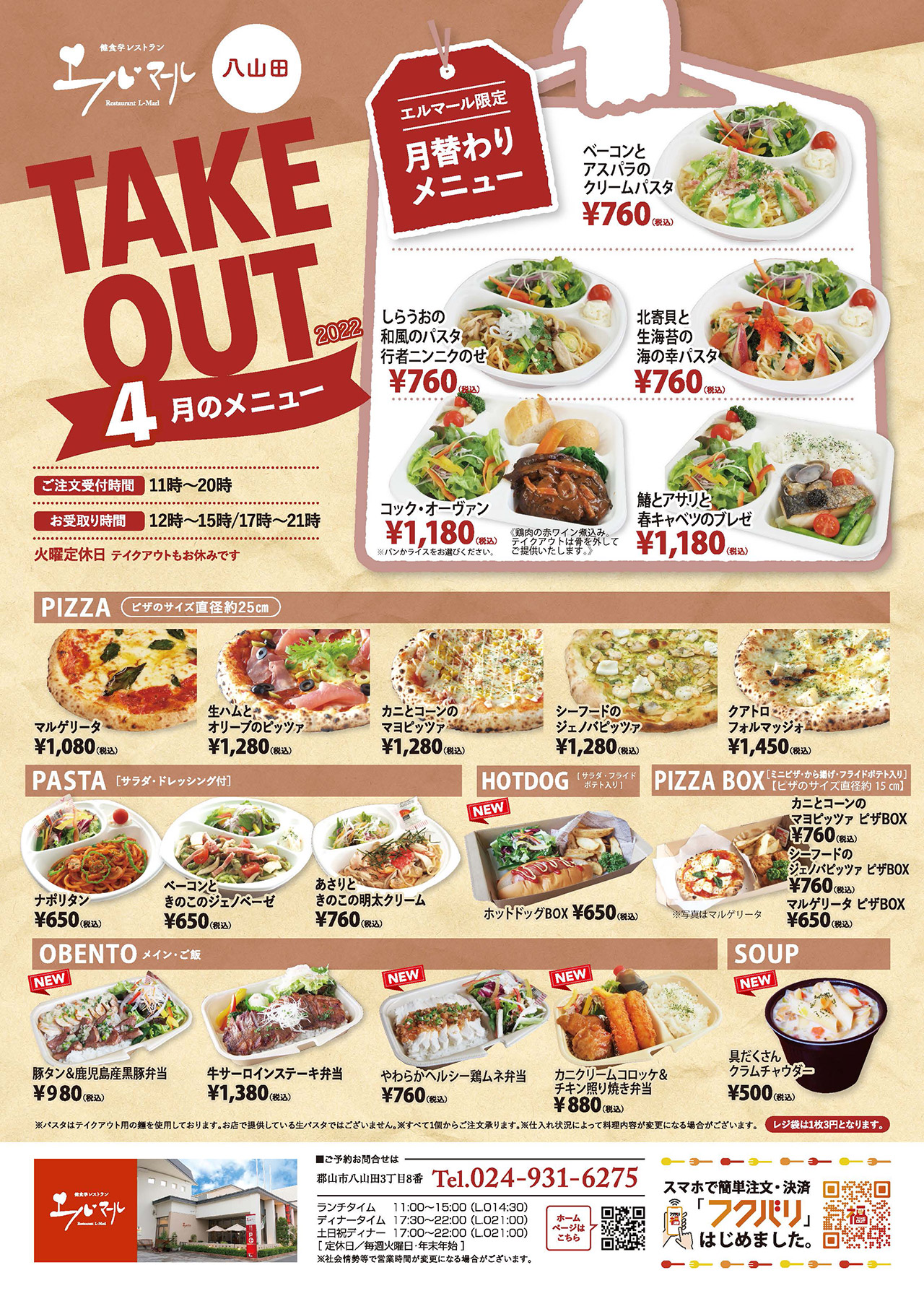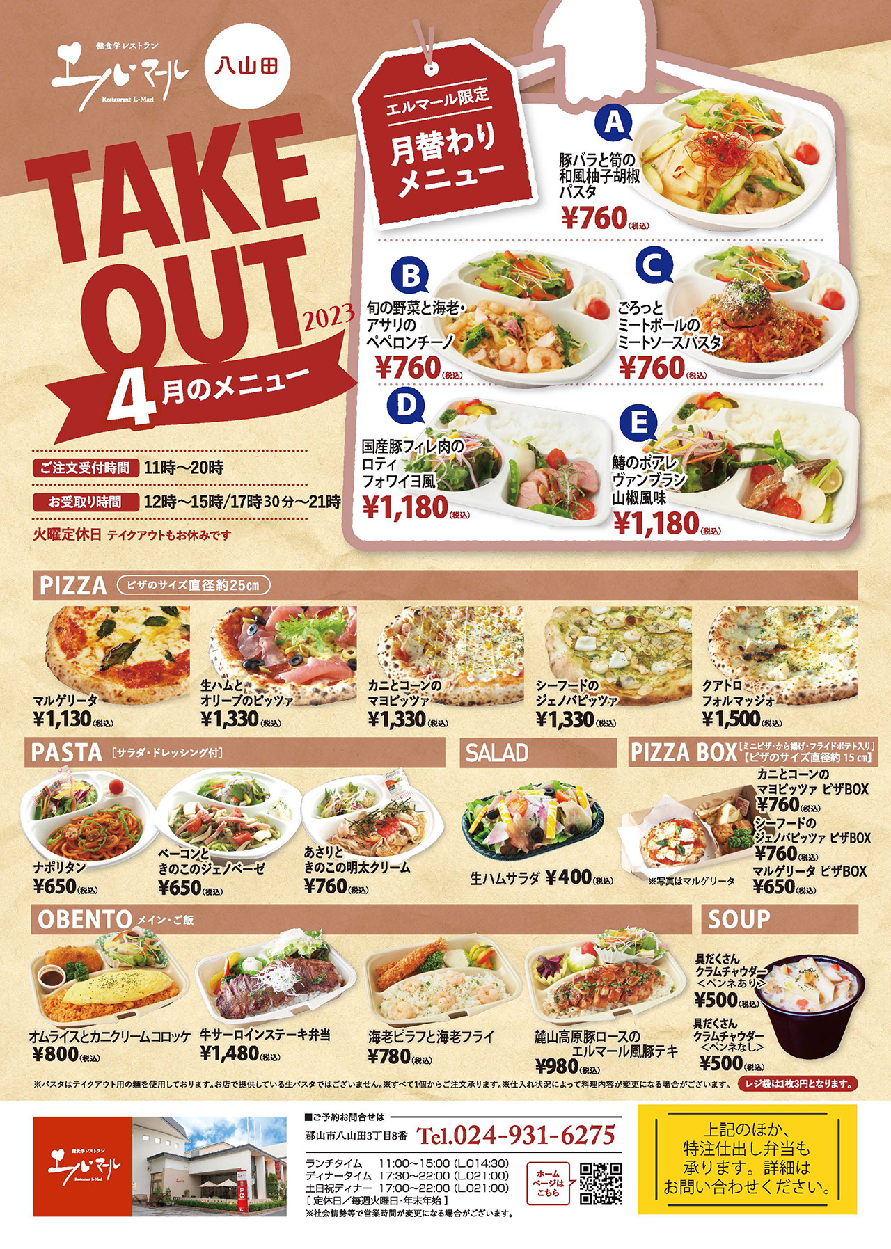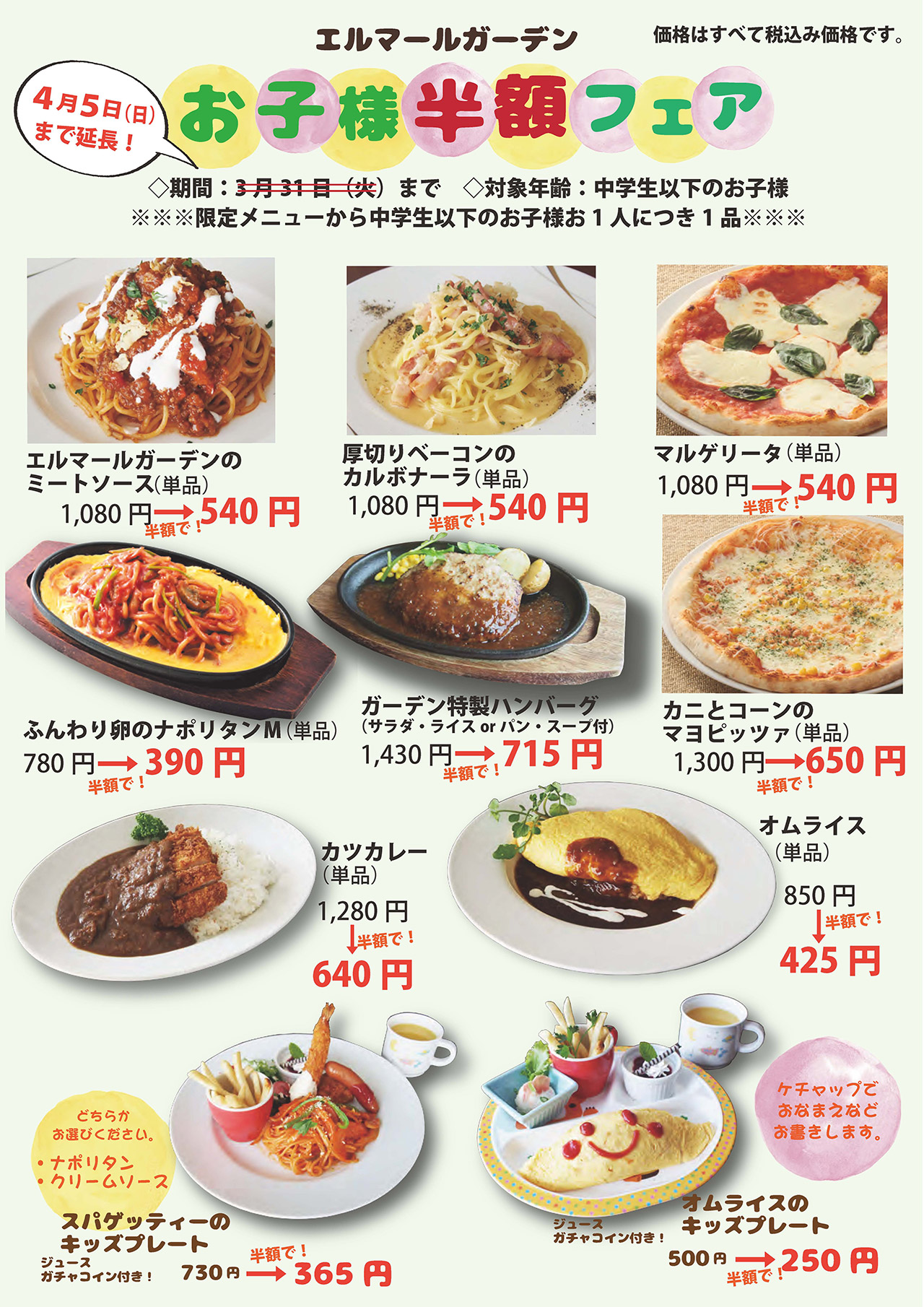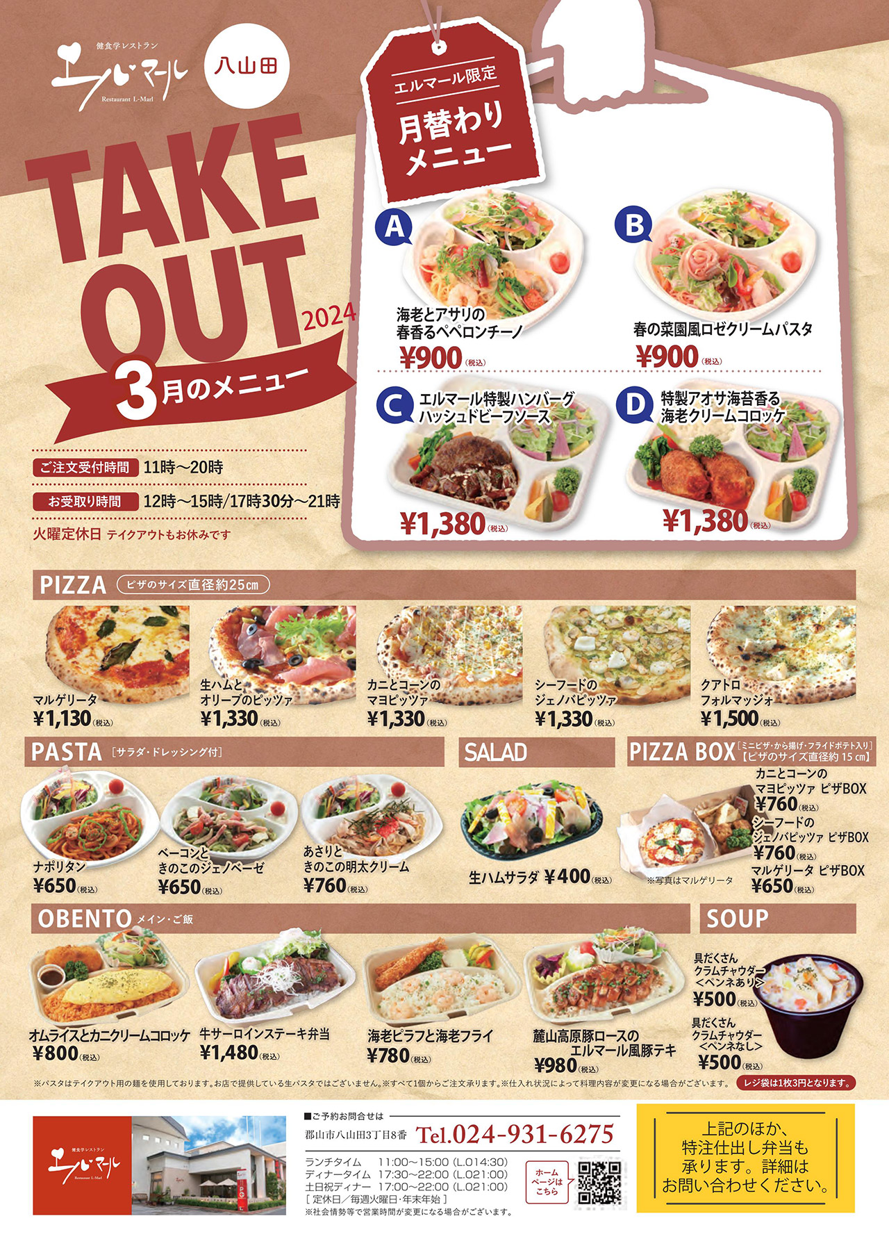 | 2024/3/28 | ★テイクアウトメニュー更新★ 【お持ち帰りできます】 【エルマール 4月のテイクアウトメニューはこちら】 | |