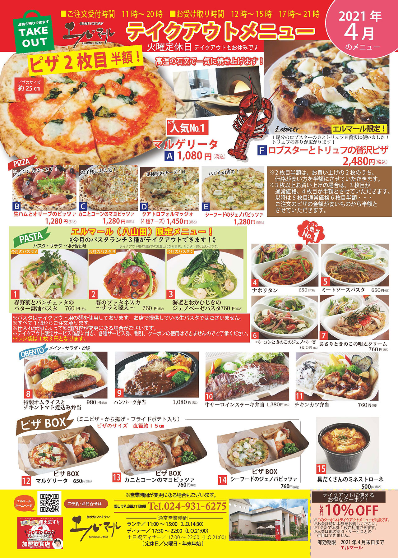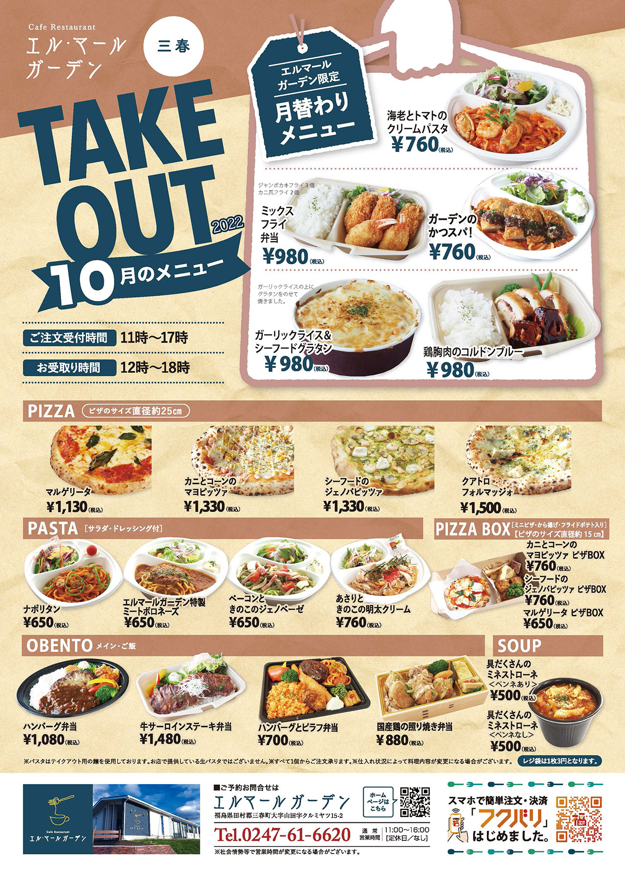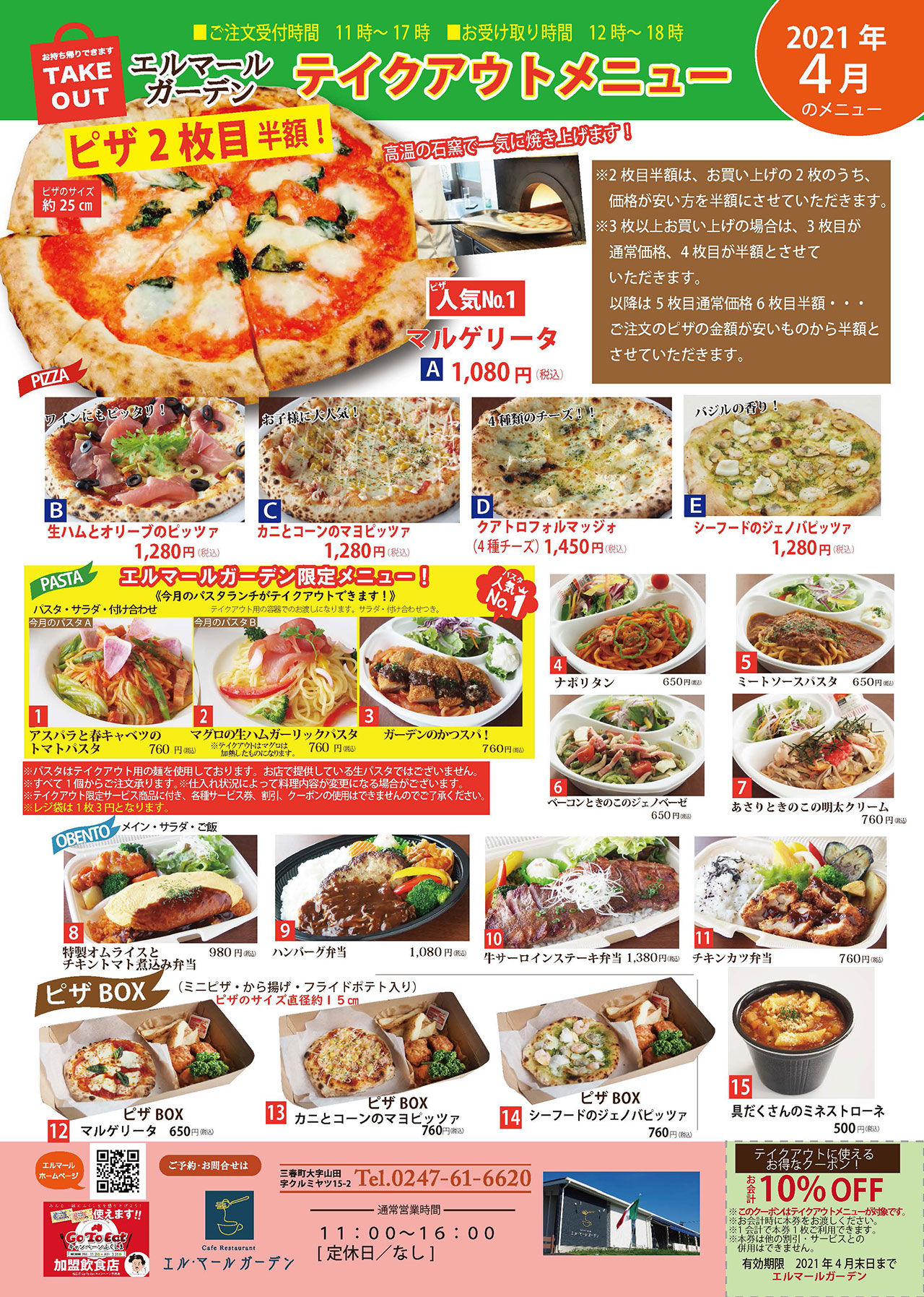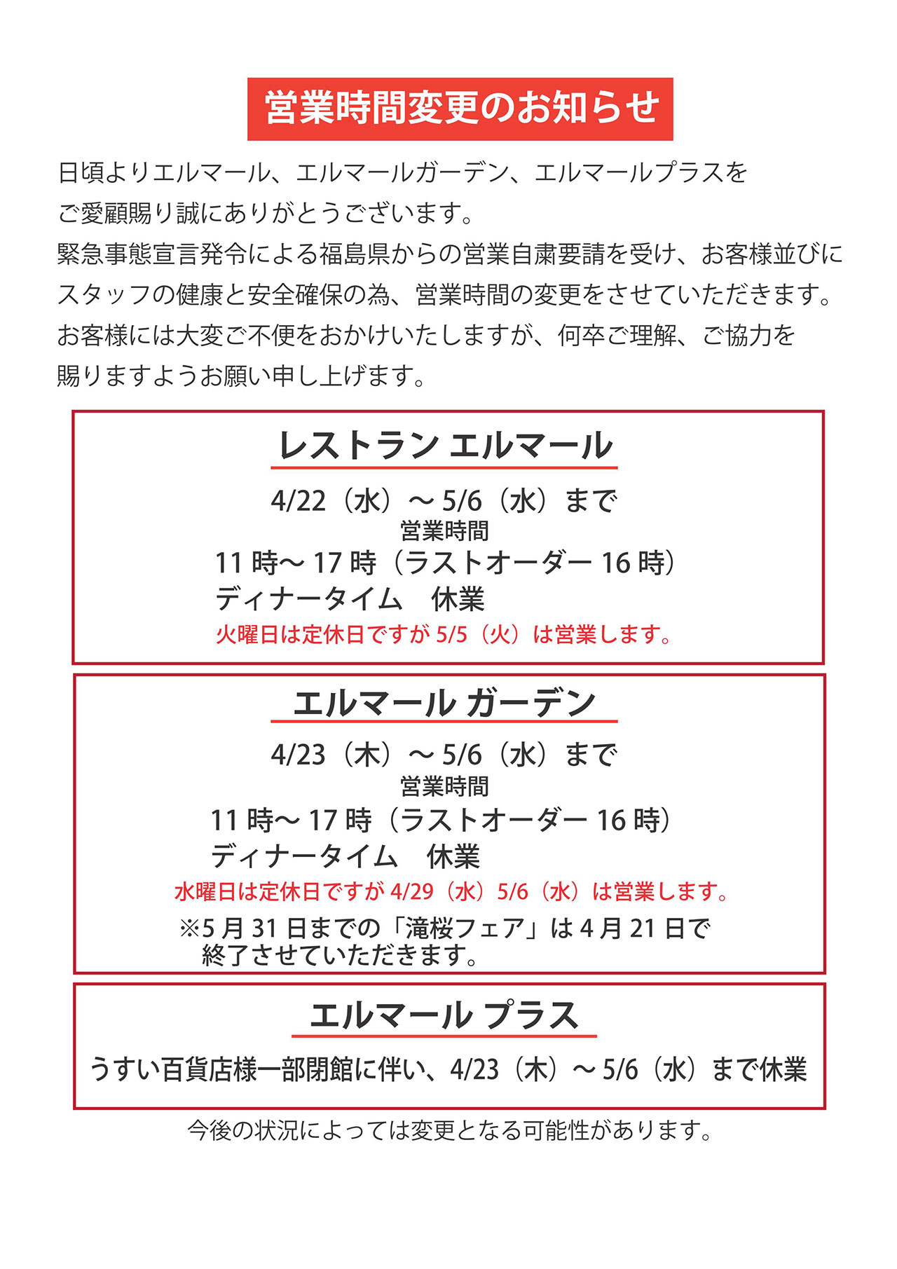 | 2024/3/28 | ★テイクアウトメニュー更新★ 【お持ち帰りできます】 【エルマール 4月のテイクアウトメニューはこちら】 | |