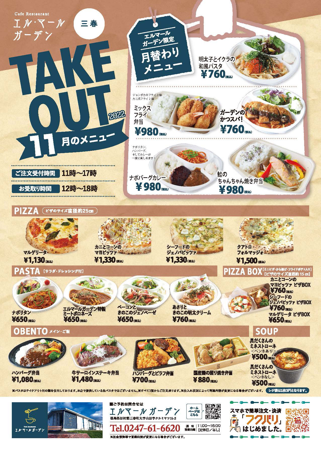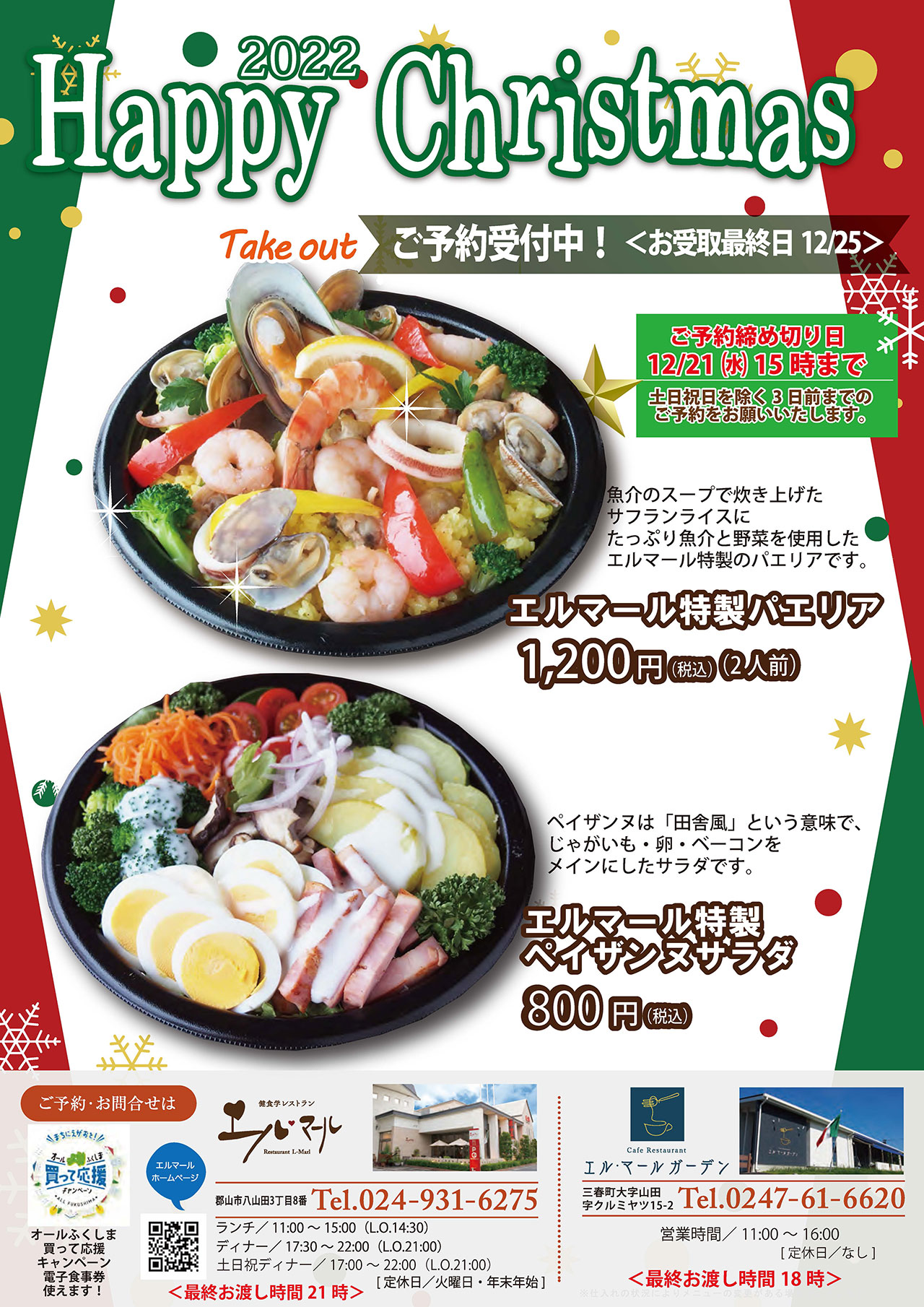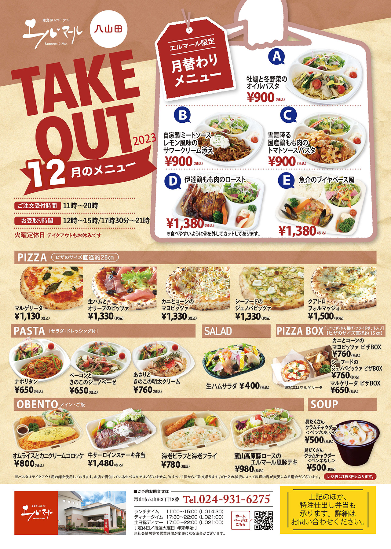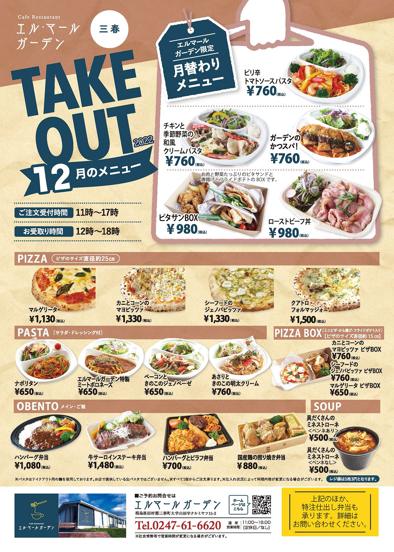 | 2023/11/28 | ★テイクアウトメニュー更新★ 【お持ち帰りできます】 【エルマール 12月のテイクアウトメニューはこちら】 | |