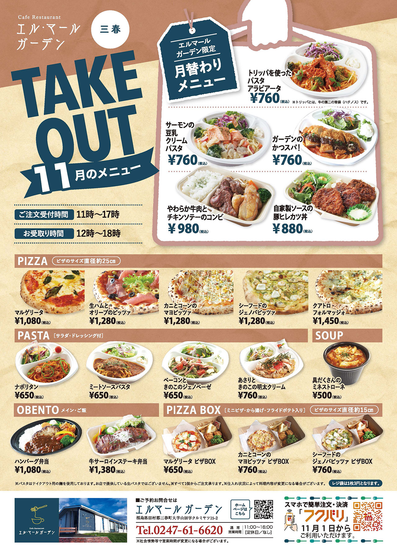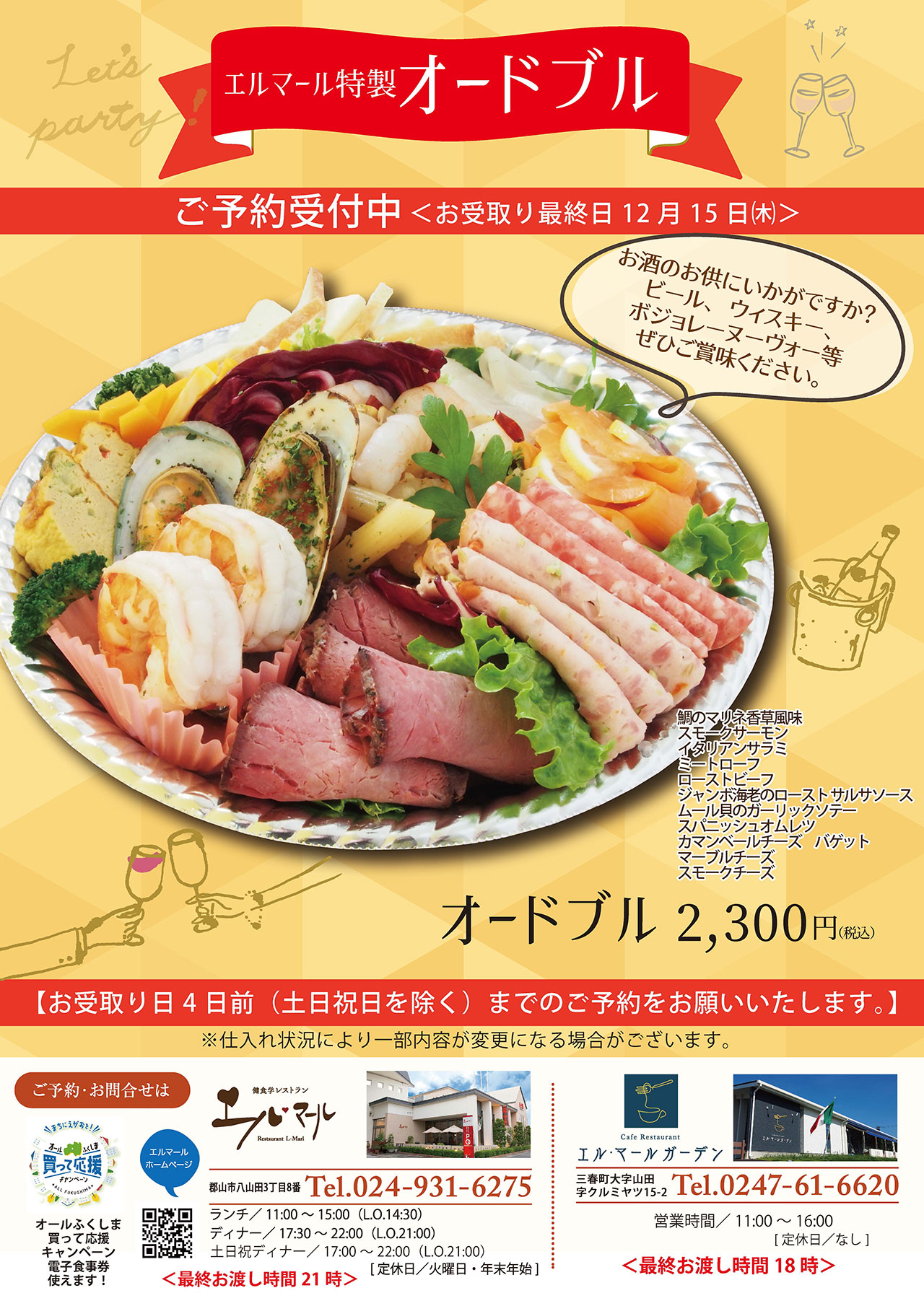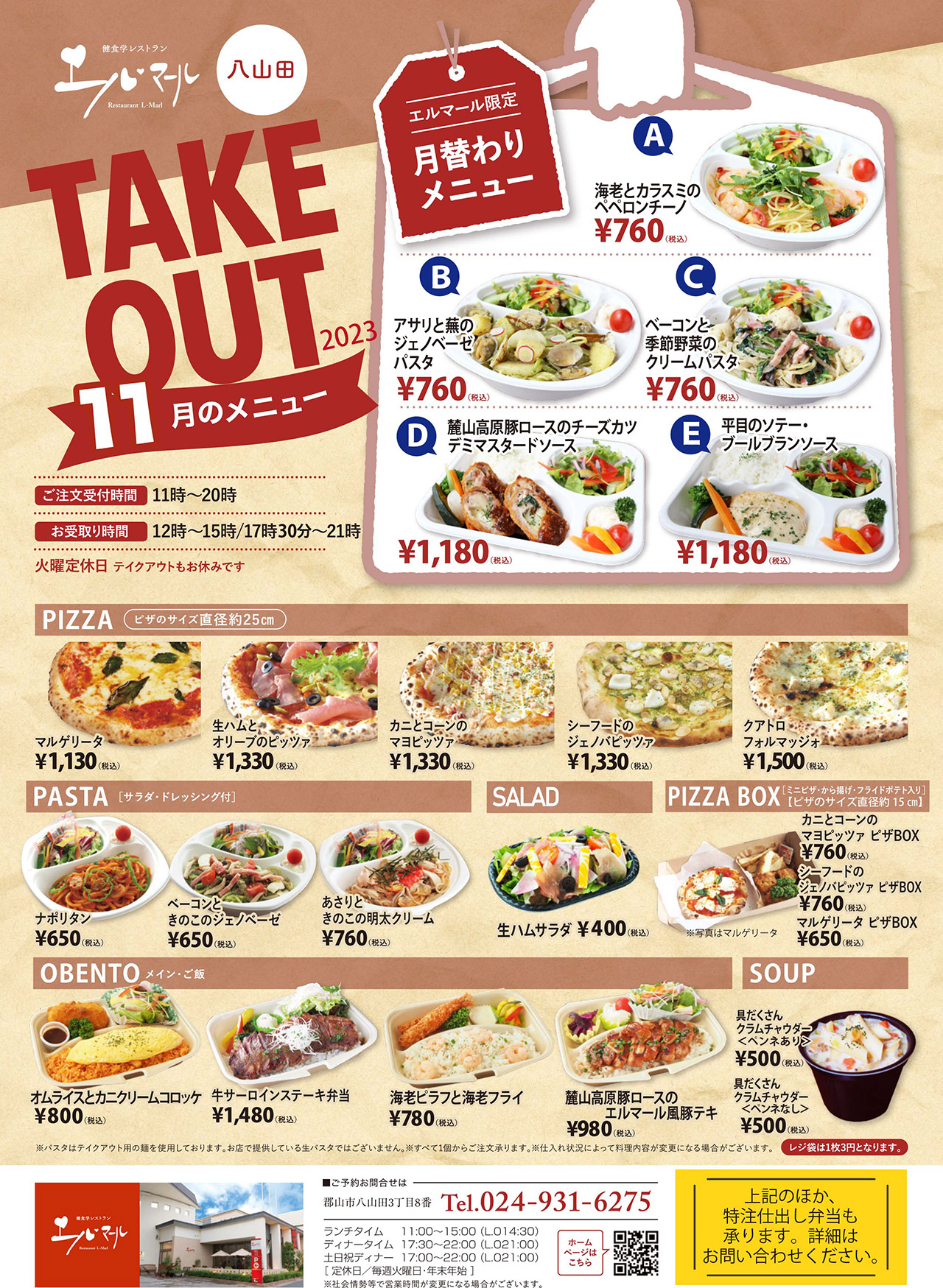| 2023/11/28 | ★テイクアウトメニュー更新★ 【お持ち帰りできます】 【エルマール 12月のテイクアウトメニューはこちら】 | |