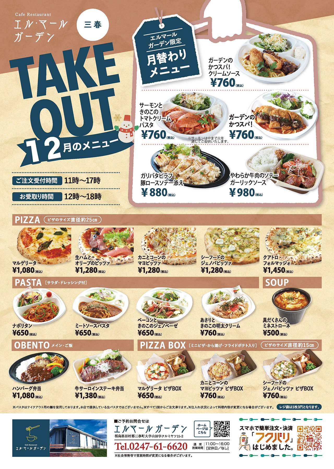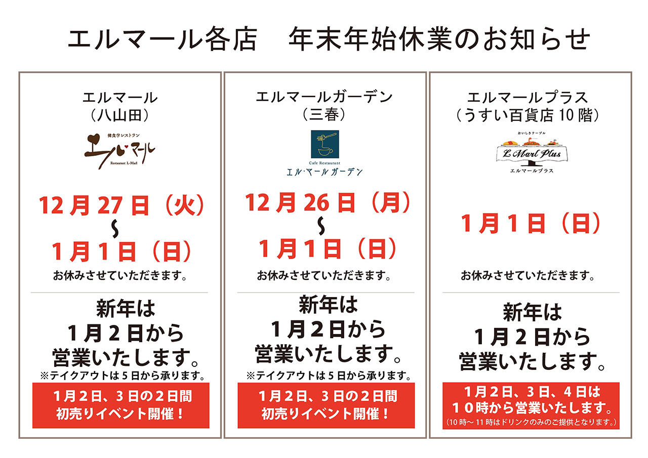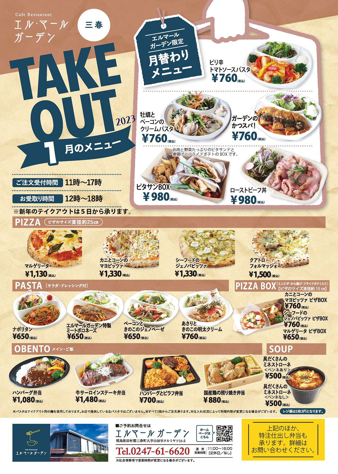 | 2023/12/26 | ★テイクアウトメニュー更新★ 【お持ち帰りできます】 【エルマール 1月のテイクアウトメニューはこちら】 | |