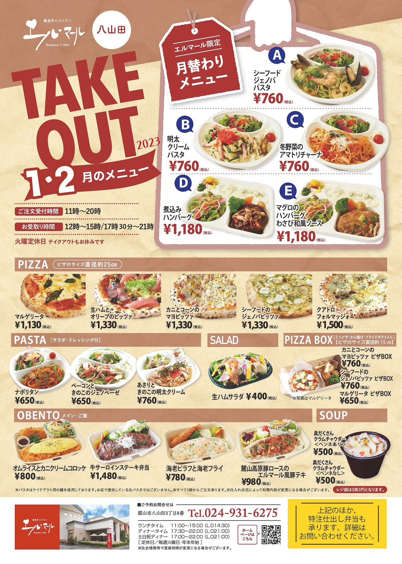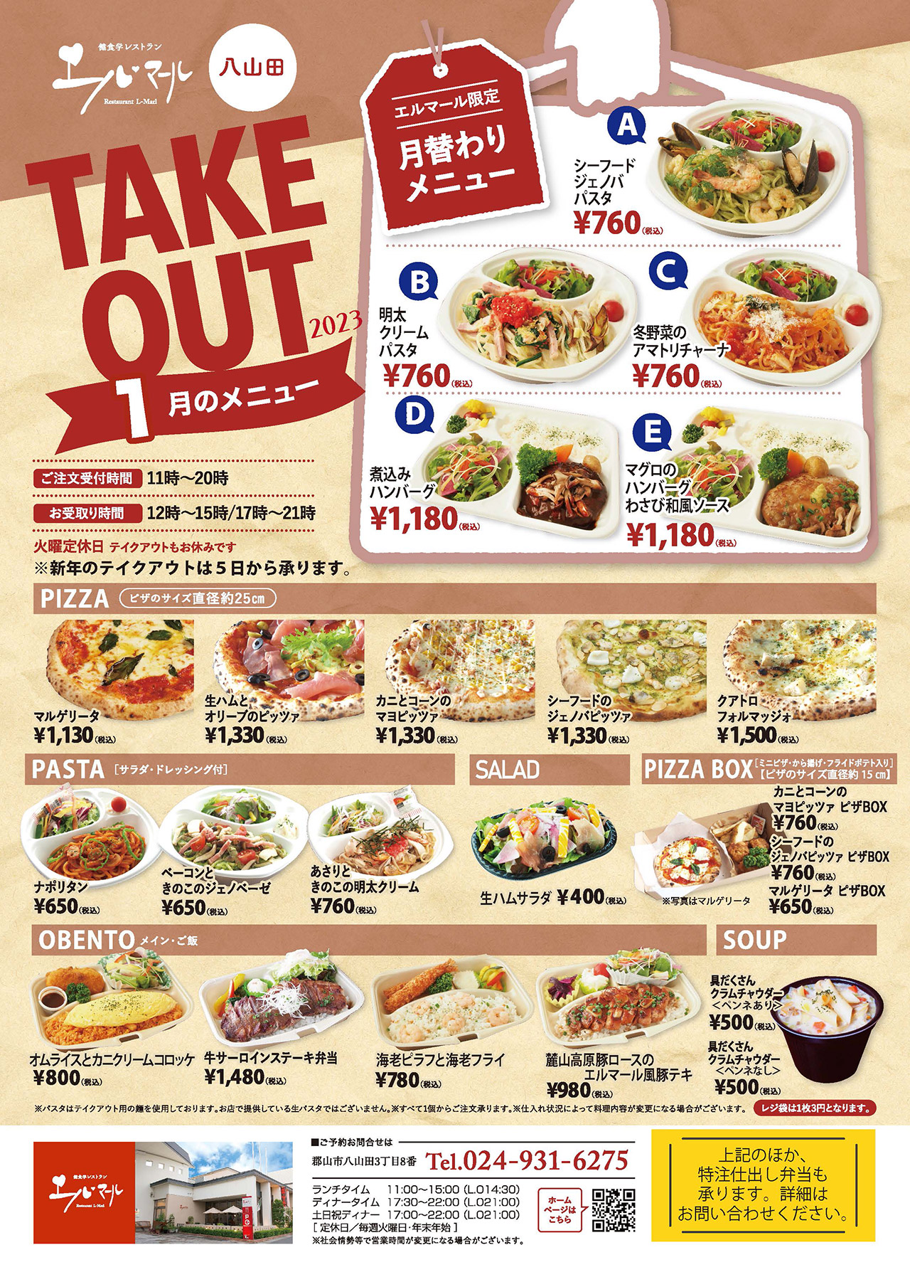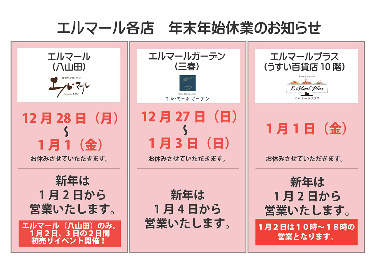 | 2023/12/26 | ★テイクアウトメニュー更新★ 【お持ち帰りできます】 【エルマール 1月のテイクアウトメニューはこちら】 | |
