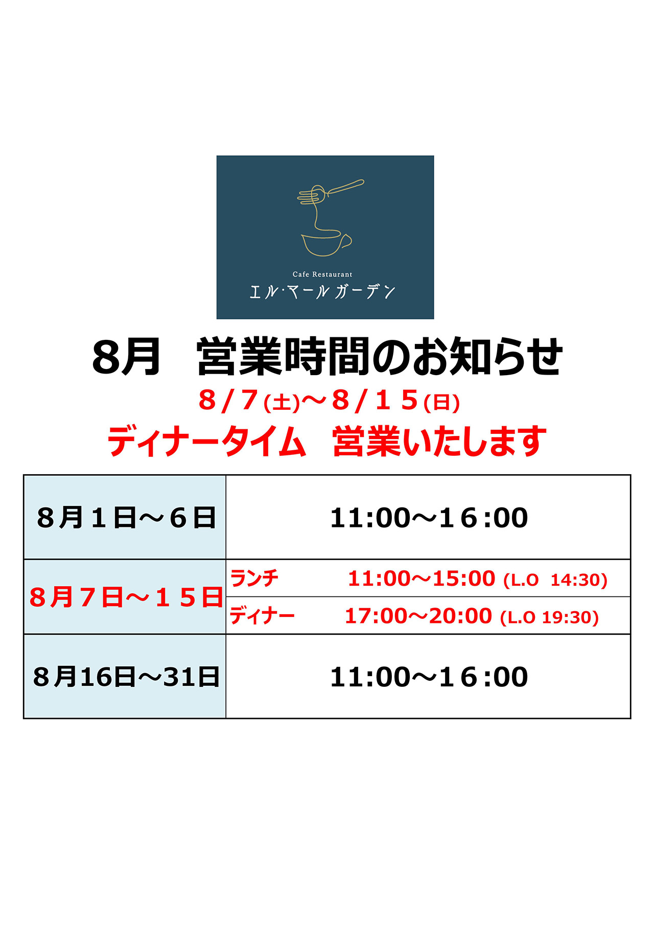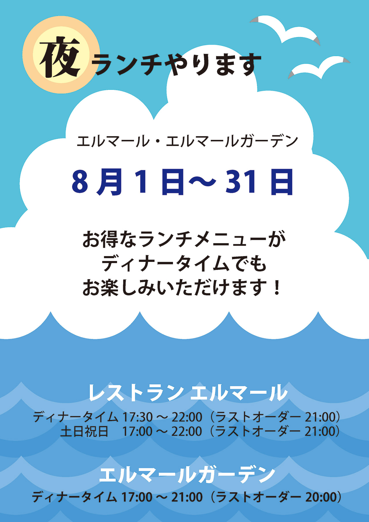 | 2019/7/29 | ★夜ランチやります★ お得なランチメニューがディナータイムでもお楽しみいただけます。(エルマール/エルマールガーデン) | |