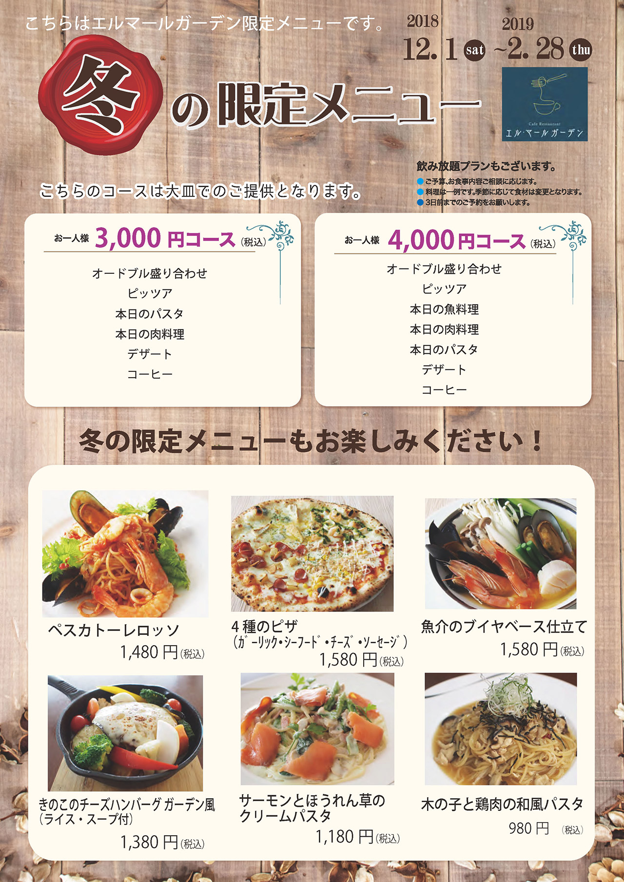 | 2018/12/3 | ★エルマールガーデン 冬の限定メニュー★ エルマールガーデン限定のメニューをお楽しみください。 | |