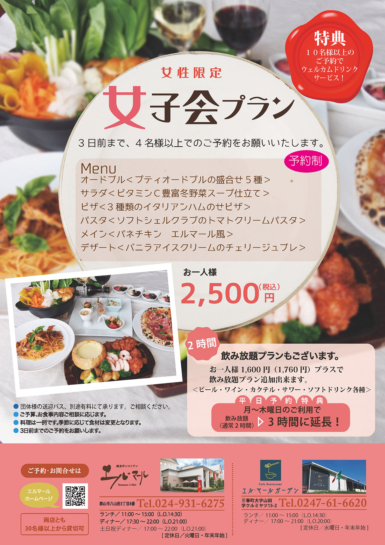 | 2024/11/22 | ★エルマールが贈る「冬の宴会プラン」★ 忘新年会や歓送迎会に。ご予約承り中 | |