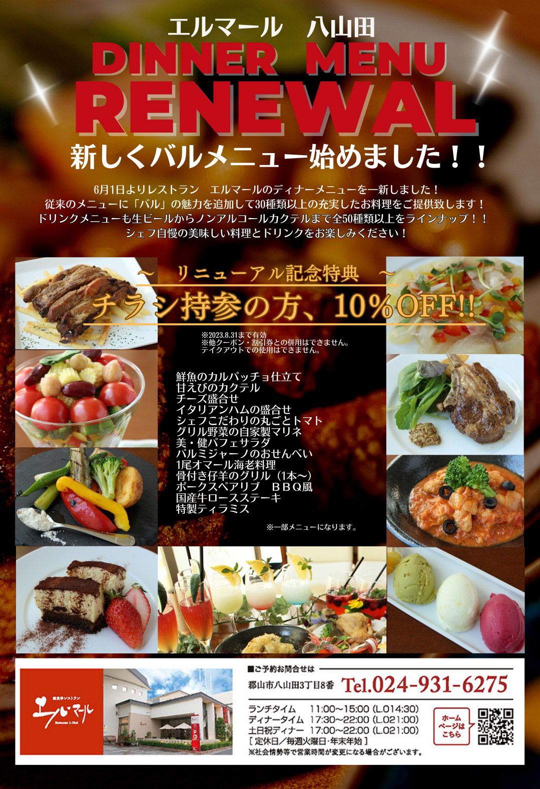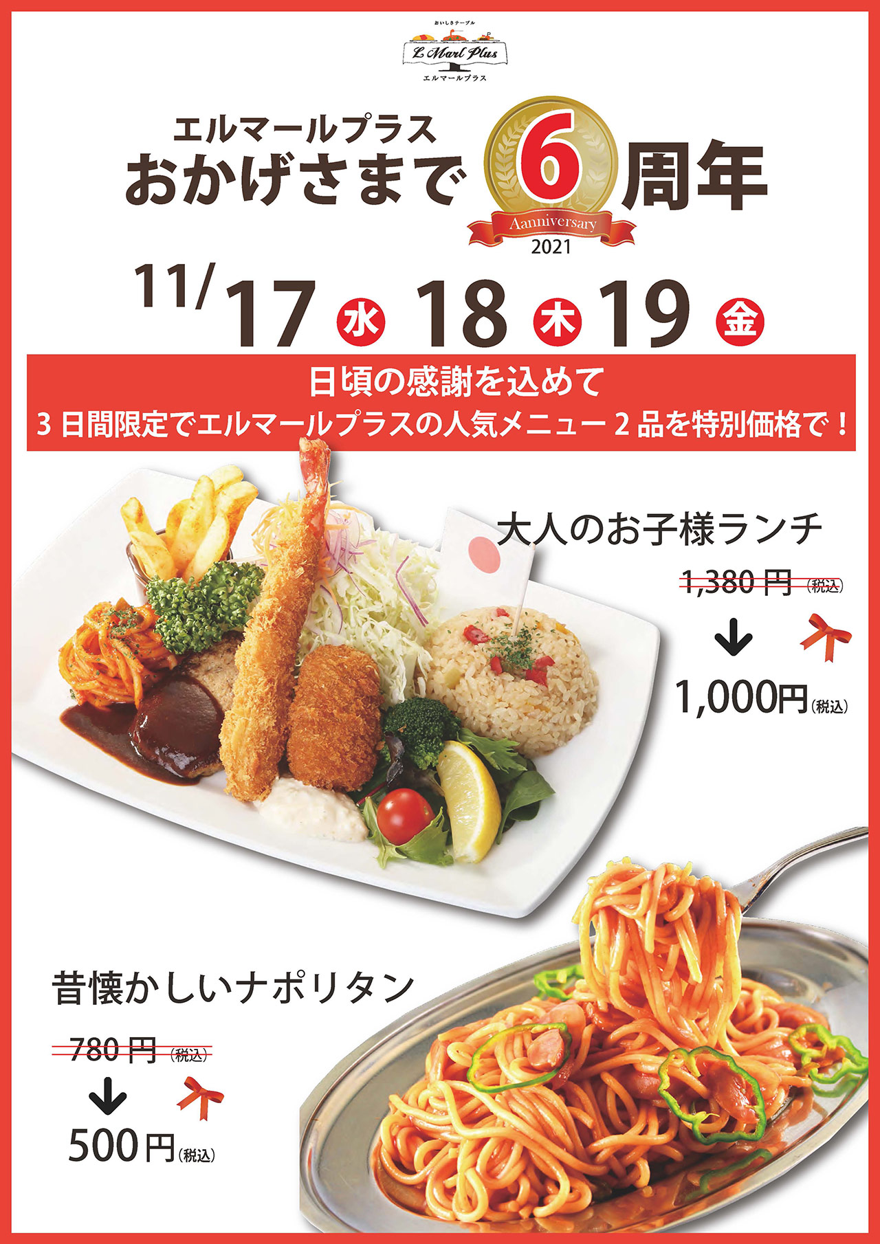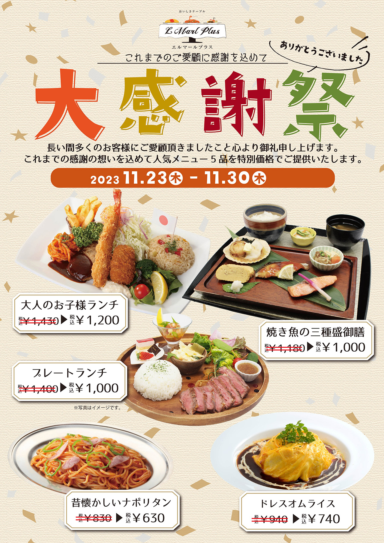 | 2023/11/21 | ★エルマールプラス 大感謝祭★ これまでのご愛顧に感謝を込めて 長い間多くのお客様にご愛顧頂きましたこと心より御礼申し上げます。これまでの感謝の想いを込めて人気メニュー5品を特別価格でご提供いたします。 | |