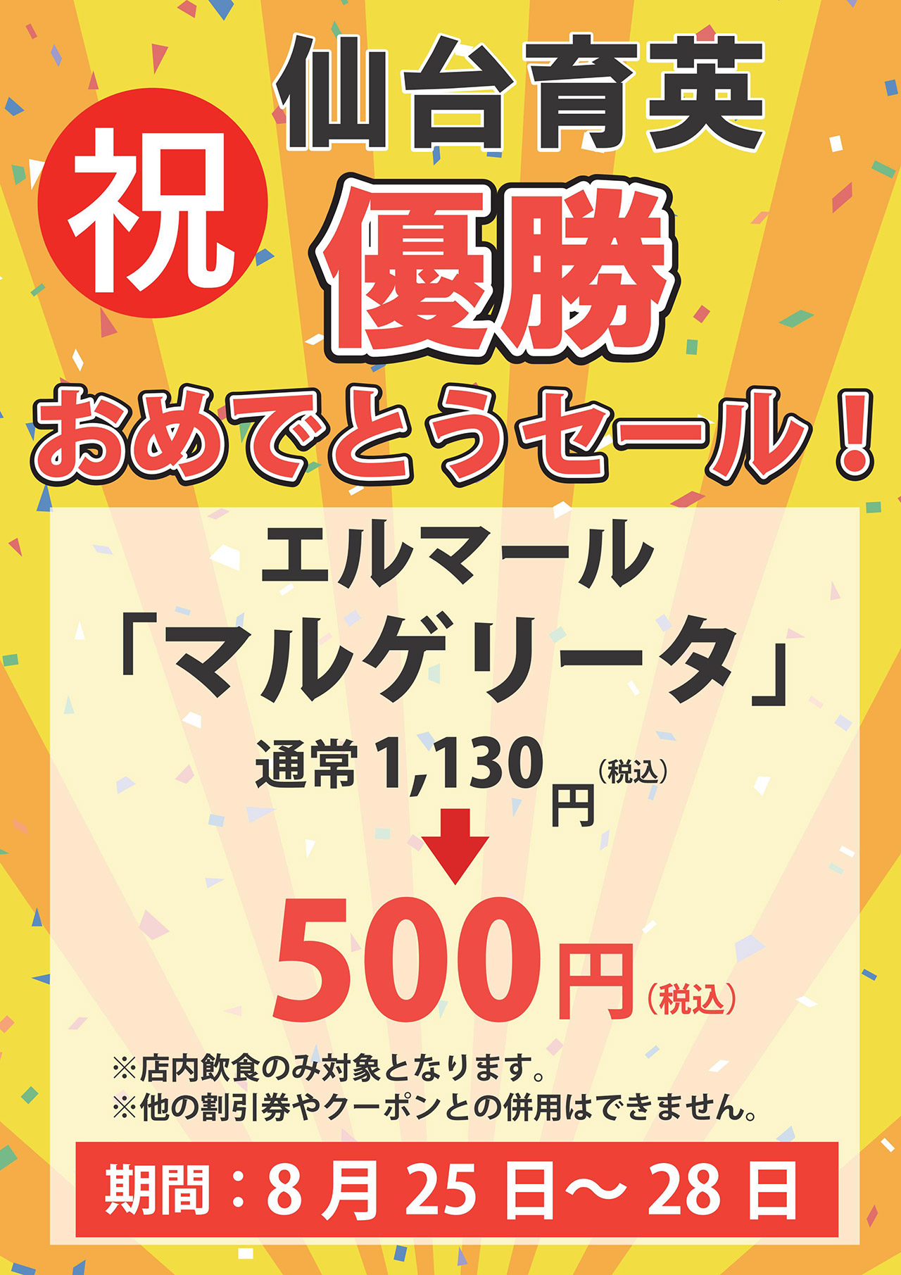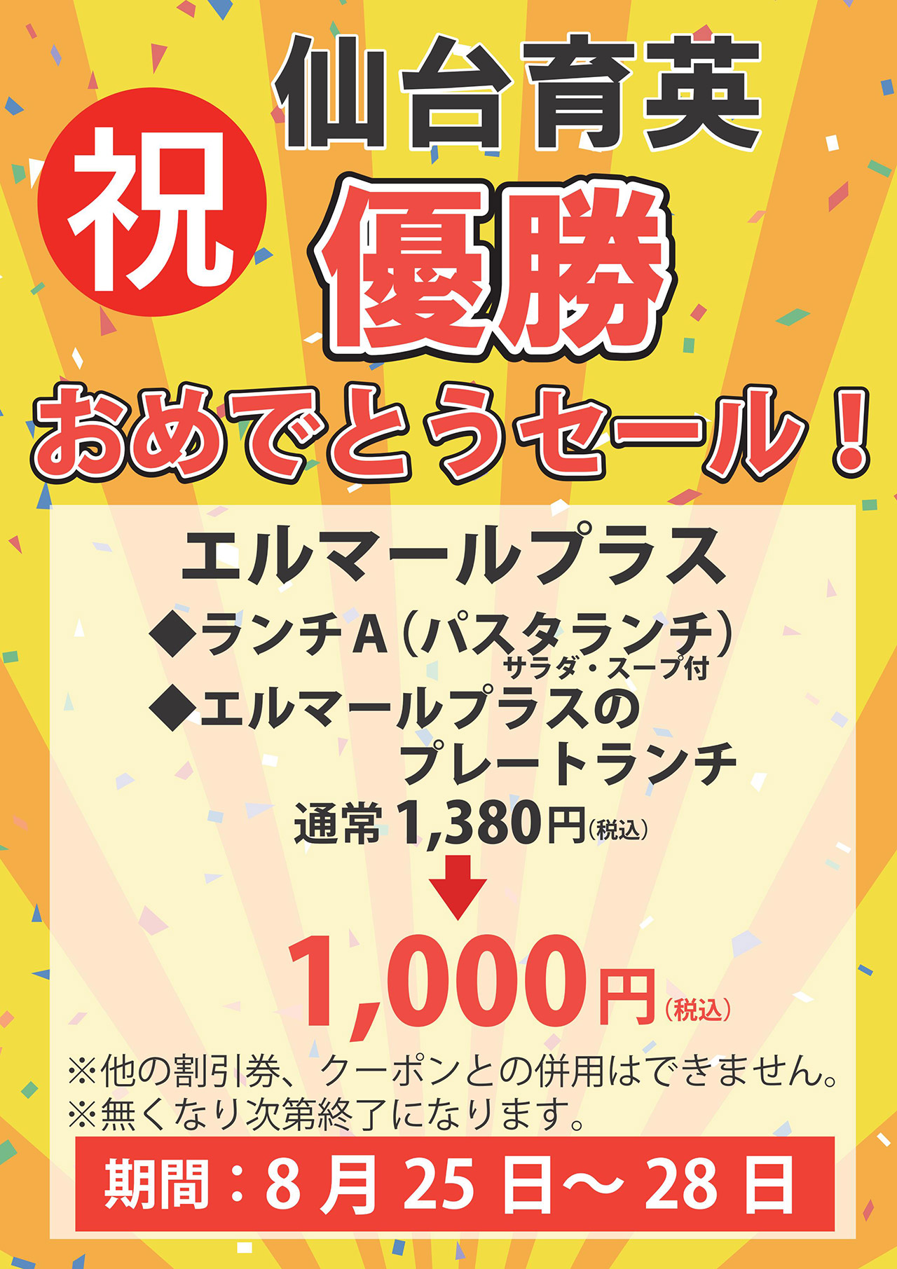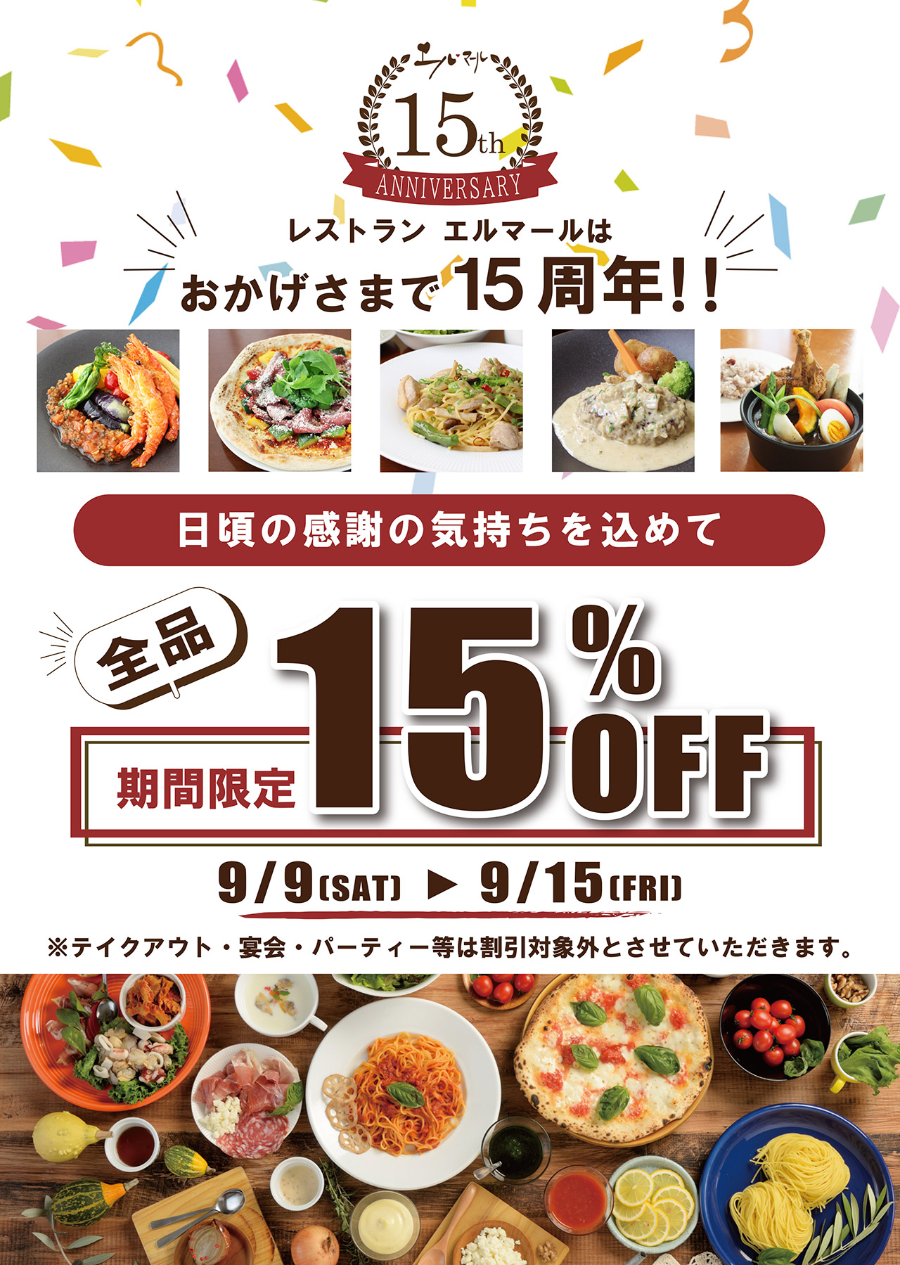 | 2023/11/21 | ★エルマールプラス 大感謝祭★ これまでのご愛顧に感謝を込めて 長い間多くのお客様にご愛顧頂きましたこと心より御礼申し上げます。これまでの感謝の想いを込めて人気メニュー5品を特別価格でご提供いたします。 | |