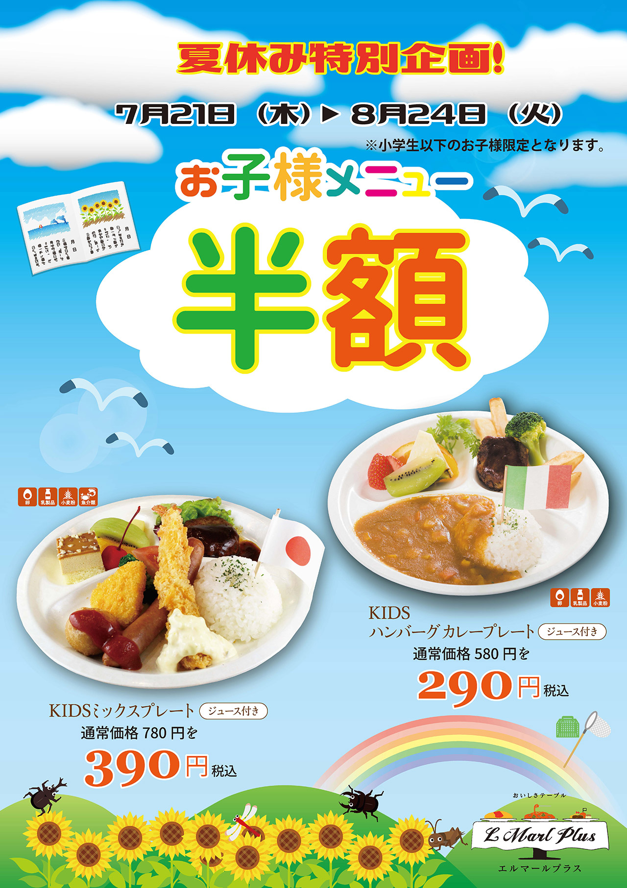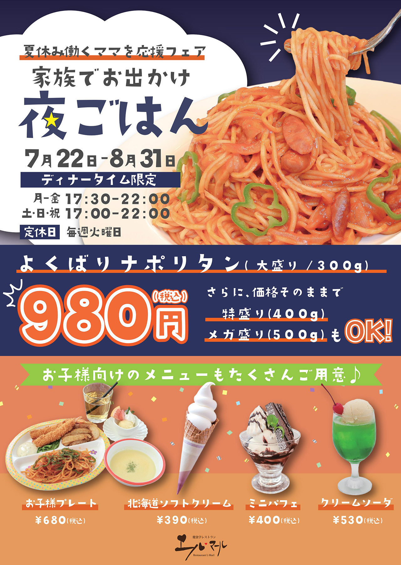 | 2024/7/18 | ★エルマール(八山田)★ 夏休み働くママを応援フェア 家族でお出かけ 夜ご飯 【期間限定】7月22日(月)~8月31日(土) ディナータイム限定 | |