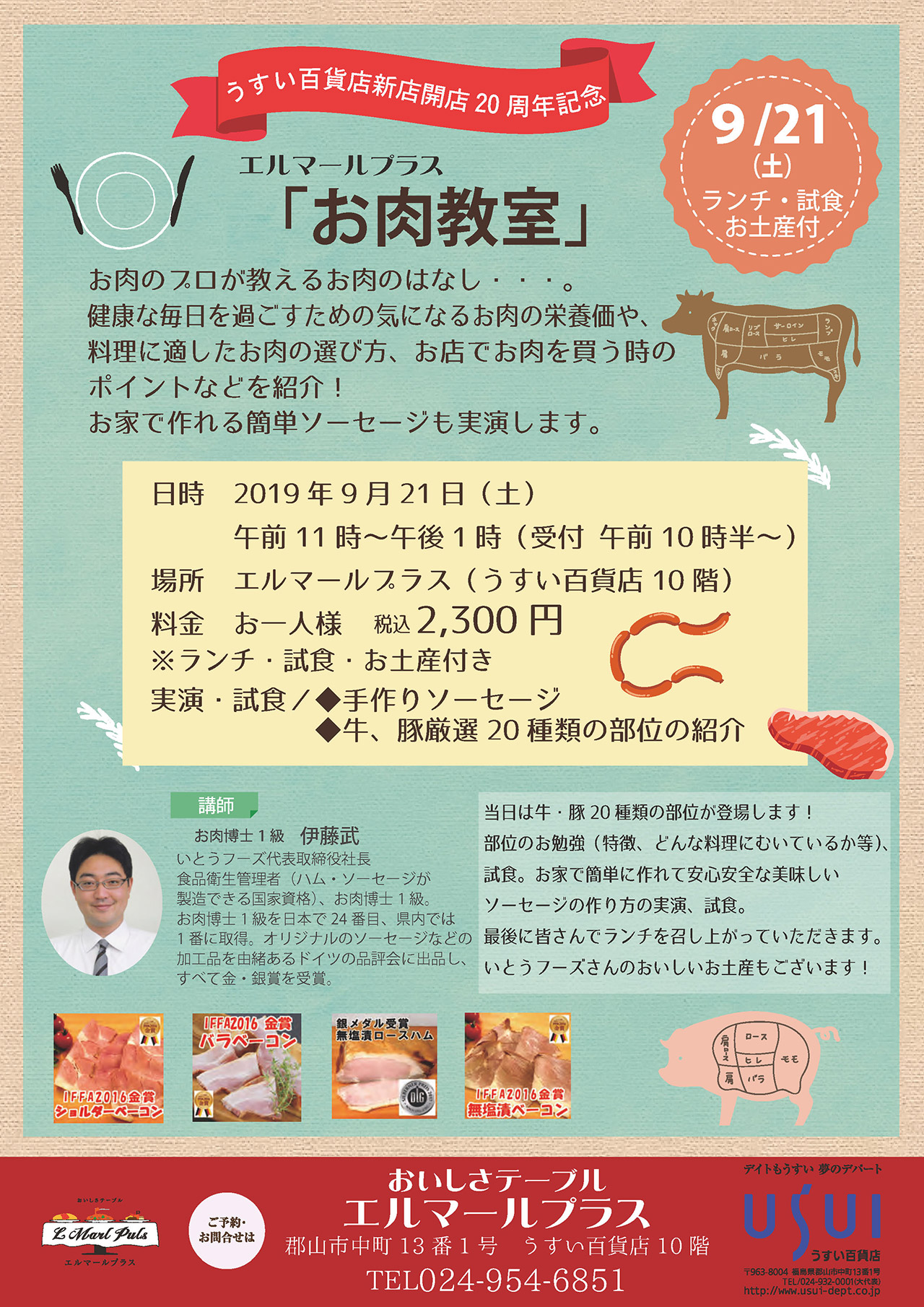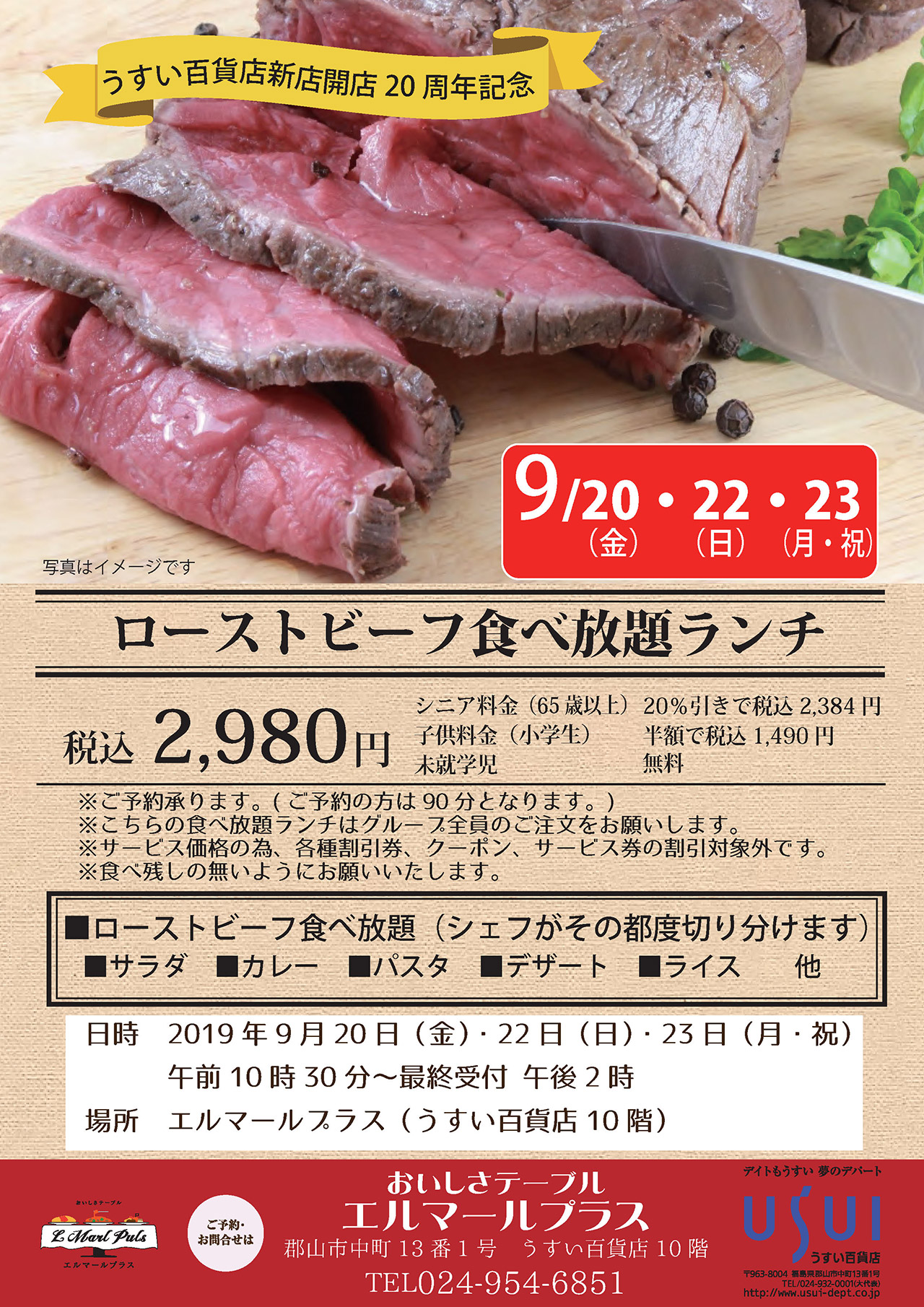 | 2019/9/9 | ★ローストビーフ食べ放題ランチ★ うすい百貨店新店開店20周年記念 | |