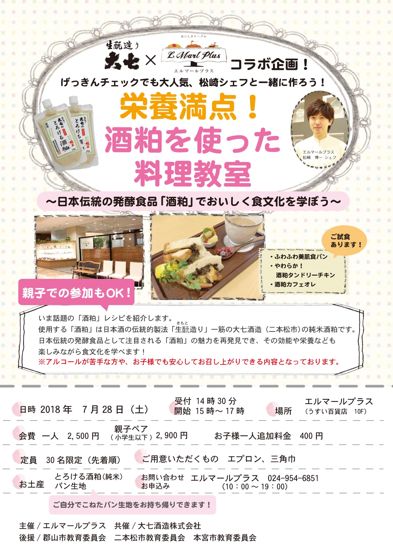 | 2018/6/27 | ★7/28 栄養満点!酒粕を使った料理教室★ げっきんチェックでも大人気、松崎シェフと一緒に作ろう!日本伝統の発酵食品「酒粕」でおいしく食文化を学ぼう | |