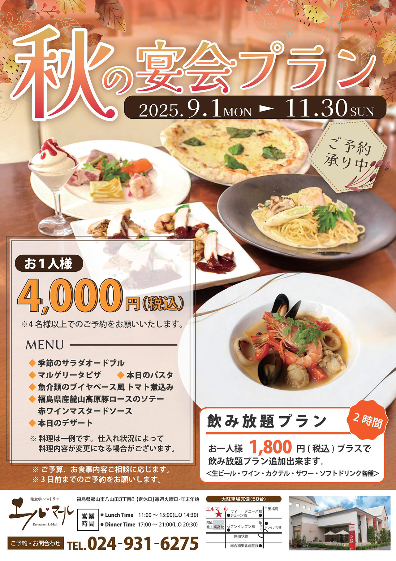 | 2025/8/29 | ★秋の宴会プラン★ 2025.9.1~11.30 | |