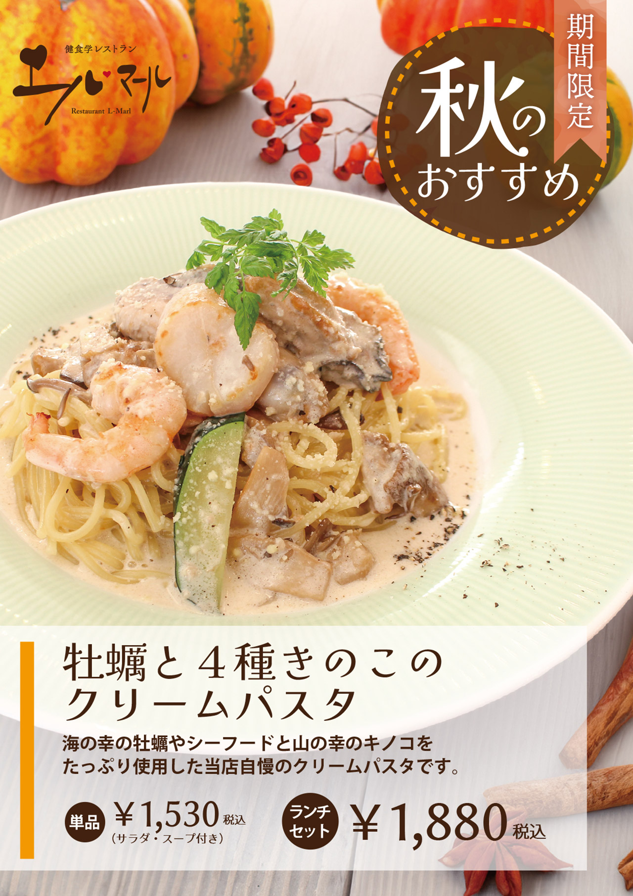 | 2024/10/1 | ★期間限定 秋のおすすめ★ 海の幸の牡蠣やシーフードと山の幸のキノコをたっぷり使用した当店自慢のクリームパスタです。 | |
