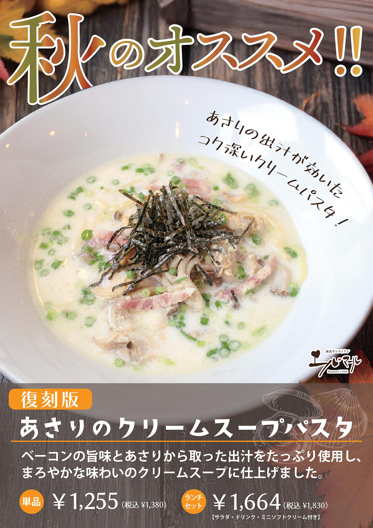 | 2025/9/9 | ★秋のオススメ!!★ あさりの出汁が効いたコク深いクリームパスタ! | |