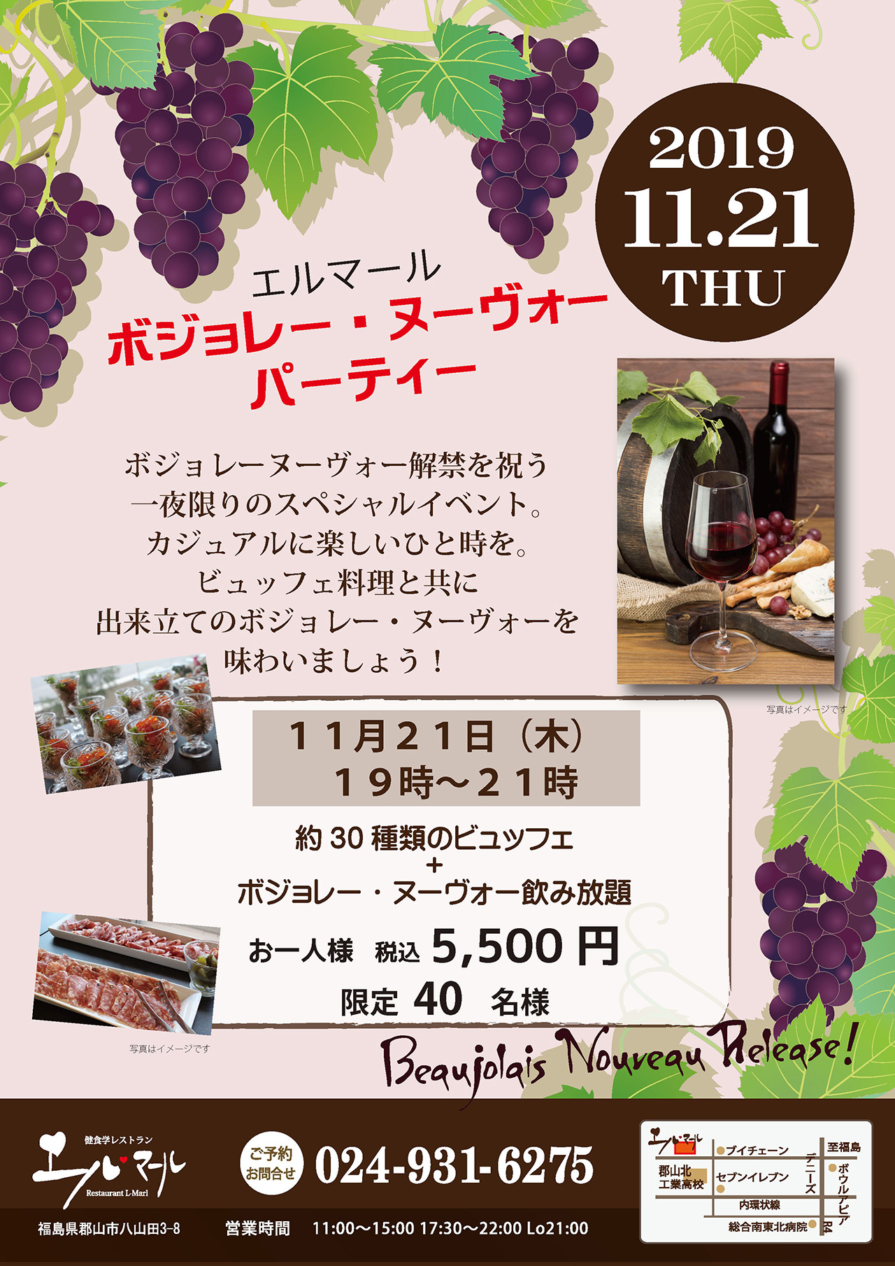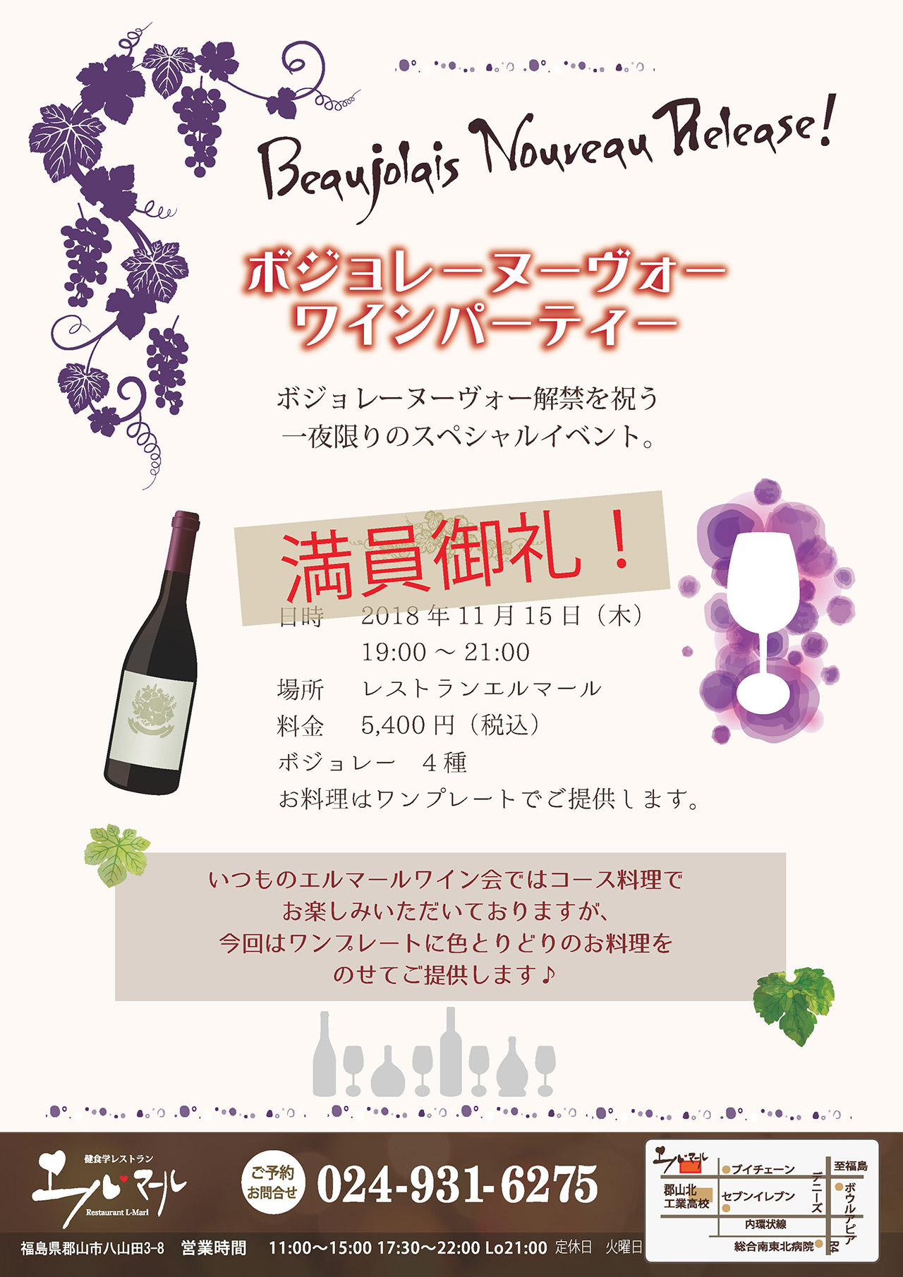 | 2018/11/12 | ★ボージョレヌーヴォーワインパーティー★ 予約満員となりました。 ボージョレヌーヴォー解禁を祝う一夜限りのスペシャルイベント。 2018年11月15日(木)19:00~21:00 | |