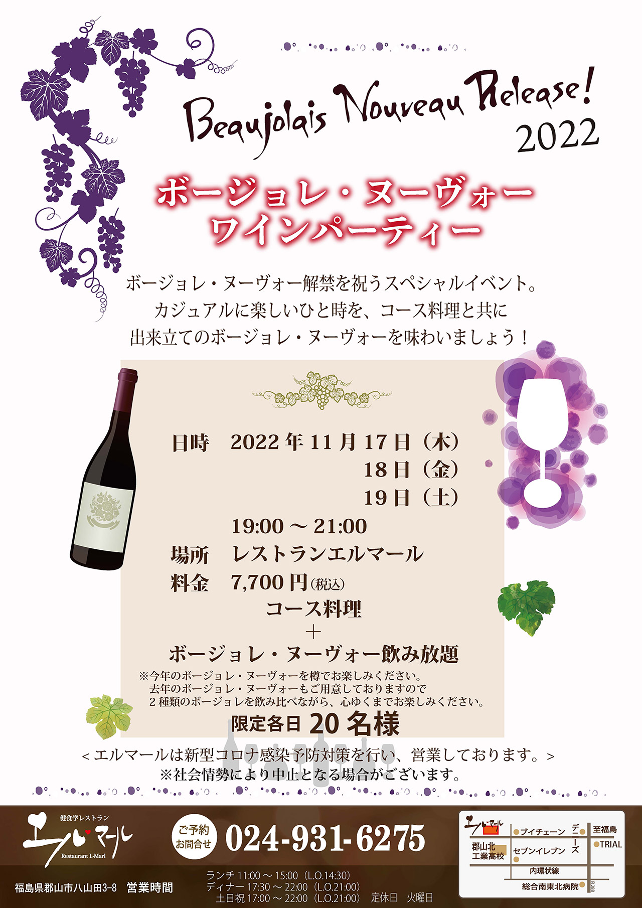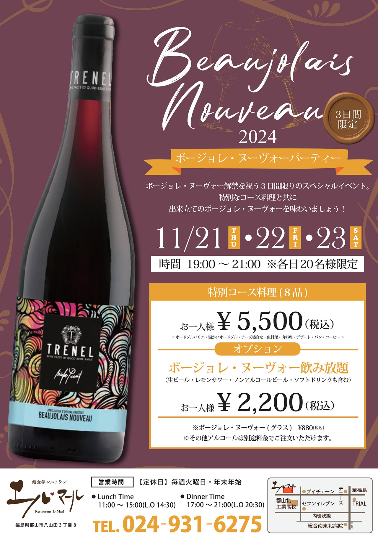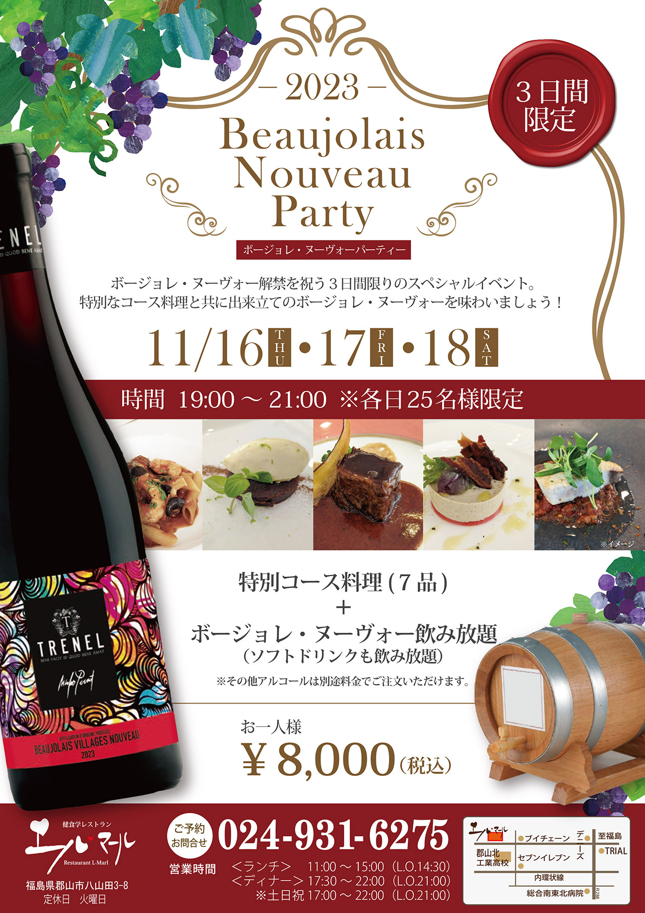 | 2024/10/31 | ★ボージョレ・ヌーヴォーワインパーティー★ 各日20名様限定 2024年11月21日(木)22日(金)23日(土) 19:00~21:00 | |