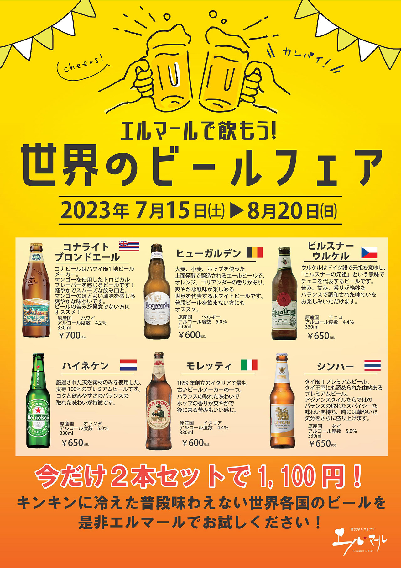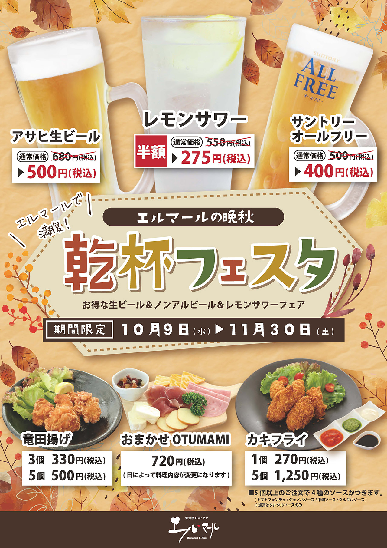 | 2024/10/7 | ★エルマールの晩秋 乾杯フェスタ★ お得な生ビール&ノンアルビール&レモンサワーフェア | |