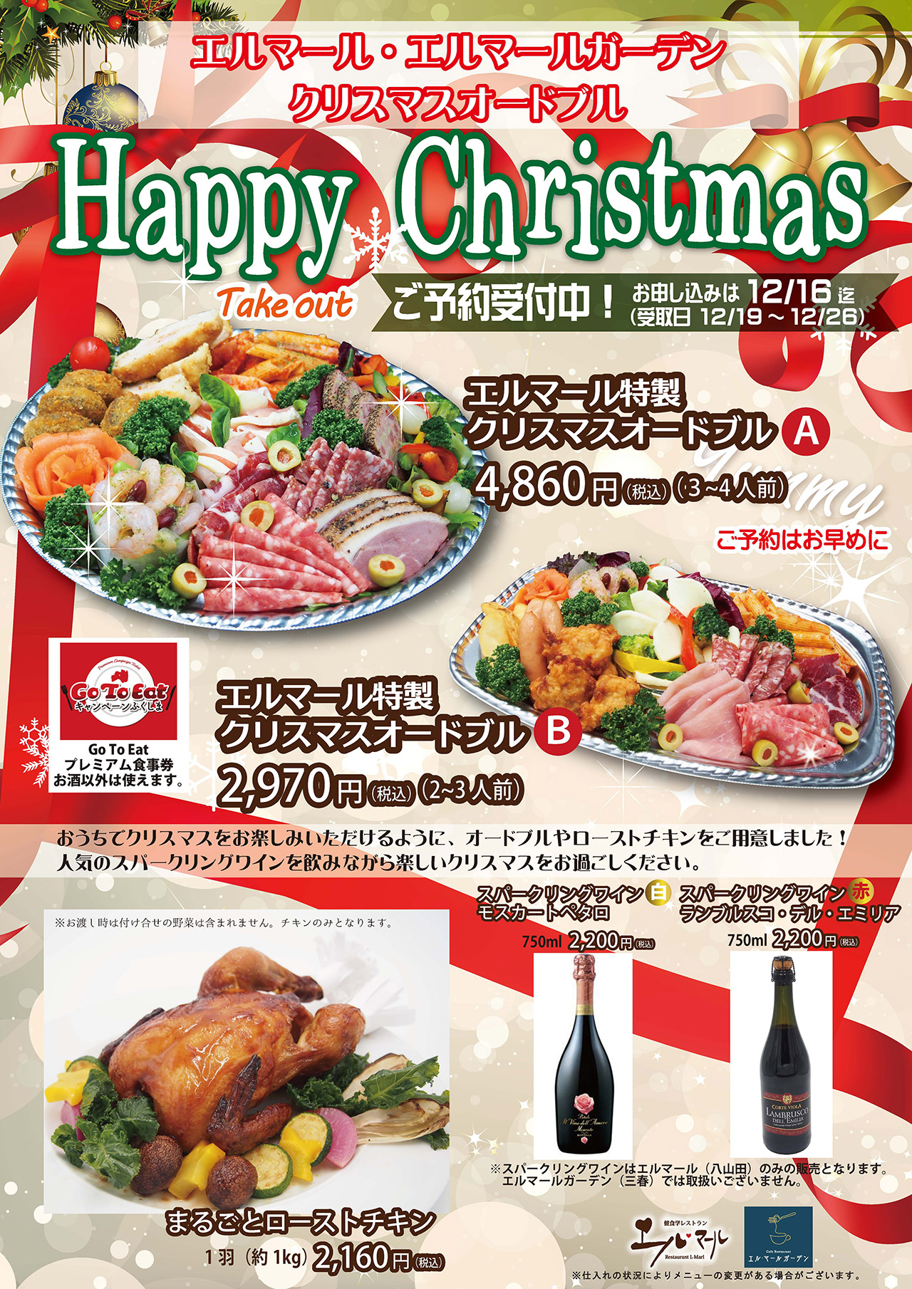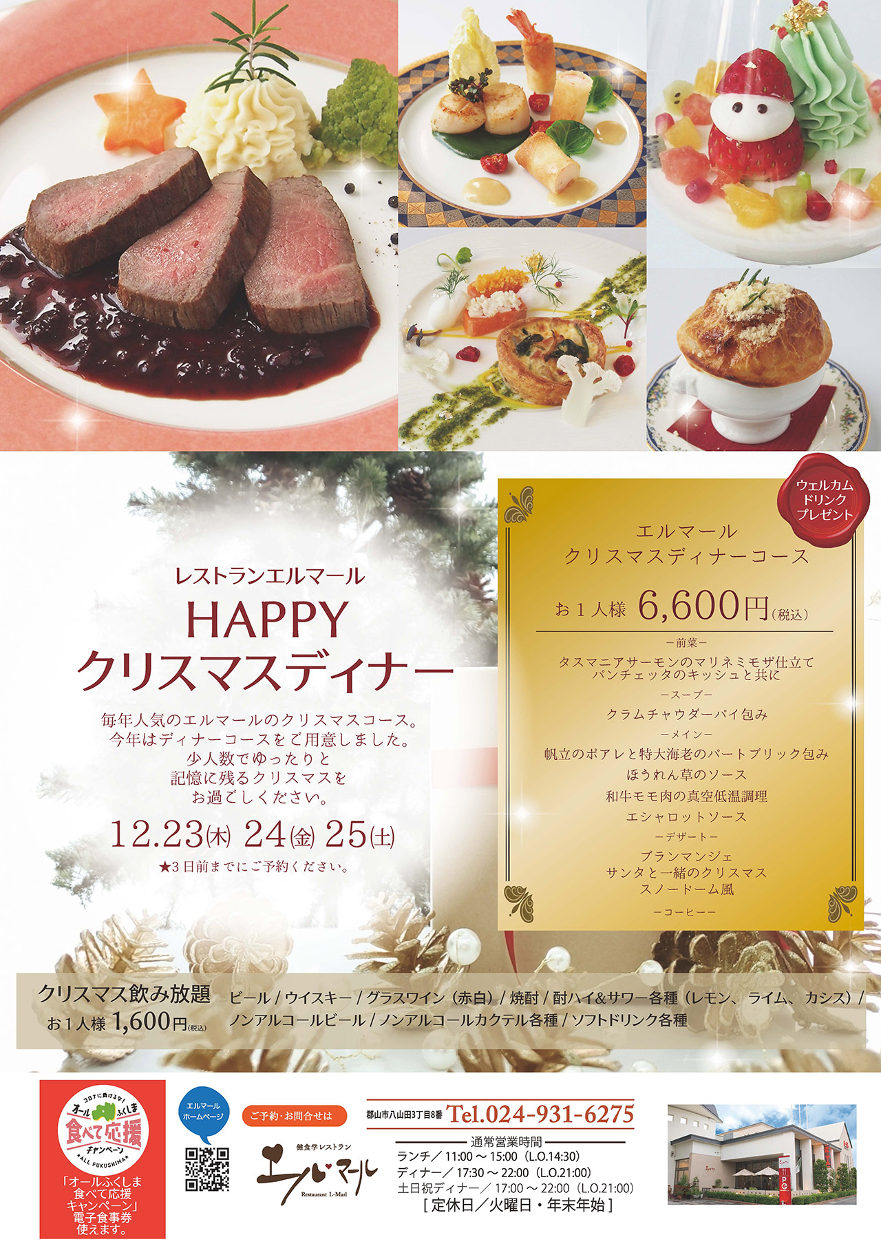 | 2023/11/16 | ★エルマール HAPPYクリスマスディナー2023★ 毎年人気の特別な夜に贈るエルマールのクリスマスコースです。 | |