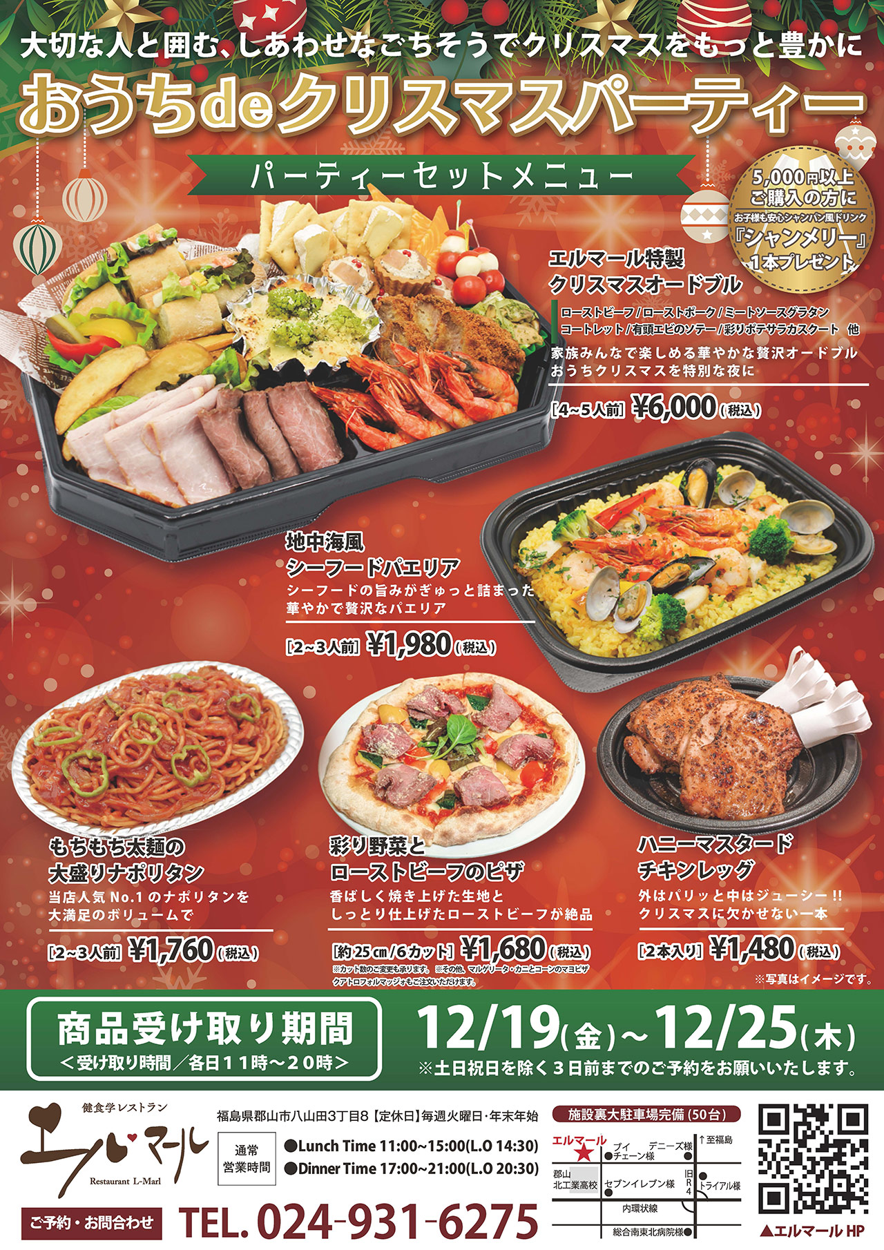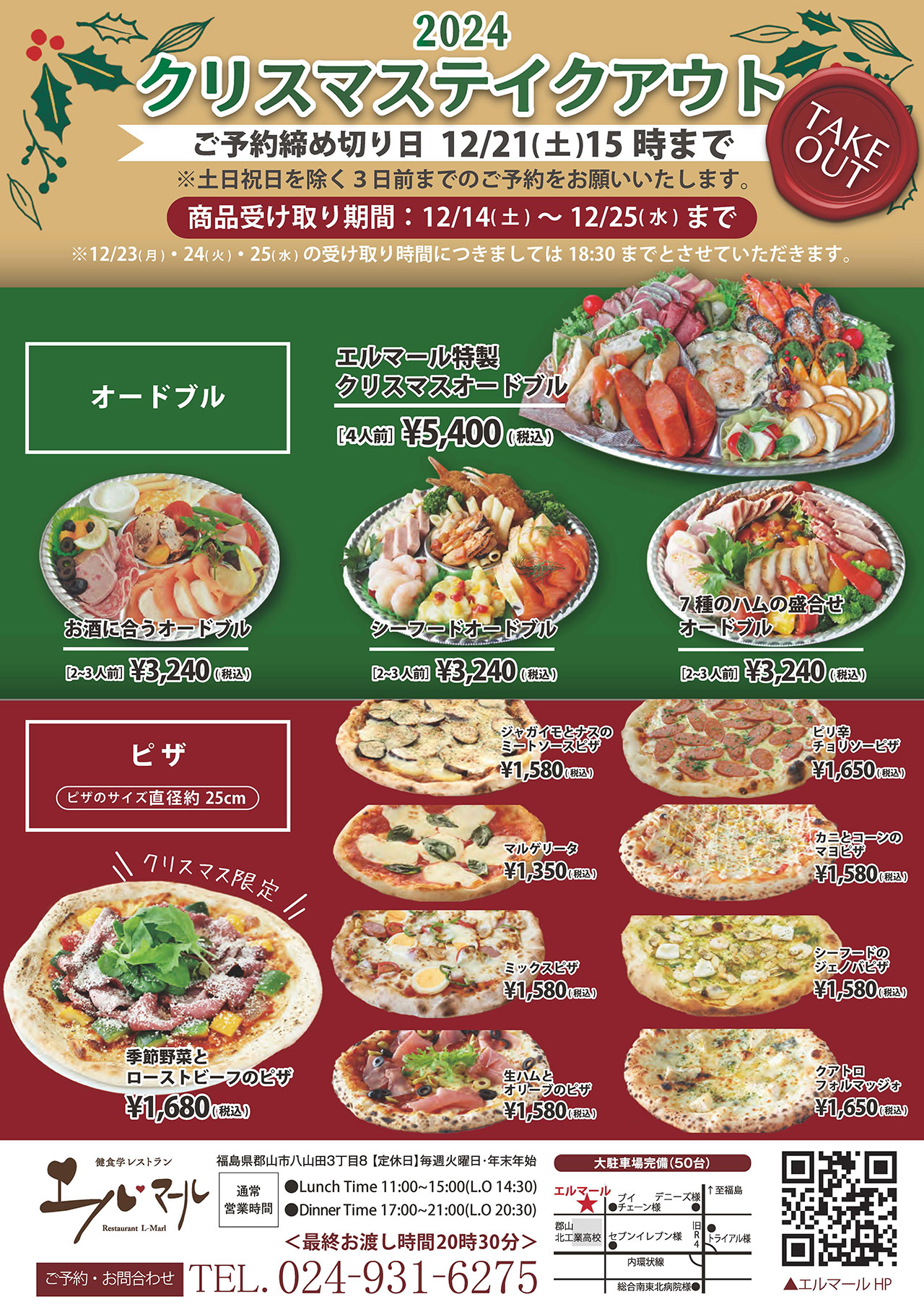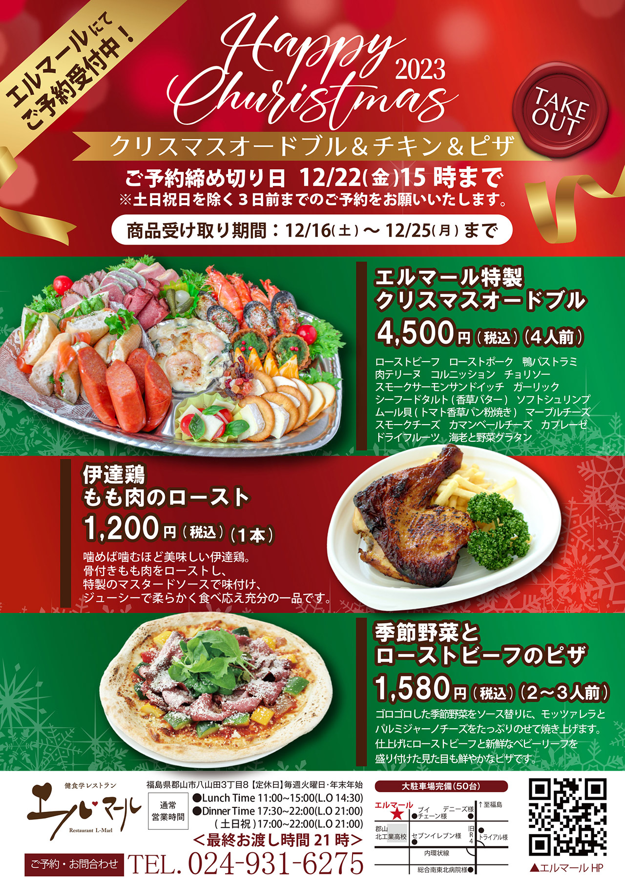 | 2024/12/5 | ★2024クリスマステイクアウト★ ご予約締め切リ日 12/21(土) 15時まで | |