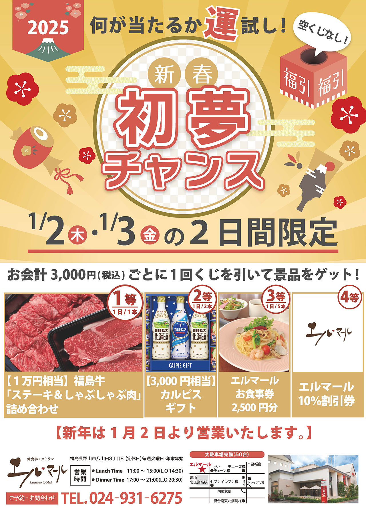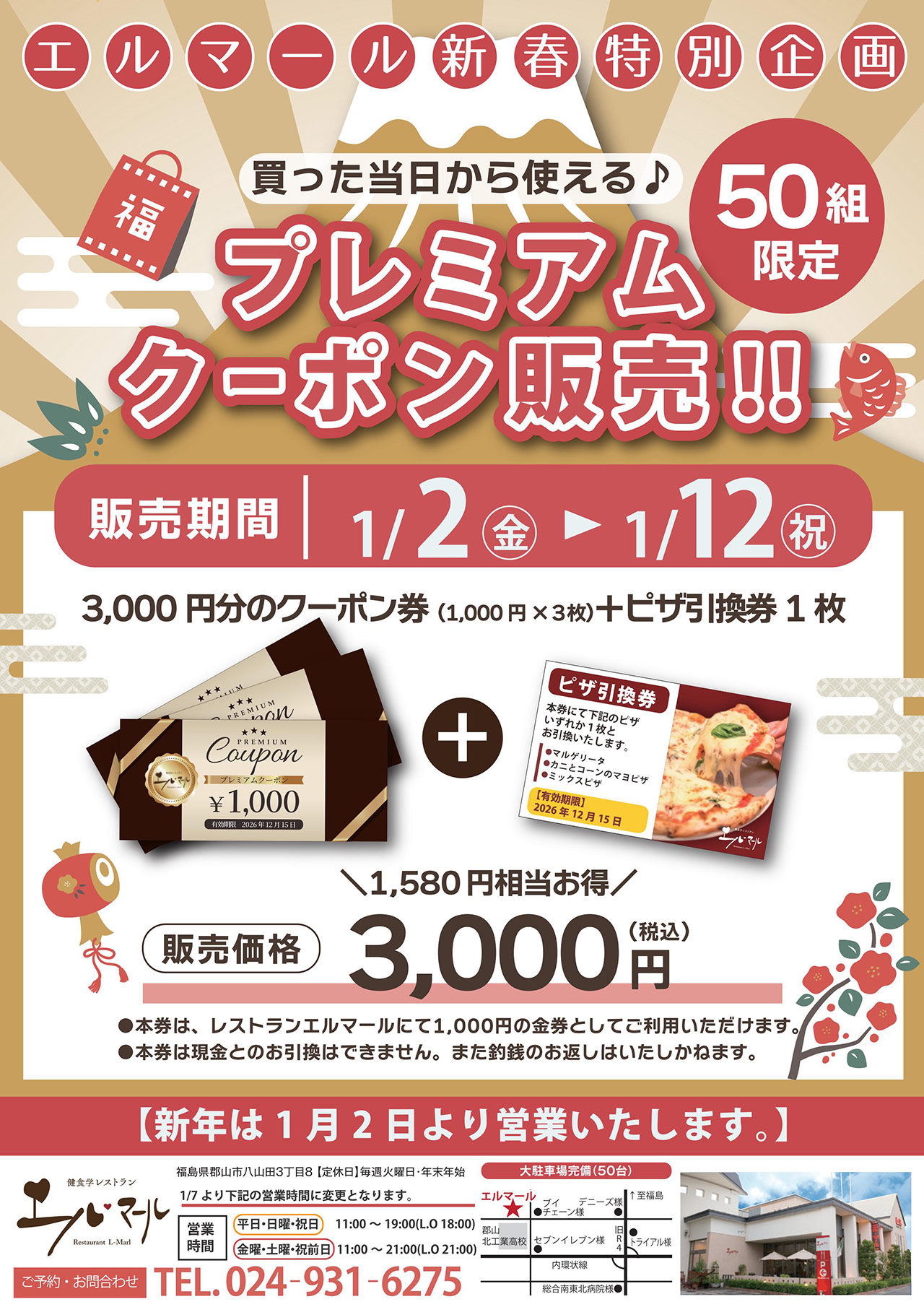 | 2025/12/26 | エルマール新春特別企画 買った当日から使える ★プレミアムクーポン販売★ 50組限定 | |