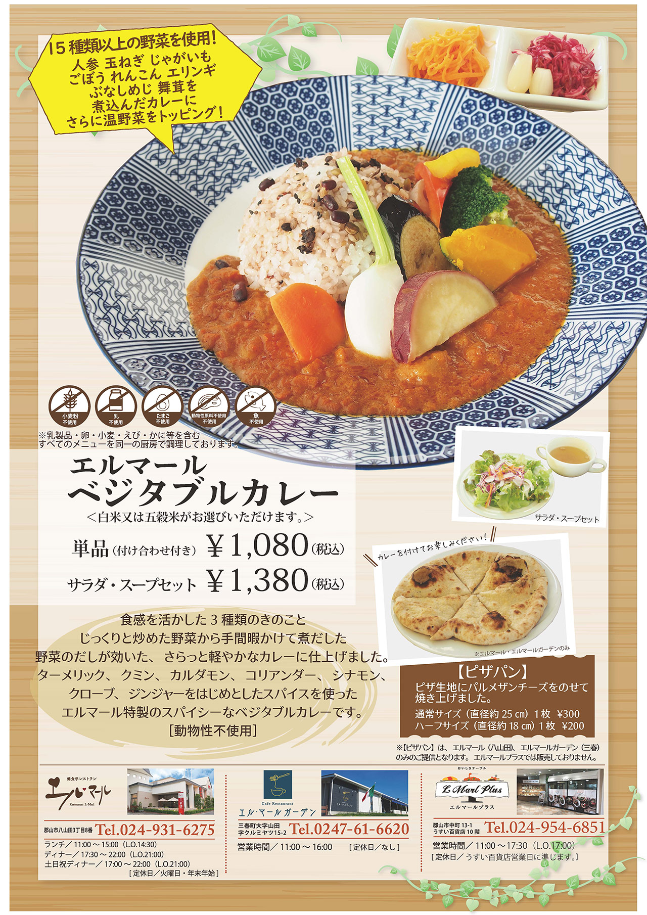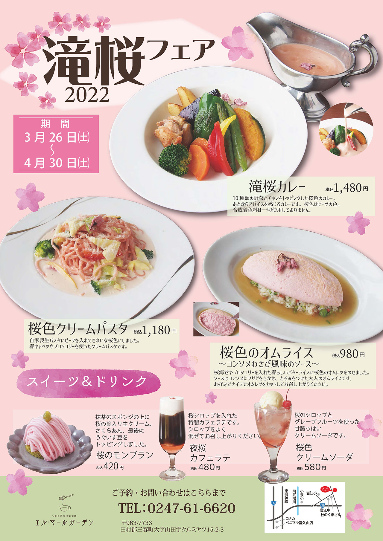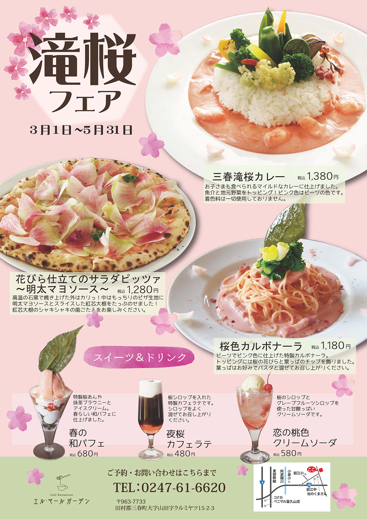 | 2019/3/8 | ★エルマールガーデン 三春滝桜カレー★ ※数に限りがあります。 | |