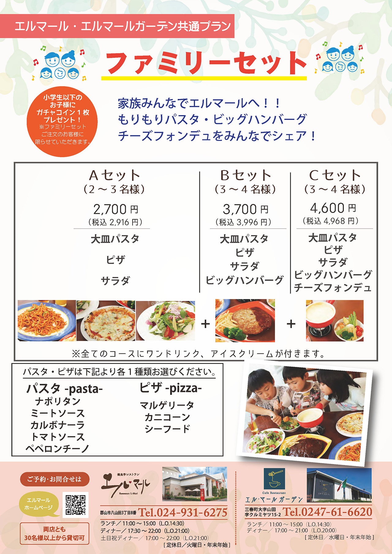 | 2019/9/1 | ★ファミリーセット★ 家族みんなでエルマールへ!!もりもりパスタ・ビッグハンバーグ・チーズフォンデュをみんなでシェア!(エルマール/エルマールガーデン) | |
