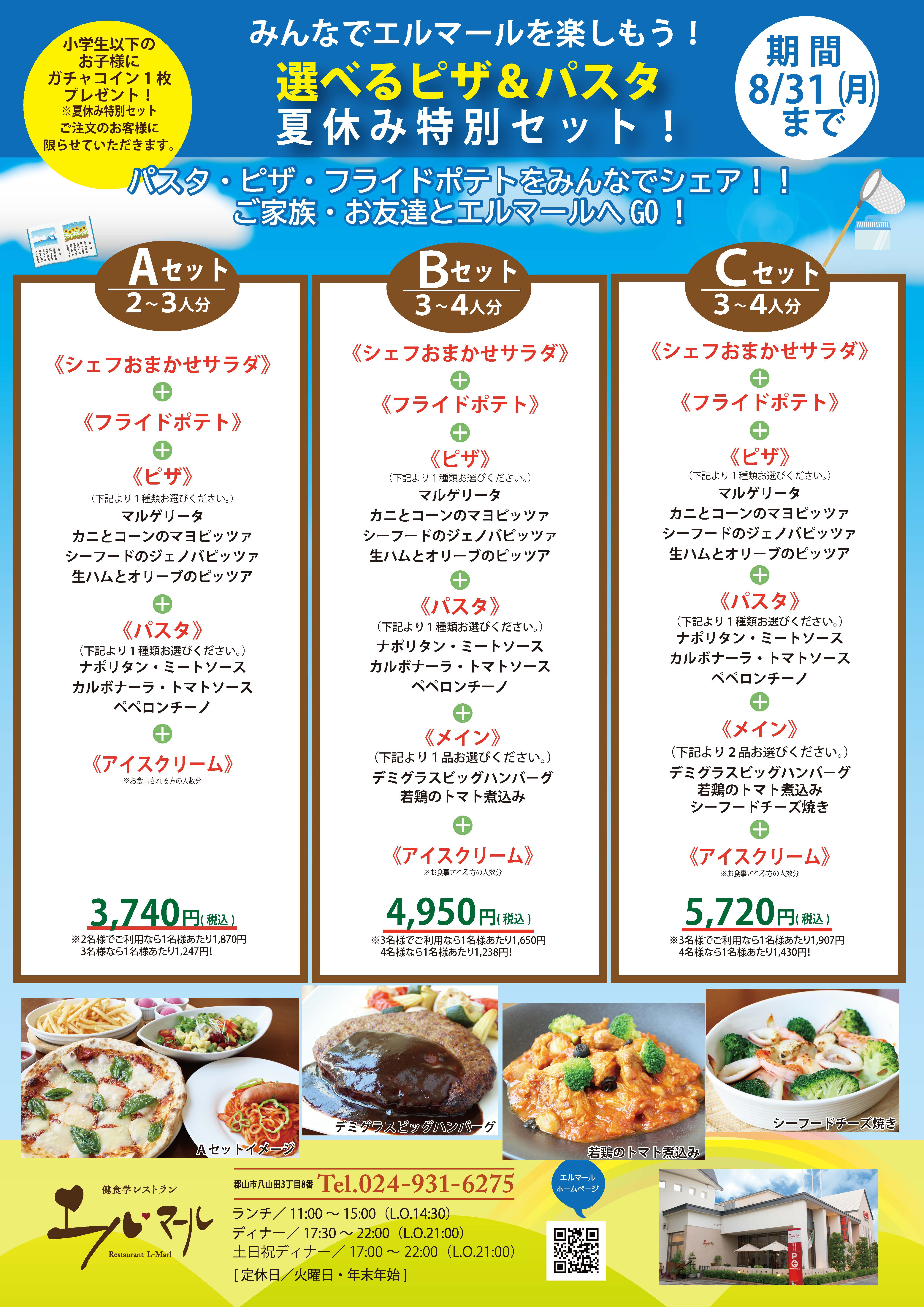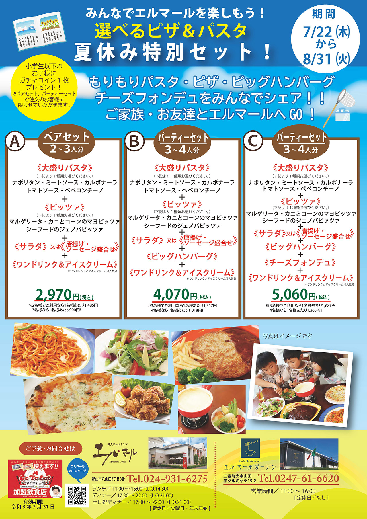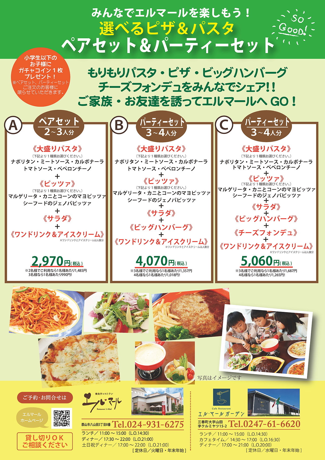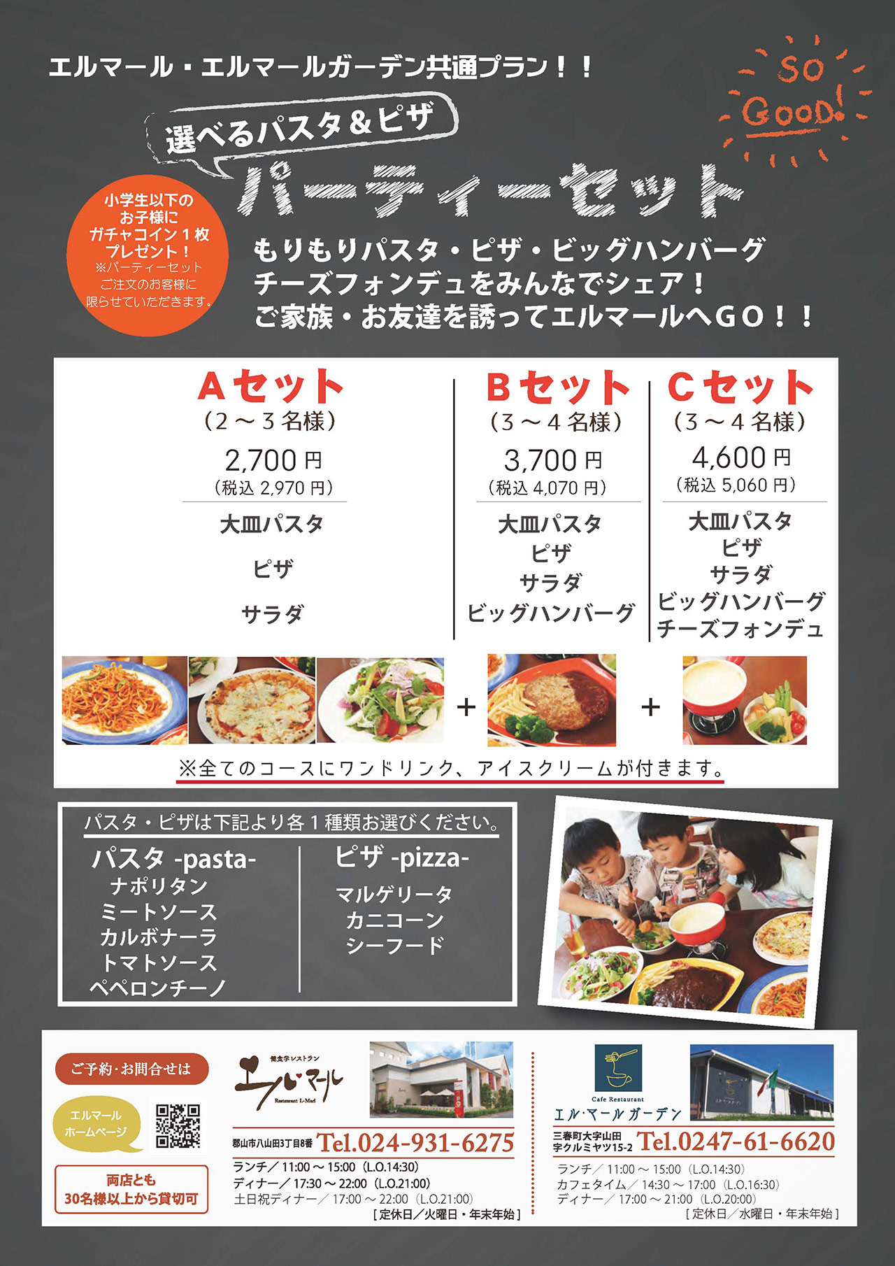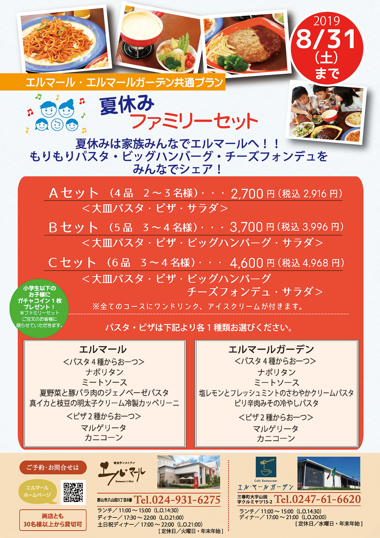 | 2019/7/29 | ★夏休みファミリーセット★ 夏休みは家族みんなでエルマールへ!!もりもりパスタ・ビッグハンバーグ・チーズフォンデュをみんなでシェア!(エルマール/エルマールガーデン) | |