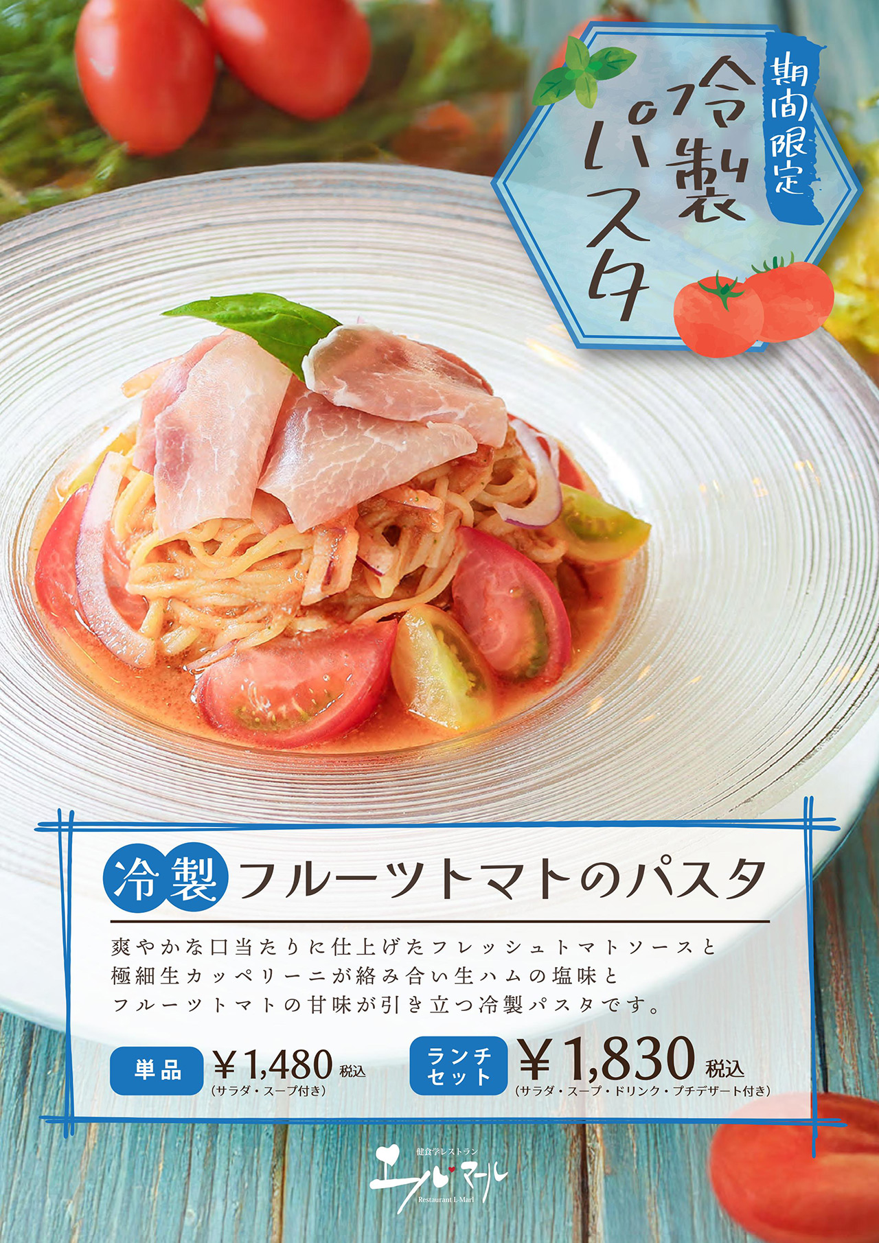 | 2025/6/28 | ★冷製 フルーツトマトのパスタ★ 爽やかなロ当たりに仕上げたフレッシュトマトソースと極細生カッペリーニが絡み合い生ハムの塩味とフルーツトマトの甘味が引き立つ冷製パスタです。 | |