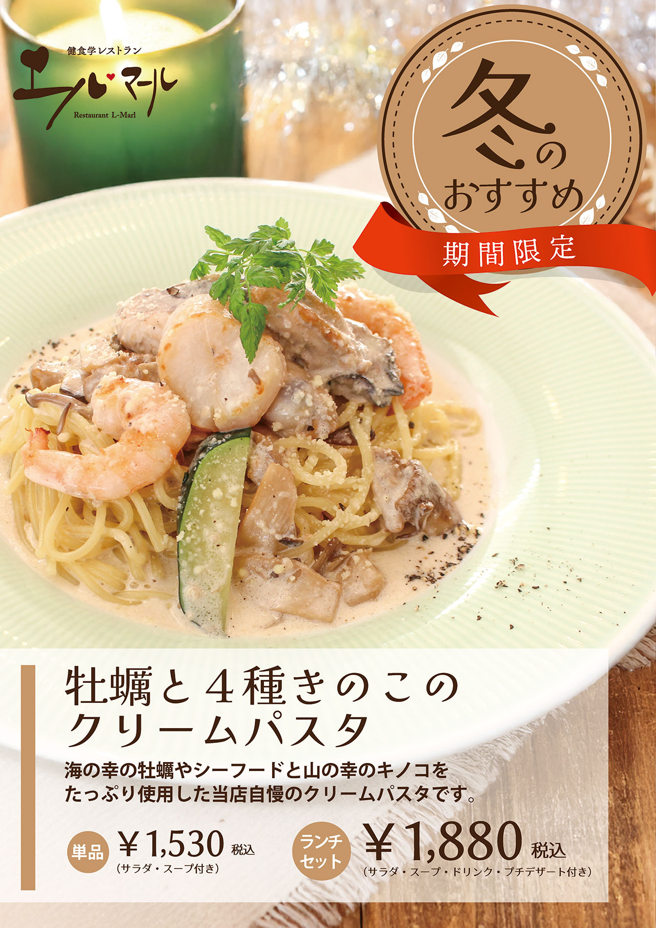 | 2024/12/5 | ★期間限定 冬のおすすめ★ 海の幸の牡蠣やシーフードと山の幸のキノコをたっぷり使用した当店自慢のクリームパスタです。 | |