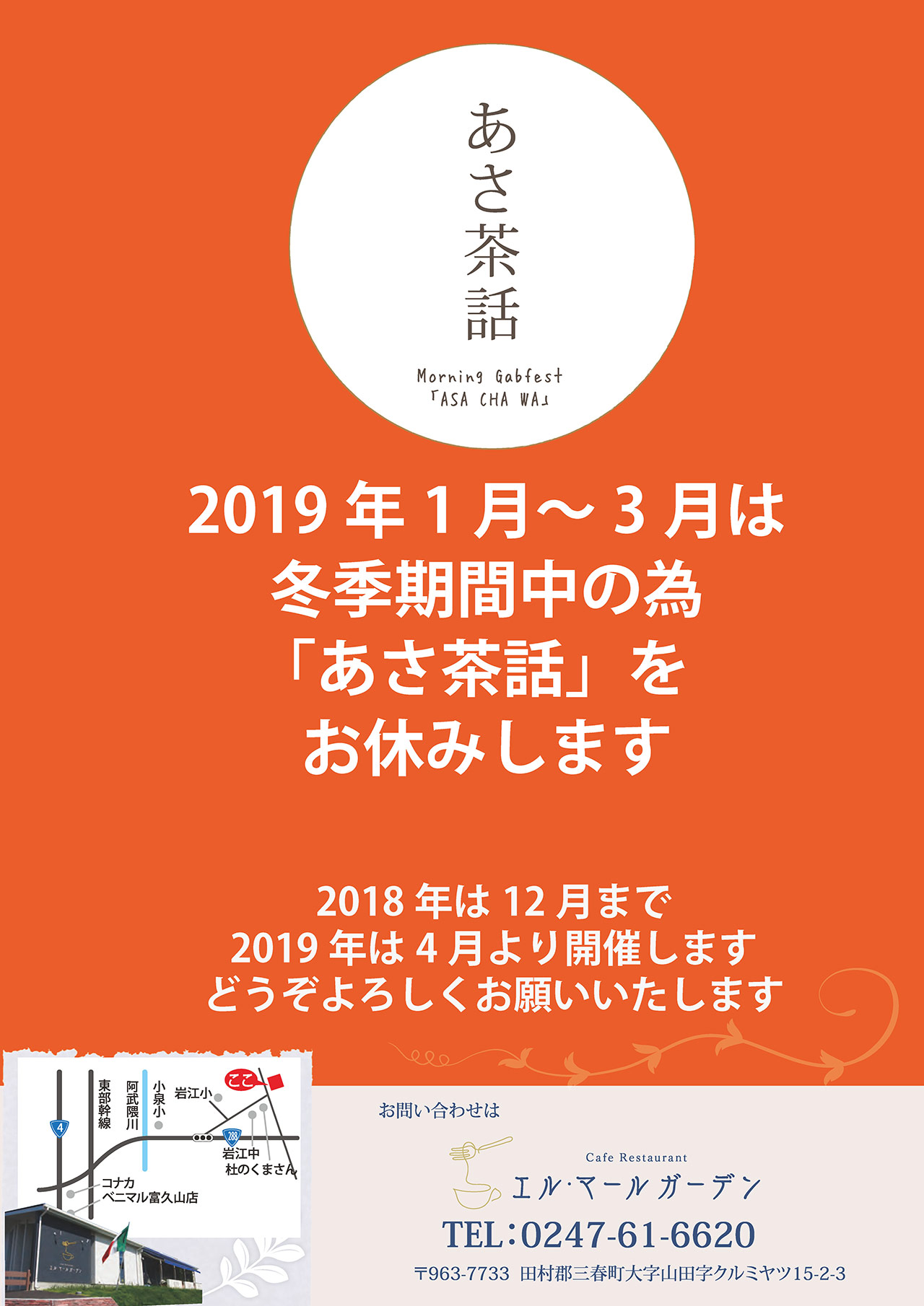 | 2018/11/20 | ★あさ茶話冬季期間中のお休みについて★ 2019年1月~3月は冬季期間中のため「あさ茶話」をお休みします。 | |