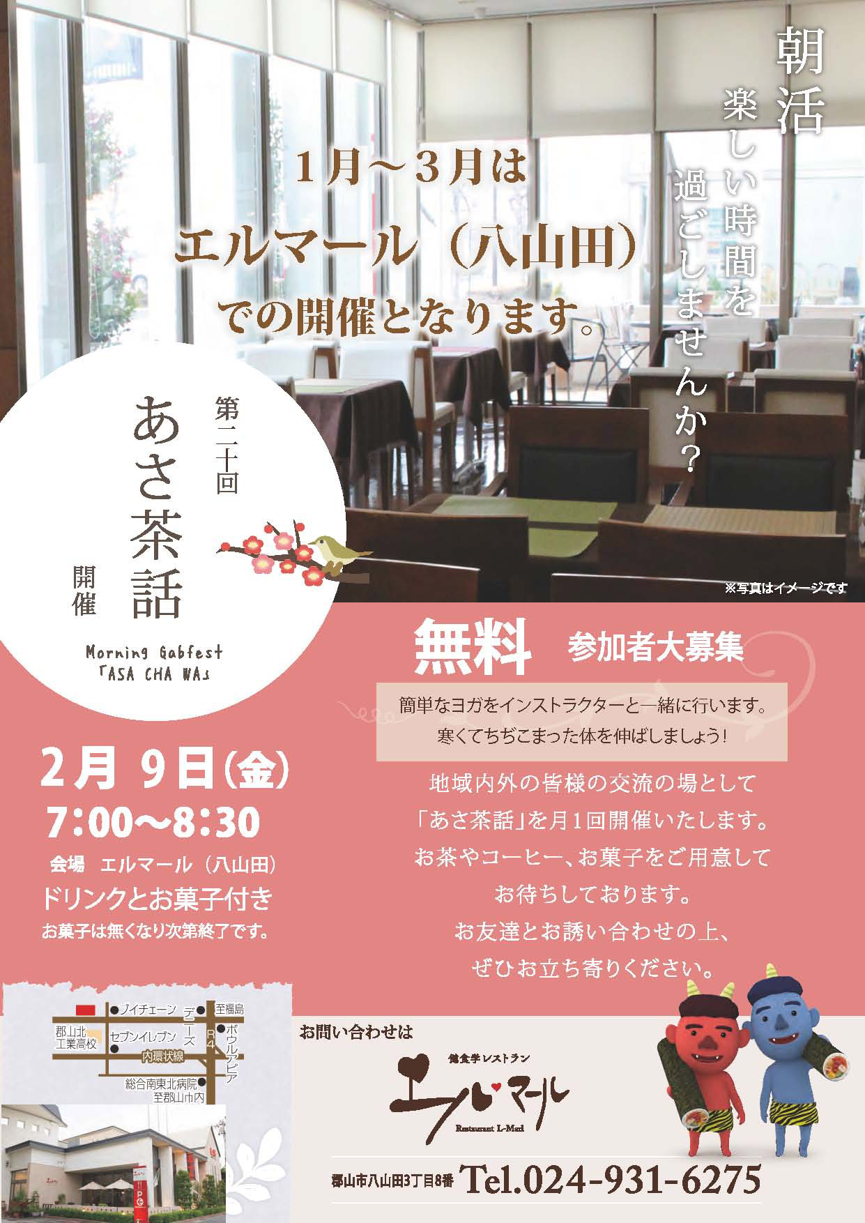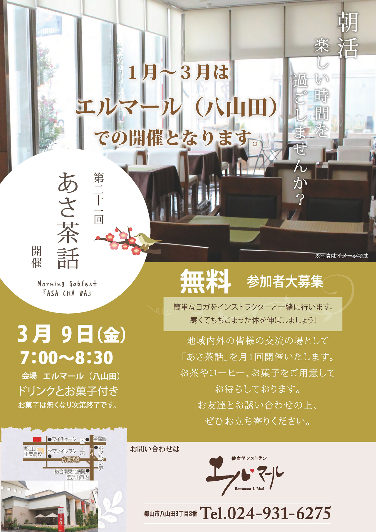 | 2018/2/13 | ★3/9 第21回 あさ茶話★ 地域内外の皆様の交流の場として「あさ茶話」を月1回開催いたします。参加無料 ドリンクとお菓子付き ※1~3月はエルマール八山田での開催となります。 | |